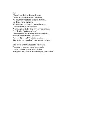 Kot Obraz kota, który skacze do góry Celem zdobycia kawałka kiełbasy Na trzymanym przez dziecko patyku… Im dłużej trwa zabawa, Wymaga się od kota, by skakał wyżej. Czasem kot nie chce skakać, A przecież na kijku tym wyborowa szynka. O ty kocie! Spotka cię kara! Uderzył chłopiec kota tym samym kijem , Którym oferował mu pyszności. Pssyt… Ej kocie! To nie tajemnica Skaczesz, by zaspokoić głód zabawy widza. Być może schab zjadasz na śniadanie. Pamiętaj w naturze masz polowanie. I choć kolacją byłaby mysz polna, Nie gardź nią. Ona w trudzie swym jest wolna. Na zawsze… W gąszczu afrykańskiej dżungli Zrodziłeś się człowiecze Wśród drzew uczyłeś się skakać By teraz w przestworzach latać I iskry krzesałeś z kamieni By wyjść z jaskini cieni Zapomniałeś już o końskim galopie Teraz samochodem jesteś na urlopie Patrzyłeś w niebo w odległe planety Teraz w kosmos latasz dla uciechy Bałeś się dzikiego zwierza Teraz w lasach trudno znaleźć drzewa Formowałeś pięściaki żelazne siekiery Potem armaty w końcu rewolwery I rodzi się znowu Żywi się Rozmnaża Rywalizuje Zabija Umiera Ecce homo – żywot powietrza Zakopane Przez pryzmat miłości Chcę spojrzeć raz jeden Na twe korale czarne Jak borówki wśród traw Chcę ujrzeć głębokość Czarnego Stawu twych źrenic Poczuć woń kwiatów Promienie słońca z wysokich Tatr Chcę odnaleźć kwiaty złociste Zagubione podczas młodzieńczych lat Dotyk twych kształtów Ich dostojeństwo smak