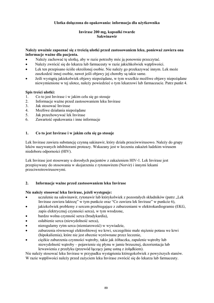 Ulotka dołączona do opakowania: informacja dla użytkownika Invirase 200 mg, kapsułki twarde Sakwinawir Należy uważnie zapoznać się z treścią ulotki przed zastosowaniem leku, ponieważ zawiera ona informacje ważne dla pacjenta. Należy zachować tę ulotkę, aby w razie potrzeby móc ją ponownie przeczytać. Należy zwrócić się do lekarza lub farmaceuty w razie jakichkolwiek wątpliwości. Lek ten przepisano ściśle określonej osobie. Nie należy go przekazywać innym. Lek może zaszkodzić innej osobie, nawet jeśli objawy jej choroby są takie same. Jeśli wystąpią jakiekolwiek objawy niepożądane, w tym wszelkie możliwe objawy niepożądane niewymienione w tej ulotce, należy powiedzieć o tym lekarzowi lub farmaceucie. Patrz punkt 4. Spis treści ulotki: 1. Co to jest Invirase i w jakim celu się go stosuje 2. Informacje ważne przed zastosowaniem leku Invirase 3. Jak stosować Invirase 4. Możliwe działania niepożądane 5. Jak przechowywać lek Invirase 6. Zawartość opakowania i inne informacje 1. Co to jest Invirase i w jakim celu się go stosuje Lek Invirase zawiera substancję czynną sakinawir, który działa przeciwwirusowo. Należy do grupy leków nazywanych inhibitorami proteazy. Wskazany jest w leczeniu zakażeń ludzkim wirusem niedoboru odporności (HIV). Lek Invirase jest stosowany u dorosłych pacjentów z zakażeniem HIV-1. Lek Invirase jest przepisywany do stosowania w skojarzeniu z rytonawirem (Norvir) i innymi lekami przeciwretrowirusowymi. 2. Informacje ważne przed zastosowaniem leku Invirase Nie należy stosować leku Invirase, jeżeli występuje: uczulenie na sakwinawir, rytonawir lub którykolwiek z pozostałych składników (patrz „Lek Invirase zawiera laktozę” w tym punkcie oraz “Co zawiera lek Invirase” w punkcie 6), jakiekolwiek problemy z sercem przebiegające z zaburzeniami w elektrokardiogramie (EKG, zapis elektrycznej czynności serca), w tym wrodzone, bardzo wolna czynność serca (bradykardia), osłabienie serca (niewydolność serca), nieregularny rytm serca (niemiarowość) w wywiadzie, zaburzenia równowagi elektrolitowej we krwi, szczególnie małe stężenie potasu we krwi (hipokaliemia), które nie jest obecnie wyrównane przez leczenie, ciężkie zaburzenia czynności wątroby, takie jak żółtaczka, zapalenie wątroby lub niewydolność wątroby – pojawienie się płynu w jamie brzusznej, dezorientacja lub krwawienia z przełyku (przewód łączący jamę ustną z żołądkiem). Nie należy stosować leku Invirase w przypadku wystąpienia któregokolwiek z powyższych stanów. W razie wątpliwości należy przed zażyciem leku Invirase zwrócić się do lekarza lub farmaceuty. 89 Nie należy stosować leku Invirase w przypadku zażywania następujących leków: Jakiekolwiek leki, które mogą zmieniać czynność serca, takie jak: niektóre leki przeciwko wirusowi HIV, takie jak: atazanawir, lopinawir, niektóre leki stosowane w chorobach serca - amiodaron, beprydyl, dyzopiramid, dofetylid, flekainid, hydrochinidyna, ibutylid, lidokaina, propafenon, chinidyna, sotalol, niektóre leki stosowane w depresji - amitryptylina, imipramina, trazodon, maprotylina, leki stosowane w innych ciężkich zaburzeniach psychicznych - takie jak: klozapina, haloperydol, mezorydazyna, pochodne fenotiazyny, sertyndol, sultopryd, tiorydazyna, zyprazydon, niektóre leki stosowane w zakażeniach, takie jak: klarytromycyna, dapson, erytromycyna, halofantryna, pentamidyna, sparfloksacyna, niektóre silne leki przeciwbólowe (opioidowe) - takie jak alfentanyl, fentanyl, metadon, leki stosowane w zaburzeniach erekcji - syldenafil, wardenafil, tadalafil, niektóre leki stosowane z innych powodów: cyzapryd, dyfemanil, mizolastyna, chinina, winkamina. niektóre leki stosowane w zapobieganiu odrzucenia przeszczepu po transplantacji narządu, takie jak takrolimus. Którykolwiek z poniższych leków: terfenadyna i astemizol - często stosowane w leczeniu objawów uczulenia, pimozyd - stosowany w ciężkich zaburzeniach psychicznych, alkaloidy sporyszu - stosowane w napadach migreny, triazolam i midazolam (doustnie stosowane) - ułatwiające zasypianie lub stosowane w stanach niepokoju, ryfampicyna – stosowana w zapobieganiu lub leczeniu gruźlicy, symwastatyna i lowastatyna – stosowane w celu zmniejszenia stężenia cholesterolu we krwi, kwetiapina – stosowana w leczeniu schizofrenii, choroby dwubiegunowej oraz ciężkich zaburzeń depresjnych. Nie należy stosować leku Invirase z żadnym innym lekiem, jeśli nie zostało to wcześniej ustalone z lekarzem. Wymienione powyżej leki mogą spowodować wystąpienie poważnych działań niepożądanych, jeśli będą zażywane z lekiem Invirase. Nie należy stosować leku Invirase w przypadku wystąpienia któregokolwiek z powyższych stanów. W razie wątpliwości należy przed zażyciem leku Invirase zwrócić się do lekarza lub farmaceuty. Ostrzeżenia i środki ostrożności Lek Invirase w skojarzeniu z rytonawirem nie zapewnia wyleczenia zakażenia HIV. U pacjentów w dalszym ciągu mogą rozwijać się zakażenia i inne choroby związane z zakażeniem HIV. Dlatego podczas stosowania leku Invirase z rytonawirem pacjenci muszą pozostawać pod opieką lekarza. Pacjent nadal może przenosić wirusa HIV podczas stosowania tego leku, pomimo, że skuteczna terapia przeciwretrowirusowa zmniejsza to ryzyko. Pacjent powinien omówić z lekarzem środki ostrożności konieczne w celu uniknięcia zakażania innych osób. Obecnie nie ma wystarczających informacji dotyczących stosowania leku Invirase w skojarzeniu z rytonawirem u dzieci oraz u dorosłych w wieku powyżej 60 lat. Zaburzenia rytmu serca (arytmia) Lek Invirase może wpływać na czynność serca – może to mieć poważny skutek. Może to wystąpić, zwłaszcza u kobiet lub osób w podeszłym wieku. Przed zastosowaniem leku Invirase należy powiedzieć lekarzowi o przyjmowaniu jakiegokolwiek leku, który zmniejsza stężenie pot