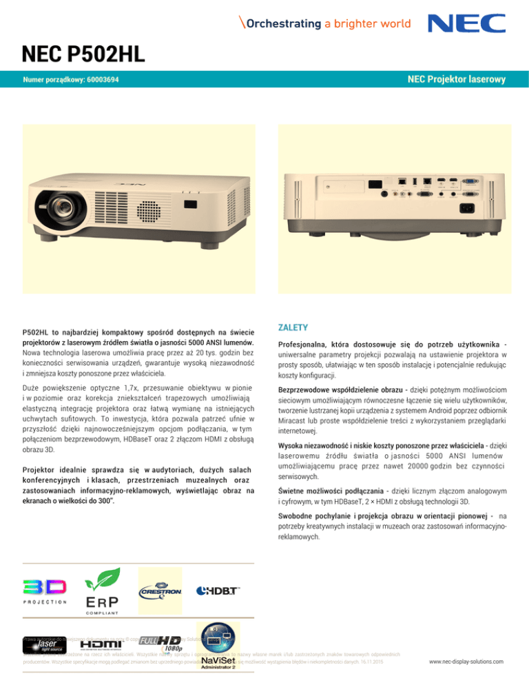 NEC P502HL NEC Projektor laserowy Numer porządkowy: 60003694 P502HL to najbardziej kompaktowy spośród dostępnych na świecie projektorów z laserowym źródłem światła o jasności 5000 ANSI lumenów. Nowa technologia laserowa umożliwia pracę przez aż 20 tys. godzin bez konieczności serwisowania urządzeń, gwarantuje wysoką niezawodność i zmniejsza koszty ponoszone przez właściciela. Duże powiększenie optyczne 1,7x, przesuwanie obiektywu w pionie i w poziomie oraz korekcja zniekształceń trapezowych umożliwiają elastyczną integrację projektora oraz łatwą wymianę na istniejących uchwytach sufitowych. To inwestycja, która pozwala patrzeć ufnie w przyszłość dzięki najnowocześniejszym opcjom podłączania, w tym połączeniom bezprzewodowym, HDBaseT oraz 2 złączom HDMI z obsługą obrazu 3D. Projektor idealnie sprawdza się w audytoriach, dużych salach konferencyjnych i klasach, przestrzeniach muzealnych oraz zastosowaniach informacyjno-reklamowych, wyświetlając obraz na ekranach o wielkości do 300”. ZALETY Profesjonalna, która dostosowuje się do potrzeb użytkownika uniwersalne parametry projekcji pozwalają na ustawienie projektora w prosty sposób, ułatwiając w ten sposób instalację i potencjalnie redukując koszty konfiguracji. Bezprzewodowe współdzielenie obrazu - dzięki potężnym możliwościom sieciowym umożliwiającym równoczesne łączenie się wielu użytkowników, tworzenie lustrzanej kopii urządzenia z systemem Android poprzez odbiornik Miracast lub proste współdzielenie treści z wykorzystaniem przeglądarki internetowej. Wysoka niezawodność i niskie koszty ponoszone przez właściciela - dzięki laserowemu źródłu światła o jasności 5000 ANSI lumenów umożliwiającemu pracę przez nawet 20000 godzin bez czynności serwisowych. Świetne możliwości podłączania - dzięki licznym złączom analogowym i cyfrowym, w tym HDBaseT, 2 × HDMI z obsługą technologii 3D. Swobodne pochylanie i projekcja obrazu w orientacji pionowej - na potrzeby kreatywnych instalacji w muzeach oraz zastosowań informacyjnoreklamowych. Prawa autorskie do niniejszego dokumentu są przy © copyright 2015 NEC Display Solutions Europe GmbH. Wszelkie prawa zastrzeżone na rzecz ich właścicieli. Wszystkie nazwy sprzętu i oprogramowania to nazwy własne marek i/lub zastrzeżonych znaków towarowych odpowiednich producentów. Wszystkie specyfikacje mogą podlegać zmianom bez uprzedniego powiadamiania. Zastrzega się możliwość wystąpienia błędów i niekompletności danych. 16.11.2015 www.nec-display-solutions.com NEC P502HL - Dane techniczne Technologia projekcji 1-chip DLP™ Technology Rozdzielczość natywna 1920 x 1080 (Full HD) Proporcje obrazu 16:9 Kontrast 1 15000:1 Jasność 1 5000 ANSI Lumenów Moc lampy Laserowe źródło światła Żywotność lampy [godz] 20000 Obiektyw F= 2–2,5, f= 18,2–31,1 mm Przesuwanie obiektywu H:±0.25, V:+0.62,-0 Przesunięcie obiektywu [%] 0-62 Korekcja zniekształceń trapezowych +/-25° w poziomie (ręcznie) / +/-30° w pionie (ręcznie) Współczynnik projekcji 1.24 – 2.1 : 1 Odległość projekcji [m] 0.8 – 14.2 Wielkość (przekątna) ekranu [cm] / [cale] Maksymalnie: 762 / 300"; Minimalnie: 76,2 / 30" Zoom Ręczny; x1.7 Ustawienie ostrości Ręczne Obsługiwane rozdzielczości 1920 x 1200 (Maksymalna rozdzielczość wejścia analogowego); 1920 x 1080 (Maximum resolution of digital input) Częstotliwość Pionowa: 50 – 120 Hz; Pozioma: 15–100 kHz (RGB: 24 kHz) Komputer (analogowe) Wejście: 1 x Mini D-sub 15 pin Wyjście: 1 x Mini D-sub 15 pin Cyfrowe Wejście: 1 x HDBaseT; 2 x HDMI™ z obsługą HDCP Sygnał video Wejście: 1 x RCA Audio Wejście: 1 x 3.5 mm wejście Stereo Mini Jack; 1 x RCA Stereo for Video; 2 x HDMI audio Wyjście: 1 x 3.5 mm Stereo Mini Jack (variable) Control Wejście: 1 x D-Sub 9 pin (RS-232) (męskie) LAN 1 x RJ45; Opcjonalne złącze WLAN USB 1 x Typ B (serwisowe); 2 x Type A (USB 2.0 high speed) 3D Sync Wyjście: 1 x Mini DIN (złącze 3-pinowe) Video NTSC 3.58; NTSC 4.43; PAL; PAL-M; PAL-N; PAL60; SECAM FUNKCJE PILOTA Funkcje pilota Automatyczne dostosowanie geometrii obrazu; Dostosowanie obrazu; funkcja lupy; funkcja stop klatki; Help-function; Kontrola audio; Korekcja efektu trapezowego; Nawigacja (góra, dół, lewy, prawy); Numer ID; Picture Mute; Power (On-OFF); Prezentacja i sterowanie myszką; Proporcje obrazu; Sterowanie trybem ECO; Strona (następna, poprzednia); Wybór żródła sygnału PARAMETRY ELEKTRYCZNE Zasilanie 100-240 V AC; 50 - 60 Hz Pobór mocy [W] 442 (tryb wysokiej jasności) / 347 (tryb eko) / 2 (tryb czuwania z obsługą sieci) / 0,3 (tryb czuwania) Wymiary [mm] 469 x 137 x 365 (bez nóżek i obiektywu) Waga [kg] 8.8 Poziom szumu [dB (A)] 31 / 39 (Eco / Normal) Bezpieczeństwo i ergonomia CE; ErP; RoHS; TÜV GS Głośniki [W] 1 x 20 (mono) DODATKOWE FUNKCJE Cechy Specjalne Automatyczny start i automatyczne wyłączanie; Blokada klawiszy OSD; Funkcja Direct Power-Off; Funkcja identyfikatora sterowania (Control ID); Funkcja lupy; Funkcja wirtualnego pilota; Funkcja wyświetlania przez USB wraz z sygnałem audio; Funkcja zegara; Gniazdo zabezpieczające typu K-Slot; Help Function; Licznik Carbon savings; Menu OSD w 27 językach; Miracast Connectivity; Możliwość wyświetlania plików bezpośrednio z pamięci FLASH; MultiPresenter Function; NaViSet Administrator 2; Opcjalane logo użytkownika; Opcjonalna sieć W-LAN typu Plug&Play; Plansza kontrolna; Programowa korekcja geometrii; Regulacja źródła światła; Ręczna regulacja kompensacji koloru ściany; Sterowanie myszą dzięki funkcji wyświetlania przez USB (USB Display); Sterowanie przez przeglądarkę WWW; Symulacja standardu DICOM; Szybki start; Timer czasu wyłączenia; Tryb stałej jasności; Unikalne funkcje ograniczenia poboru energii; Wybór wejścia sygnału; Zabezpieczenie hasłem GREEN FEATURES Materiały ekologiczne Instrukcje do pobrania w wersji elektronicznej; O