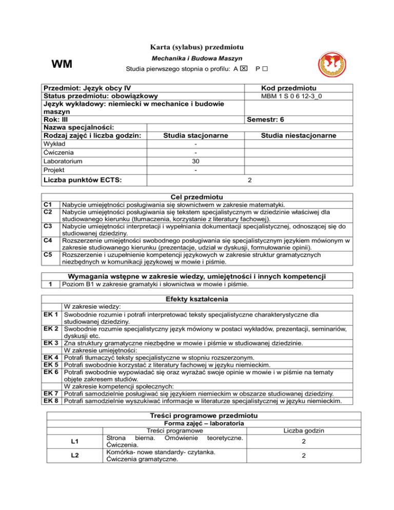 Karta (sylabus) przedmiotu Mechanika i Budowa Maszyn WM P□ Studia pierwszego stopnia o profilu: A Przedmiot: Język obcy IV Status przedmiotu: obowiązkowy Język wykładowy: niemiecki w mechanice i budowie maszyn Rok: III Nazwa specjalności: Rodzaj zajęć i liczba godzin: Studia stacjonarne Wykład Ćwiczenia Laboratorium Projekt Kod przedmiotu MBM 1 S 0 6 12-3_0 Semestr: 6 Studia niestacjonarne 30 - Liczba punktów ECTS: 2 Cel przedmiotu C1 C2 C3 C4 C5 Nabycie umiejętności posługiwania się słownictwem w zakresie matematyki. Nabycie umiejętności posługiwania się tekstem specjalistycznym w dziedzinie właściwej dla studiowanego kierunku (tłumaczenia, korzystanie z literatury fachowej). Nabycie umiejętności interpretacji i wypełniania dokumentacji specjalistycznej, odnoszącej się do studiowanej dziedziny. Rozszerzenie umiejętności swobodnego posługiwania się specjalistycznym językiem mówionym w zakresie studiowanego kierunku (prezentacje, udział w dyskusji, formułowanie opinii). Rozszerzenie i uzupełnienie kompetencji językowych w zakresie struktur gramatycznych niezbędnych w komunikacji językowej w mowie i piśmie. Wymagania wstępne w zakresie wiedzy, umiejętności i innych kompetencji 1 Poziom B1 w zakresie gramatyki i słownictwa w mowie i piśmie. Efekty kształcenia EK 1 EK 2 EK 3 EK 4 EK 5 EK 6 EK 7 EK 8 W zakresie wiedzy: Swobodnie rozumie i potrafi interpretować teksty specjalistyczne charakterystyczne dla studiowanej dziedziny. Swobodnie rozumie specjalistyczny język mówiony w postaci wykładów, prezentacji, seminariów, dyskusji etc. Zna struktury gramatyczne niezbędne w mowie i piśmie w studiowanej dziedzinie. W zakresie umiejętności: Potrafi tłumaczyć teksty specjalistyczne w stopniu rozszerzonym. Potrafi swobodnie korzystać z literatury fachowej w języku niemieckim. Potrafi swobodnie wypowiadać się oraz wyrażać swoje opinie w mowie i w piśmie na tematy objęte zakresem studiów. W zakresie kompetencji społecznych: Potrafi samodzielnie posługiwać się językiem niemieckim w obszarze studiowanej dziedziny. Potrafi samodzielnie wyszukiwać informacje w literaturze specjalistycznej w języku niemieckim. Treści programowe przedmiotu L1 L2 Forma zajęć – laboratoria Treści programowe Strona bierna. Omówienie teoretyczne. Ćwiczenia. Komórka- nowe standardy- czytanka. Ćwiczenia gramatyczne. Liczba godzin 2 2 L3 L4 L5 L6 L7 L8 L9 L10 L11 L12 L13 L14 L15 GSM- czytanka. Strona bierna. Ćwiczenia. Przyszłość komórek- dialogi. Strona bierna. Ćwiczenia. UMTS- czytanka. Ćwiczenia gramatyczne. UMTS- dialogi. Ćwiczenia w mówieniu. GPRS- czytanka. Strona bierna z „man.” Powtórzenie wiadomości. Sprawdzian wiadomości. Nowa Fiesta- czytanka. Ćwiczenia gramatyczne. Środki transportu- słownictwo. Samochody osobowe i ciężarowe- czytanka. Samochody osobowe i ciężarowe- czytanka. Sprawdzian wiadomości. Podsumowanie wyników nauczania w semestrze VI oraz całości lektoratu. Suma godzin: 2 2 2 2 2 2 2 2 2 2 2 2 2 30 Narzędzia dydaktyczne 1 2 3 Ćwiczenia audytoryjne Konwersatoria Translatoria Sposoby oceny Ocena formująca F1 F2 Ocena bieżąca Sprawdzian wiadomości P1 P2 Ocena podsumowująca Zaliczenie poprzedniego semestru Egzamin Obciążenie pracą studenta Forma aktywności Godziny kontaktowe z wykładowcą, realizowane w formie zajęć dydaktycznych – łączna liczba godzin w semestrze Godziny kontaktowe z wykładowcą, realizowane w formie konsultacji oraz egzaminu – łączna liczba godzin w semestrze Przygotowanie się do zajęć – łączna liczba godzin w semestrze Suma Sumaryczna liczba punktów ECTS dla przedmiotu Średnia liczba godzin na zrealizowanie aktywności 30 4 16 50 2 Literatura podstawowa i uzupełniająca 1 2 3 4 5 A. Dębski, S. Dzida Deutsch fuer Mathematiker und Physiker Wiedza Powszechna D. Guzik Alles digital... Skrypt Politechniki Krakowskiej Tekste feur Studenten der Fachbereiche Wolfgang Hieber Lernziel Deutsch Grundstufe 1, 2 J. Buscha Deutsches Uebungsbuch Macierz efektów kształcenia Efekt kształcenia Odniesienie danego efektu kształcenia do efektów zdefiniowanych Cele przedmiotu Treści programowe Narzędzia dydaktyczne Sposób oceny EK 1 EK 2 EK 3 EK 4 EK 5 EK 6 EK 7 EK 8 dla całego programu (PEK) MT1A_U01+ MT1A_U04+ MT1A_U05+++ MT1A_U19+ MT1A_U01+ MT1A_U04+ MT1A_U05+++ MT1A_U19+ MT1A_U01+ MT1A_U04+ MT1A_U05+++ MT1A_U19+ MT1A_U01+ MT1A_U04+ MT1A_U05+++ MT1A_U19+ MT1A_U01+ MT1A_U04+ MT1A_U05+++ MT1A_U19+ MT1A_U01+ MT1A_U04+ MT1A_U05+++ MT1A_U19+ MT1A_K01+ MT1A_K05+ MT1A_K01+ MT1A_K05+ C1, C2, C3, C5 L1-L15 1,2,3 F1, F2, P1, P2 C1, C4, C5 L1-L15 1,2,3 F1, F2, P1, P2 C2, C3, C5 L1-L15 1,2,3 F1, F2, P1, P2 C1, C2, C3, C5 L1-L15 1,2,3 F1, F2, P1, P2 C1, C2, C3, C5 L1-L15 1,2,3 F1, F2, P1, P2 C1, C4, C5 L1-L15 1,2,3 F1, P1, P2 L1-L15 1,2,3 F1, F2, P1, P2 L1-L15 1,2,3 F1, F2, P1, P2 C1, C2, C3, C4, C5 C1, C2, C3, C5 Formy oceny – szczegóły EK 1 EK 2 EK 3 EK 4 EK 5 Na ocenę 2 (ndst) Na ocenę 3 (dst) Na ocenę 4 (db) Nie zna podstawowego słownictwa w zakresie omawianych tematów. Nie rozumie specjalistycznego języka mówionego. Zna podstawowe słownictwo w zakresie omawianych tematów. W ograniczonym zakresie rozumie słownictwo specjalistyczne. Posiada szeroki zakres słownictwa specjalistycznego. Nie ma żadnych problemów w rozumieniu specjalistycznego słownictwa. Nie potrafi budować podstawowych konstrukcji gramatycznych w mowie i w piśmie. W podstawowym zakresie potrafi posługiwać się podstawowymi konstrukcjami gramatycznymi w mowie i w piśmie. Potrafi tłumaczyć proste teksty specjalistyczne. Posiada większy zasób słownictwa specjalistycznego. Nie ma większych problemów w rozumieniu specjalistycznego słownictwa. Potrafi posługiwać się bardziej złożonymi konstrukcjami gramatycznymi w mowie i w piśmie. Potrafi tłumaczyć teksty specjalistyczne o większym stopniu trudności. Potrafi posługiwać się bardziej skomplikowanymi tekstami w literaturz