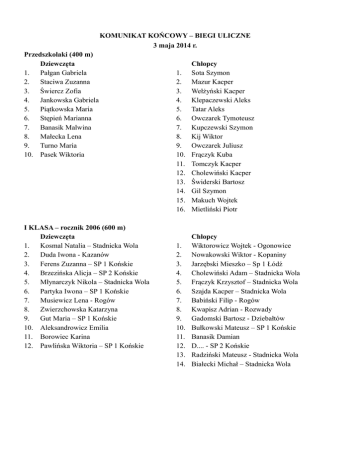 KOMUNIKAT KOŃCOWY – BIEGI ULICZNE 3 maja 2014 r. Przedszkolaki (400 m) Dziewczęta 1. Pałgan Gabriela 2. Staciwa Zuzanna 3. Świercz Zofia 4. Jankowska Gabriela 5. Piątkowska Maria 6. Stępień Marianna 7. Banasik Malwina 8. Małecka Lena 9. Turno Maria 10. Pasek Wiktoria I KLASA – rocznik 2006 (600 m) Dziewczęta 1. Kosmal Natalia – Stadnicka Wola 2. Duda Iwona - Kazanów 3. Ferens Zuzanna – SP 1 Końskie 4. Brzezińska Alicja – SP 2 Końskie 5. Młynarczyk Nikola – Stadnicka Wola 6. Partyka Iwona – SP 1 Końskie 7. Musiewicz Lena - Rogów 8. Zwierzchowska Katarzyna 9. Gut Maria – SP 1 Końskie 10. Aleksandrowicz Emilia 11. Borowiec Karina 12. Pawlińska Wiktoria – SP 1 Końskie 1. 2. 3. 4. 5. 6. 7. 8. 9. 10. 11. 12. 13. 14. 15. 16. Chłopcy Sota Szymon Mazur Kacper Wełżyński Kacper Klepaczewski Aleks Tatar Aleks Owczarek Tymoteusz Kupczewski Szymon Kij Wiktor Owczarek Juliusz Frączyk Kuba Tomczyk Kacper Cholewiński Kacper Świderski Bartosz Gil Szymon Makuch Wojtek Mietliński Piotr 1. 2. 3. 4. 5. 6. 7. 8. 9. 10. 11. 12. 13. 14. Chłopcy Wiktorowicz Wojtek - Ogonowice Nowakowski Wiktor - Kopaniny Jarzębski Mieszko – Sp 1 Łódź Cholewiński Adam – Stadnicka Wola Frączyk Krzysztof – Stadnicka Wola Szajda Kacper – Stadnicka Wola Babiński Filip - Rogów Kwapisz Adrian - Rozwady Gadomski Bartosz - Dziebałtów Bułkowski Mateusz – SP 1 Końskie Banasik Damian D.... - SP 2 Końskie Radziński Mateusz - Stadnicka Wola Białecki Michał – Stadnicka Wola II KLASA – rocznik 2005 (600 m) Dziewczęta 1. Smołuch Sylwia - Dziebałtów 2. Sękowska Maja – Stadnicka Wola 3. Walczyk Nikola - Rogów 4. Makuch Klaudia - Kazanów 5. Sota Marta – Stadnicka Wola 6. Zamachowska Wiktoria – SP 1 Końskie 7. Mietlińska Zuzanna – Stadnicka Wola 8. Stąpor Marta – Stadnicka Wola 9. Gałowiaczek Ewa – SP 1 Końskie 10. Milcarz Marta - Rogów III KLASA – rocznik 2004 (600 m) Dziewczęta 1. Frączyk Zofia – Stadnicka Wola 2. Małecka Oliwia – SP 2 Końskie 3. Armada Wiktoria - Rogów 4. Kucharska Justyna – Stadnicka Wola 5. Sielezin Maja – Stadnicka Wola 6. Mokwińska Zuzanna – SP 2 Końskie 7. Wilk Martna – SP 1 Końskie 8. Młodzińska Julia – SP 2 Końskie 9. Michałowska Anna – SP 1 Końskie 10. Szejna Maria – SP 2 Końskie 11. Nowakowska Krysia – SP 2 Końskie 12. Świtoń Nikola – SP 2 Końskie 13. Klepaczewska Sara – SP 1 Końskie IV KLASA – rocznik 2003 (600 m) Dziewczęta 1. Tatar Oliwia - Rogów 2. Szmit Patrycja - Modliszewice 3. Czechowska Anna – Ruda Maleniecka 4. Mazur Daria – SP 2 Końskie 5. Zamachowska Patrycja - Kopaniny 6. Sękowska Zuzanna – Stadnicka Wola 7. Duda Wiktoria - Kazanów 8. Cholewińska Ewa – Stadnicka Wola 9. Brzoza Daria – SP 2 Końskie 10. Wywiura Weronika 11. Kucharska Marta - Rogów 12. Janikiewicz Katarzyna – Ruda Maleniecka 13. Kaczor Dorota – Ruda Maleniecka 14. Bartosińska Alicja 15. Spiżewska Zuzanna 1. 2. 3. 4. 5. 6. 7. 8. 9. Chłopcy Wilk Mateusz - Modliszewice Doniecki Mikołaj – SP 2 Końskie Zachura Jakub - Pomyków Cholewa Dominik – SP 2 Końskie Marczewski Daniel – SP 2 Końskie Świderski Szymon – SP 2 Końskie Świercz Filip – Stadnicka Wola Borkowski Filip – SP 1 Końskie Mularczyk Mikołaj – Stadnicka Wola 1. 2. 3. 4. 5. 6. 7. Chłopcy Musielewicz Konrad - Rogów Matjasik Maciej – SP 1 Końskie Gula Piotr - Dziebałtów Zamachowski Dawid - Kopaniny Muszyński Paweł - Łódź Trojanowski Andrzej – SP 1 Kóńskie Laszczyk Mikołaj - Modliszewice 1. 2. 3. 4. 5. 6. 7. 8. 9. 10. 11. 12. 13. 14. 15. Chłopcy Broniewski Maciej – Stadnicka Wola Jędrasik Adam – SP 1 Końskie Benesiewicz Jakub - Kamień Napierała Paweł – SP 2 Końskie Zamachowski Adrian – SP 1 Końskie Cichecki Jakub - Kazanów Nowak Dominik – Ruda Maleniecka Milewicz Jakub – Ruda Maleniecka Deperas Daniel – Ruda Maleniecka Prasał Mateusz – Ruda Maleniecka Smuczyński Jakub – Ruda Maleniecka Fitos Adrian - Ruda Maleniecka Cieślak Marek - Ruda Maleniecka Fąfara Krystian - Ruda Maleniecka Majchrzak Mateusz - Kornica 16. 17. 18. 19. 20. 21. 22. 23. Janus Ula – SP 1 Końskie Kos Maja – Stadnicka Wola Góral Maria - Rogów Nowakowska Maja - Kopaniny Ślusarczyk Monika - Miedzierza Wolska Agata – SP 1 Końskie Sara Martyna – Stadnicka Wola Dróżdż Paulina – Stadnicka Wola V KLASA – rocznik 2002 Dziewczęta (800 m) 1. Szpoton Anna - Opoczno 2. Kucharska Amelia - Pomyków 3. Deka Katarzyna – SP 1 Końskie 4. Smołuch Paulina - Dziebałtów 5. Markowska Paulina – Stadnicka Wola 6. Gula Anita – Stadnicka Wola 7. Frączyk Maria – Stadnicka Wola 8. Słowik Żaneta – Ruda Maleniecka 9. Gula Judyta - Dziebałtów 10. Doniecka Julia – SP 2 Końskie 11. Góral Kamila - Rogów 12. Nowak Katarzyna - Dziebałtów 13. Młynarczyk Monika – SP 1 Końskie 14. Wojnowska Patrycja – Ruda Maleniecka 15. Młynarczyk Marta – SP 1 Końskie 16. Trojanowska Agnieszka – SP 1Końskie 17. Kołodziejczyk Ola – SP 1 Końskie VI KLASA – rocznik 2001 Dziewczęta (800 m) 1. Wodecka Wiktoria – SP 1 Końskie 2. Mazurowicz Paulina – SP 2 Końskie 3. Duda Aleksandra - Kazanów 4. Tymowska Patrycja – Ruda Maleniecka 5. Makuch Roksana – SP 1 Końskie 6. Zamachowska Aleksandra - Kopaniny 7. Pałgan Julia- SP 1 Końskie 8. Gadomska Natalia - Dziebałtów 9. Gontek Angelika – Stadnicka Wola 10. Milewicz Anna – Ruda Maleniecka 16. Dróżdż Paweł – Stadnicka Wola 17. Pawliński Patryk – SP 1 Końskie Chłopcy (1000 m) 1. Kozerawski Patryk – SP 1 Końskie 2. Lenart Kacper - Kamień 3. Rzadkowski Maciej - Pomyków 4. Ludwikowski Jakub - Dziebałtów 5. Marcin Wywiura 6. Makuch Szymon - Barycz 7. Wełżyński Filip – SP 1 Końskie 8. Sadliński Dominik – SP 2 Końskie 9. Janikiewicz Jakub – Ruda Maleniecka 10. Łyczek Mateusz – Ruda Maleniecka 11. Koska Jakub – Ruda Maleniecka 12. Muszyński Kamil - Łódź 1. 2. 3. 4. 5. 6. 7. 8. 9. Chłopcy (1000 