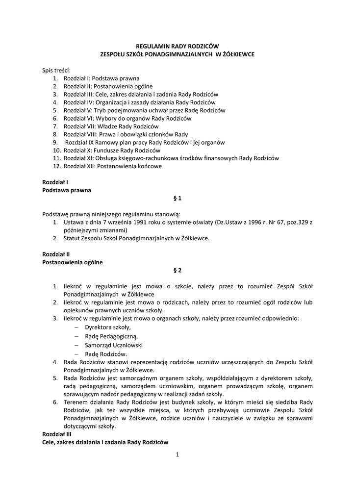 REGULAMIN RADY RODZICÓW ZESPOŁU SZKÓŁ PONADGIMNAZJALNYCH W ŻÓŁKIEWCE Spis treści: 1. Rozdział I: Podstawa prawna 2. Rozdział II: Postanowienia ogólne 3. Rozdział III: Cele, zakres działania i zadania Rady Rodziców 4. Rozdział IV: Organizacja i zasady działania Rady Rodziców 5. Rozdział V: Tryb podejmowania uchwał przez Radę Rodziców 6. Rozdział VI: Wybory do organów Rady Rodziców 7. Rozdział VII: Władze Rady Rodziców 8. Rozdział VIII: Prawa i obowiązki członków Rady 9. Rozdział IX Ramowy plan pracy Rady Rodziców i jej organów 10. Rozdział X: Fundusze Rady Rodziców 11. Rozdział XI: Obsługa księgowo-rachunkowa środków finansowych Rady Rodziców 12. Rozdział XII: Postanowienia końcowe Rozdział I Podstawa prawna §1 Podstawę prawną niniejszego regulaminu stanowią: 1. Ustawa z dnia 7 września 1991 roku o systemie oświaty (Dz.Ustaw z 1996 r. Nr 67, poz.329 z późniejszymi zmianami) 2. Statut Zespołu Szkół Ponadgimnazjalnych w Żółkiewce. Rozdział II Postanowienia ogólne §2 1. Ilekroć w regulaminie jest mowa o szkole, należy przez to rozumieć Zespół Szkół Ponadgimnazjalnych w Żółkiewce 2. Ilekroć w regulaminie jest mowa o rodzicach, należy przez to rozumieć ogół rodziców lub opiekunów prawnych uczniów szkoły. 3. Ilekroć w regulaminie jest mowa o organach szkoły, należy przez rozumieć odpowiednio: Dyrektora szkoły, Radę Pedagogiczną, Samorząd Uczniowski Radę Rodziców. 4. Rada Rodziców stanowi reprezentację rodziców uczniów uczęszczających do Zespołu Szkół Ponadgimnazjalnych w Żółkiewce. 5. Rada Rodziców jest samorządnym organem szkoły, współdziałającym z dyrektorem szkoły, radą pedagogiczną, samorządem uczniowskim, organem prowadzącym szkołę, organem sprawującym nadzór pedagogiczny w realizacji zadań szkoły. 6. Terenem działania Rady Rodziców jest budynek szkoły, w którym mieści się siedziba Rady Rodziców, jak też wszystkie miejsca, w których przebywają uczniowie Zespołu Szkół Ponadgimnazjalnych w Żółkiewce, rodzice uczniów i nauczyciele w związku ze sprawami dotyczącymi szkoły. Rozdział III Cele, zakres działania i zadania Rady Rodziców 1 §3 1. Celem działania Rady Rodziców jest doskonalenie statutowej działalności szkoły w zakresie: organizacji pracy szkoły, procesu wychowawczego i dydaktycznego, poprawy warunków technicznych i wyposażenia szkoły. zapewnienia uczniom warunków bytowych i pomocy materialnej. 2. Szczególnym celem Rady Rodziców jest działanie na rzecz opiekuńczej funkcji szkoły. 3. Rada Rodziców reprezentuje ogół rodziców. 4. Rada Rodziców może występować do organu prowadzącego szkołę, dyrektora, rady pedagogicznej z wnioskami i opiniami dotyczącymi wszystkich spraw szkoły. 5. Rada Rodziców prowadzi działalność na podstawie zatwierdzonego przez siebie rocznego planu pracy. §4 Do zadań Rady Rodziców należą w szczególności: 1. Uchwalanie w porozumieniu z Radą Pedagogiczną programu wychowawczego i programu profilaktyki. Jeżeli Rada Rodziców w terminie 30 dni od dnia rozpoczęcia roku szkolnego nie uzyska porozumienia z Radą Pedagogiczną w tym zakresie – program ustala dyrektor w porozumieniu z organem sprawującym nadzór pedagogiczny. Program ten obowiązuje do czasu uchwalenia programu przez Radę Rodziców w porozumieniu z Radą Pedagogiczną. 2. Opiniowanie programu i harmonogramu poprawy efektywności kształcenia lub wychowania. 3. Opiniowanie planu finansowego szkoły. 4. Przyjmowanie do wiadomości planu nadzoru pedagogicznego oraz informacji o realizacji planu nadzoru przedstawionych przez dyrektora. 5. Opiniowanie szkolnego zestawu programów nauczania i szkolnego zestawu podręczników. 6. Opiniowanie Wewnątrzszkolnego Systemu Oceniania. 7. Opiniowanie pracy nauczycieli ubiegających się o kolejny stopień awansu zawodowego. 8. Opiniowanie ofert towarzystw ubezpieczeniowych w zakresie ubezpieczenia uczniów. 9. Inicjowanie i branie czynnego udziału w spotkaniach z młodzieżą. 10. Współdziałanie w programowaniu prac szkoły oraz w planowaniu wydatków finansowych szkoły. 11. Udzielanie pomocy samorządowi uczniowskiemu oraz organizacjom młodzieżowym i społecznym działającym w szkole. 12. Podejmowanie działań na rzecz pozyskania środków finansowych dla szkoły. 13. Pozyskiwanie podmiotów gospodarczych, instytucji do współpracy ze szkołą, szczególnie w celu przyjęcia patronatu nad jej działalnością. 14. Współpraca z różnymi organizacjami działającymi w środowisku lokalnym. 15. Współuczestniczenie w opracowaniu i realizacji procedur ustalonych na okoliczność sytuacji szczególnych zagrażających bezpieczeństwu uczniów lub szkoły (przemoc wobec uczniów lub nauczycieli, zagrożenie losowe lub zewnętrzne itp.). Rozdział IV Organizacja i zasady działania Rady Rodziców §5 2 1. W Zespole Szkół Ponadgimnazjalnych w Żólkiewce funkcjonuje jedna Rada Rodziców; tworzą ją przedstawiciele wszystkich oddziałów wszystkich szkół wchodzących w skład Zespołu. 2. Podstawowym ogniwem organizacyjnym Rady Rodziców jest Rada Klasowa [ Oddziałowa]. 3. Rada Oddziałowa wybiera spośród siebie trzech przedstawicieli do Rady Rodziców. §6 4. Walne zebranie Rady Rodziców szkoły wybiera spośród siebie: Prezydium Rady Rodziców jako wewnętrzny organ kierujący pracami Rady Rodziców; w jego skład wchodzą: przewodniczący Rady, zastępca przewodniczącego, sekretarz i skarbnik, Komisję Rewizyjną, jako organ kontrolny Rady Rodziców. §7 5. Komisja Rewizyjna składa się co najmniej z 3 osób, nie więcej jednak niż z 5 osób. Członkowie Komisji Rewizyjnej wybierają przewodniczącego i zastępcę przewodniczącego na pierwszym swoim posiedzeniu. §8 6. Zebranie Rady Rodziców zwołuje przewodniczący lub jego zastępca. 7. Zebranie sprawozdawczo-wyborcze powinno być zwołane w terminie 1 miesiąca od dnia rozpoczęcia roku szkolnego. 8. Przygoto