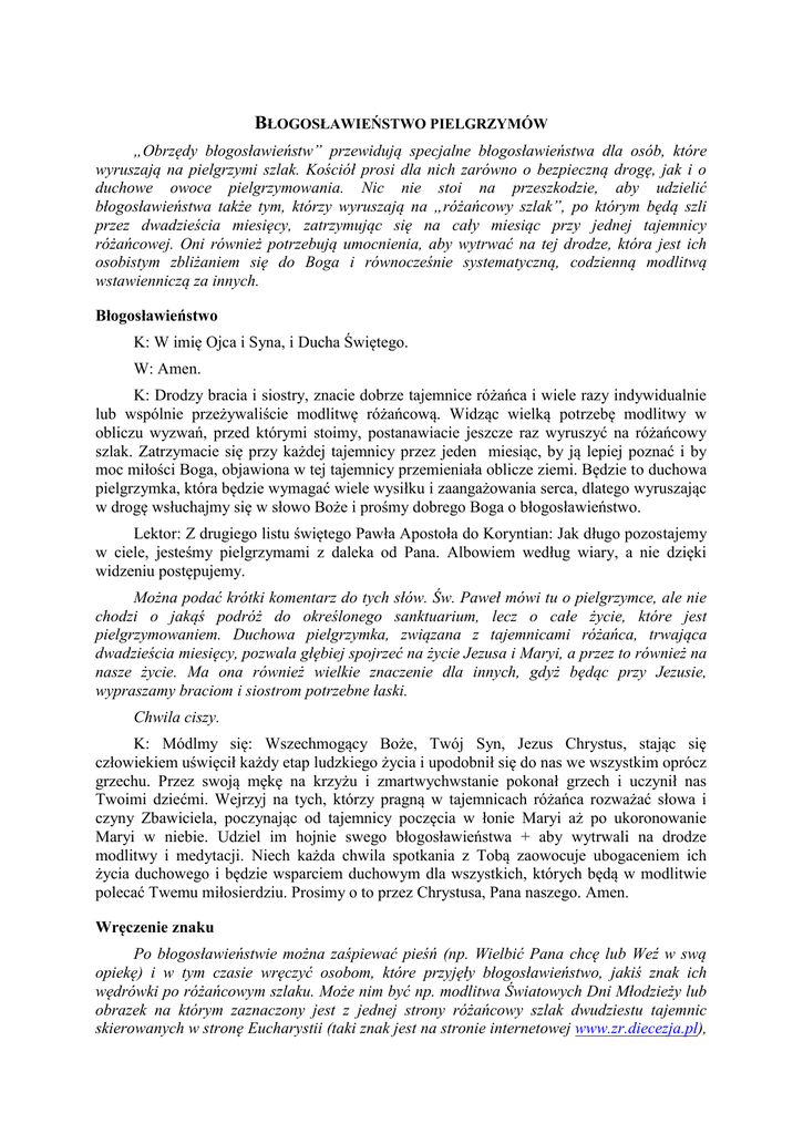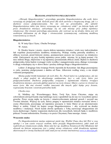 BŁOGOSŁAWIEŃSTWO PIELGRZYMÓW „Obrzędy błogosławieństw” przewidują specjalne błogosławieństwa dla osób, które wyruszają na pielgrzymi szlak. Kościół prosi dla nich zarówno o bezpieczną drogę, jak i o duchowe owoce pielgrzymowania. Nic nie stoi na przeszkodzie, aby udzielić błogosławieństwa także tym, którzy wyruszają na „różańcowy szlak”, po którym będą szli przez dwadzieścia miesięcy, zatrzymując się na cały miesiąc przy jednej tajemnicy różańcowej. Oni również potrzebują umocnienia, aby wytrwać na tej drodze, która jest ich osobistym zbliżaniem się do Boga i równocześnie systematyczną, codzienną modlitwą wstawienniczą za innych. Błogosławieństwo K: W imię Ojca i Syna, i Ducha Świętego. W: Amen. K: Drodzy bracia i siostry, znacie dobrze tajemnice różańca i wiele razy indywidualnie lub wspólnie przeżywaliście modlitwę różańcową. Widząc wielką potrzebę modlitwy w obliczu wyzwań, przed którymi stoimy, postanawiacie jeszcze raz wyruszyć na różańcowy szlak. Zatrzymacie się przy każdej tajemnicy przez jeden miesiąc, by ją lepiej poznać i by moc miłości Boga, objawiona w tej tajemnicy przemieniała oblicze ziemi. Będzie to duchowa pielgrzymka, która będzie wymagać wiele wysiłku i zaangażowania serca, dlatego wyruszając w drogę wsłuchajmy się w słowo Boże i prośmy dobrego Boga o błogosławieństwo. Lektor: Z drugiego listu świętego Pawła Apostoła do Koryntian: Jak długo pozostajemy w ciele, jesteśmy pielgrzymami z daleka od Pana. Albowiem według wiary, a nie dzięki widzeniu postępujemy. Można podać krótki komentarz do tych słów. Św. Paweł mówi tu o pielgrzymce, ale nie chodzi o jakąś podróż do określonego sanktuarium, lecz o całe życie, które jest pielgrzymowaniem. Duchowa pielgrzymka, związana z tajemnicami różańca, trwająca dwadzieścia miesięcy, pozwala głębiej spojrzeć na życie Jezusa i Maryi, a przez to również na nasze życie. Ma ona również wielkie znaczenie dla innych, gdyż będąc przy Jezusie, wypraszamy braciom i siostrom potrzebne łaski. Chwila ciszy. K: Módlmy się: Wszechmogący Boże, Twój Syn, Jezus Chrystus, stając się człowiekiem uświęcił każdy etap ludzkiego życia i upodobnił się do nas we wszystkim oprócz grzechu. Przez swoją mękę na krzyżu i zmartwychwstanie pokonał grzech i uczynił nas Twoimi dziećmi. Wejrzyj na tych, którzy pragną w tajemnicach różańca rozważać słowa i czyny Zbawiciela, poczynając od tajemnicy poczęcia w łonie Maryi aż po ukoronowanie Maryi w niebie. Udziel im hojnie swego błogosławieństwa + aby wytrwali na drodze modlitwy i medytacji. Niech każda chwila spotkania z Tobą zaowocuje ubogaceniem ich życia duchowego i będzie wsparciem duchowym dla wszystkich, których będą w modlitwie polecać Twemu miłosierdziu. Prosimy o to przez Chrystusa, Pana naszego. Amen. Wręczenie znaku Po błogosławieństwie można zaśpiewać pieśń (np. Wielbić Pana chcę lub Weź w swą opiekę) i w tym czasie wręczyć osobom, które przyjęły błogosławieństwo, jakiś znak ich wędrówki po różańcowym szlaku. Może nim być np. modlitwa Światowych Dni Młodzieży lub obrazek na którym zaznaczony jest z jednej strony różańcowy szlak dwudziestu tajemnic skierowanych w stronę Eucharystii (taki znak jest na stronie internetowej www.zr.diecezja.pl), a z drugiej strony modlitwa w głównych intencjach pielgrzymki (propozycja podana jest poniżej). Bądź uwielbiony, najlepszy Ojcze, w Twojej nieskończonej miłości. Poznaję ją w każdej tajemnicy ziemskiego życia Twego Syna, Jezusa Chrystusa, którą rozważam w różańcu (W tym miesiącu rozważam...). Twój Duch napełnia tą miłością moje serce. Umocniony(a) tak wielkim darem proszę Cię, przez przyczynę Maryi, o potrzebne łaski dla moich braci i sióstr: - Błogosław ludziom młodym, aby trwali przy Tobie i dobrze przygotowali się do Światowych Dni Młodzieży w Krakowie. - Umacniaj małżonków i rodziny, aby mieli siły do pokonania trudności, jakie niesie życie i miłowali się wzajemnie. - Wspieraj wszystkich, którzy troszczą się o przywrócenie pokoju tam, gdzie toczą się wojny, prześladowania i gdzie człowiek występuje przeciw człowiekowi.