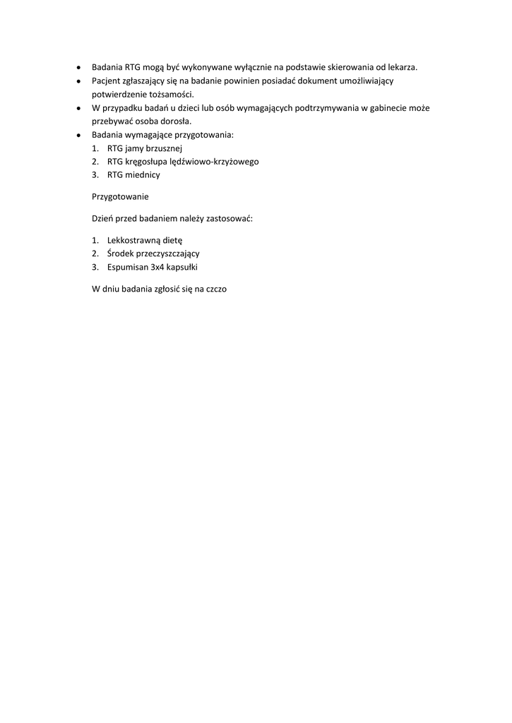 Badania RTG mogą byd wykonywane wyłącznie na podstawie skierowania od lekarza. Pacjent zgłaszający się na badanie powinien posiadad dokument umożliwiający potwierdzenie tożsamości. W przypadku badao u dzieci lub osób wymagających podtrzymywania w gabinecie może przebywad osoba dorosła. Badania wymagające przygotowania: 1. RTG jamy brzusznej 2. RTG kręgosłupa lędźwiowo-krzyżowego 3. RTG miednicy Przygotowanie Dzieo przed badaniem należy zastosowad: 1. Lekkostrawną dietę 2. Środek przeczyszczający 3. Espumisan 3x4 kapsułki W dniu badania zgłosid się na czczo