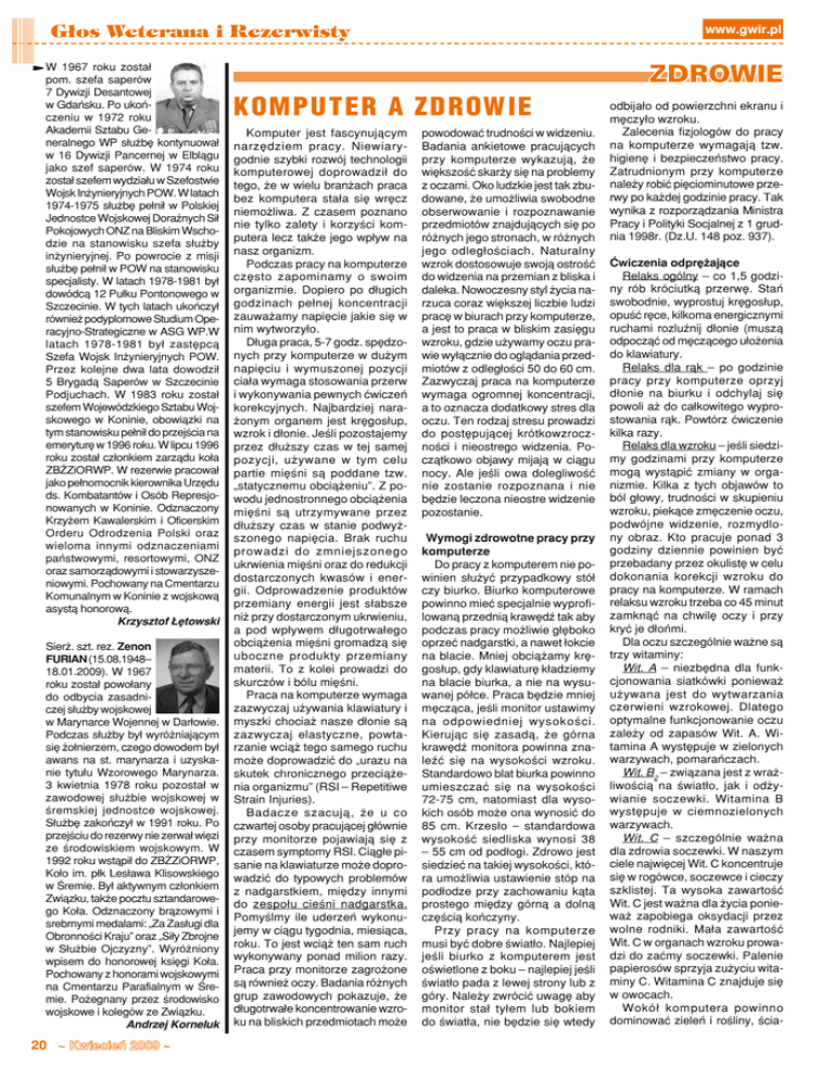 G³os Weterana i Rezerwisty W 1967 roku został pom. szefa saperów 7 Dywizji Desantowej w Gdańsku. Po ukończeniu w 1972 roku Akademii Sztabu Generalnego WP służbę kontynuował w 16 Dywizji Pancernej w Elblągu jako szef saperów. W 1974 roku został szefem wydziału w Szefostwie Wojsk Inżynieryjnych POW. W latach 1974-1975 służbę pełnił w Polskiej Jednostce Wojskowej Doraźnych Sił Pokojowych ONZ na Bliskim Wschodzie na stanowisku szefa służby inżynieryjnej. Po powrocie z misji służbę pełnił w POW na stanowisku specjalisty. W latach 1978-1981 był dowódcą 12 Pułku Pontonowego w Szczecinie. W tych latach ukończył również podyplomowe Studium Operacyjno-Strategiczne w ASG WP.W latach 1978-1981 był zastępcą Szefa Wojsk Inżynieryjnych POW. Przez kolejne dwa lata dowodził 5 Brygadą Saperów w Szczecinie Podjuchach. W 1983 roku został szefem Wojewódzkiego Sztabu Wojskowego w Koninie, obowiązki na tym stanowisku pełnił do przejścia na emeryturę w 1996 roku. W lipcu 1996 roku został członkiem zarządu koła ZBŻZiORWP. W rezerwie pracował jako pełnomocnik kierownika Urzędu ds. Kombatantów i Osób Represjonowanych w Koninie. Odznaczony Krzyżem Kawalerskim i Oficerskim Orderu Odrodzenia Polski oraz wieloma innymi odznaczeniami państwowymi, resortowymi, ONZ oraz samorządowymi i stowarzyszeniowymi. Pochowany na Cmentarzu Komunalnym w Koninie z wojskową asystą honorową. Krzysztof Łętowski Sierż. szt. rez. Zenon FURIAN (15.08.1948– 18.01.2009). W 1967 roku został powołany do odbycia zasadniczej służby wojskowej w Marynarce Wojennej w Darłowie. Podczas służby był wyróżniającym się żołnierzem, czego dowodem był awans na st. marynarza i uzyskanie tytułu Wzorowego Marynarza. 3 kwietnia 1978 roku pozostał w zawodowej służbie wojskowej w śremskiej jednostce wojskowej. Służbę zakończył w 1991 roku. Po przejściu do rezerwy nie zerwał więzi ze środowiskiem wojskowym. W 1992 roku wstąpił do ZBŻZiORWP, Koło im. płk Lesława Klisowskiego w Śremie. Był aktywnym członkiem Związku, także pocztu sztandarowego Koła. Odznaczony brązowymi i srebrnymi medalami: „Za Zasługi dla Obronności Kraju” oraz „Siły Zbrojne w Służbie Ojczyzny”. Wyróżniony wpisem do honorowej księgi Koła. Pochowany z honorami wojskowymi na Cmentarzu Parafialnym w Śremie. Pożegnany przez środowisko wojskowe i kolegów ze Związku. Andrzej Korneluk 20 ~ Kwiecień 2009 ~ www.gwir.pl zdrowie Komputer a zdrowie Komputer jest fascynującym narzędziem pracy. Niewiarygodnie szybki rozwój technologii komputerowej doprowadził do tego, że w wielu branżach praca bez komputera stała się wręcz niemożliwa. Z czasem poznano nie tylko zalety i korzyści komputera lecz także jego wpływ na nasz organizm. Podczas pracy na komputerze często zapominamy o swoim organizmie. Dopiero po długich godzinach pełnej koncentracji zauważamy napięcie jakie się w nim wytworzyło. Długa praca, 5-7 godz. spędzonych przy komputerze w dużym napięciu i wymuszonej pozycji ciała wymaga stosowania przerw i wykonywania pewnych ćwiczeń korekcyjnych. Najbardziej narażonym organem jest kręgosłup, wzrok i dłonie. Jeśli pozostajemy przez dłuższy czas w tej samej pozycji, używane w tym celu partie mięśni są poddane tzw. „statycznemu obciążeniu”. Z powodu jednostronnego obciążenia mięśni są utrzymywane przez dłuższy czas w stanie podwyższonego napięcia. Brak ruchu prowadzi do zmniejszonego ukrwienia mięśni oraz do redukcji dostarczonych kwasów i energii. Odprowadzenie produktów przemiany energii jest słabsze niż przy dostarczonym ukrwieniu, a pod wpływem długotrwałego obciążenia mięśni gromadzą się uboczne produkty przemiany materii. To z kolei prowadzi do skurczów i bólu mięśni. Praca na komputerze wymaga zazwyczaj używania klawiatury i myszki chociaż nasze dłonie są zazwyczaj elastyczne, powtarzanie wciąż tego samego ruchu może doprowadzić do „urazu na skutek chronicznego przeciążenia organizmu” (RSI – Repetitiwe Strain Injuries). Badacze szacują, że u co czwartej osoby pracującej głównie przy monitorze pojawiają się z czasem symptomy RSI. Ciągłe pisanie na klawiaturze może doprowadzić do typowych problemów z nadgarstkiem, między innymi do zespołu cieśni nadgarstka. Pomyślmy ile uderzeń wykonujemy w ciągu tygodnia, miesiąca, roku. To jest wciąż ten sam ruch wykonywany ponad milion razy. Praca przy monitorze zagrożone są również oczy. Badania różnych grup zawodowych pokazuje, że długotrwałe koncentrowanie wzroku na bliskich przedmiotach może powodować trudności w widzeniu. Badania ankietowe pracujących przy komputerze wykazują, że większość skarży się na problemy z oczami. Oko ludzkie jest tak zbudowane, że umożliwia swobodne obserwowanie i rozpoznawanie przedmiotów znajdujących się po różnych jego stronach, w różnych jego odległościach. Naturalny wzrok dostosowuje swoją ostrość do widzenia na przemian z bliska i daleka. Nowoczesny styl życia narzuca coraz większej liczbie ludzi pracę w biurach przy komputerze, a jest to praca w bliskim zasięgu wzroku, gdzie używamy oczu prawie wyłącznie do oglądania przedmiotów z odległości 50 do 60 cm. Zazwyczaj praca na komputerze wymaga ogromnej koncentracji, a to oznacza dodatkowy stres dla oczu. Ten rodzaj stresu prowadzi do postępującej krótkowzroczności i nieostrego widzenia. Początkowo objawy mijają w ciągu nocy. Ale jeśli owa dolegliwość nie zostanie rozpoznana i nie będzie leczona nieostre widzenie pozostanie. Wymogi zdrowotne pracy przy komputerze Do pracy z komputerem nie powinien służyć przypadkowy stół czy biurko. Biurko komputerowe powinno mieć specjalnie wyprofilowaną przednią krawędź tak aby podczas pracy możliwie głęboko oprzeć nadgarstki, a nawet łokcie na blacie. Mniej obciążamy kręgosłup, gdy klawiaturę kładziemy na blacie biurka, a nie na wysuwane