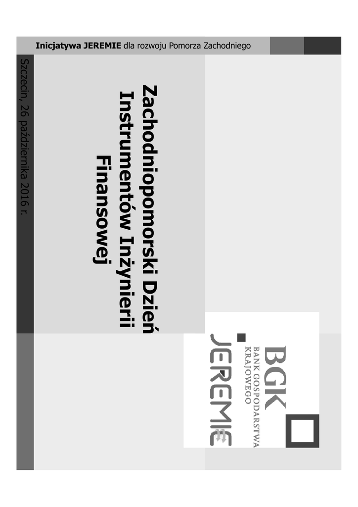 Inicjatywa JEREMIE dla rozwoju Pomorza Zachodniego Zachodniopomorski Dzień Instrumentów Inżynierii Finansowej Szczecin, 26 października 2016 r. Inicjatywa JEREMIE dla rozwoju Pomorza Zachodniego Duża Pożyczka Inwestycyjna 6.1/2016/ZFPJ Szczecin, 26 października 2016 r. Inicjatywa JEREMIE dla rozwoju Pomorza Zachodniego Pożyczka MFP na rzecz PF ze środków Funduszu Powierniczego JEREMIE, w celu udzielania przez PF Jednostkowych Pożyczek dla OB, będących MŚP, realizującymi projekt miejski na Pomorzu Zachodnim objęty Zintegrowanym Planem Zrównoważonego Rozwoju Obszarów Miejskich. PARAMETRY 6.1/2016/ZFPJ ALOKACJA KONKURS/PF 80 mln/40 mln (nie mniej niż 20 mln) PODMIOTY UPRAWNIONE fundusze pożyczkowe; banki krajowe, banki zagraniczne, instytucje finansowe; banki spółdzielcze; inne podmioty finansowe udzielające finansowania dla MŚP. WARUNKI JP na warunkach rynkowych; na warunkach korzystniejszych niż rynkowe. NA JAKI CEL finansowanie inwestycji polegających m.in. na zakupie, budowie lub modernizacji obiektów produkcyjno–usługowo– handlowych; tworzenie nowych miejsc pracy; wdrażanie nowych rozwiązań technicznych lub technologicznych; zakup wyposażenia, maszyn, urządzeń, aparatów, w tym także zakup środków transportu bezpośrednio związanych z celem realizowanego przedsięwzięcia; inne cele gospodarcze przyczyniające się do rozwoju MŚP. Szczecin, 26 października 2016 r. Inicjatywa JEREMIE dla rozwoju Pomorza Zachodniego Pożyczka MFP na rzecz PF ze środków Funduszu Powierniczego JEREMIE, w celu udzielania przez PF Jednostkowych Pożyczek dla OB, będących MŚP, realizującymi projekt miejski na Pomorzu Zachodnim objęty Zintegrowanym Planem Zrównoważonego Rozwoju Obszarów Miejskich. PARAMETRY STREFY SPOŁECZNE 6.1/2016/ZFPJ rozwój zasobów ludzkich; przeciwdziałanie wykluczeniu społecznemu; walka z patologiami społecznymi; podniesienie bezpieczeństwa w miejscach publicznych; tworzenie równych szans; zapobieganie zjawisku bezrobocia; zapobieganie zjawisku bezdomności; aktywizacja środowisk dziecięcych i młodzieżowych; wspieranie działalności organizacji pozarządowych. Realizowany projekt miejski wpływać będzie na co najmniej dwie z powyższych sfer społecznych. ZABEZPIECZENIA Szczecin, 26 października 2016 r. Pełnomocnictwo ro RB PF; Cesja Praw z Wierzytelności i Zabezpieczeń; Weksel własny in blanco wraz z deklaracją wekslową. Inicjatywa JEREMIE dla rozwoju Pomorza Zachodniego Pożyczka MFP na rzecz PF ze środków Funduszu Powierniczego JEREMIE, w celu udzielania przez PF Jednostkowych Pożyczek dla OB, będących MŚP, realizującymi projekt miejski na Pomorzu Zachodnim objęty Zintegrowanym Planem Zrównoważonego Rozwoju Obszarów Miejskich. PARAMETRY OPŁATY, PROWIZJE, WYNAGRADZANIE 6.1/2016/ZFPJ Brak prowizji za przyznanie DPI; Zachęty: 1% - wykorzystanie 100% przyznanego Limitu DPI w terminie poniżej 12 miesięcy od dnia udostępnienia Limitu DPI; KARY SZKODOWOŚĆ Szczecin, 26 października 2016 r. 1% różnicy pomiędzy przyznanym Limitem DPI, a faktycznie wykorzystanym Limitem DPI w przypadku nie wykorzystania DPI rozumianego jako zawarcie Umów Operacyjnych II Stopnia z Ostatecznymi Beneficjentami w OBP; 1% różnicy pomiędzy zakontraktowanymi środkami, a faktycznie wypłaconymi w okresie 3 lat od zakończenia OBP środków do OB. na podstawie zawartych UO II St. 20% Inicjatywa JEREMIE dla rozwoju Pomorza Zachodniego Dziękuję za uwagę Biuro Główne Menadżera Funduszy Powierniczych JEREMIE Bank Gospodarstwa Krajowego Departament Instrumentów Inżynierii Finansowej Al. Jerozolimskie 7, Warszawa tel. 22 599-81-00 Biuro Regionalne Menadżera Zachodniopomorskiego Funduszu Powierniczego JEREMIE Bank Gospodarstwa Krajowego ul. Tkacka 3A, 70-556 Szczecin tel. 91 489-08-79