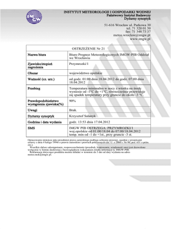 INSTYTUT METEOROLOGII I GOSPODARKI WODNEJ Państwowy Instytut Badawczy Dyżurny synoptyk 51-616 Wrocław ul. Parkowa 30 tel: 71 320 01 50 fax: 71 348 73 37 [email protected] www.imgw.pl OSTRZEŻENIE Nr 21 Nazwa biura Biuro Prognoz Meteorologicznych IMGW-PIB Oddział we Wrocławiu Zjawisko/stopień zagrożenia Przymrozki/1 Obszar województwo opolskie Ważność (cz. urz.) od godz. 01:00 dnia 18.04.2012 do godz. 07:00 dnia 18.04.2012 Przebieg Temperatura minimalna w nocy z wtorku na środę wyniesie od -1°C do +1°C, równocześnie przewiduje się spadek temperatury przy gruncie do około -3 °C. Prawdopodobieństwo wystąpienia zjawiska(%) 90% Uwagi Brak. Dyżurny synoptyk Krzysztof Salanyk Godzina i data wydania godz. 13:53 dnia 17.04.2012 SMS IMGW PIB OSTRZEGA: PRZYMROZKI/1 woj.opolskie od 01:00/18.04 do 07:00/18.04.2012 temp. min od -1 do +1st., przy gruncie -3 st. Opracowanie niniejsze jako przedmiot prawa autorskiego podlega ochronie prawnej, zgodnie z przepisami ustawy z dnia 4 lutego 1994r o prawie autorskim i prawach pokrewnych (dz. U. z 2006 r. Nr 90, poz. 631 z późn. zm.). Wszelkie dalsze udostępnianie, rozpowszechnianie (przedruk, kopiowanie, wiadomość sms) jest dozwolone wyłącznie w formie dosłownej z bezwzględnym wskazaniem źródła informacji tj. IMGW-PIB. Reklamacje dotyczące produktu można składać w terminie do 3 dni od daty wydania na adres [email protected].