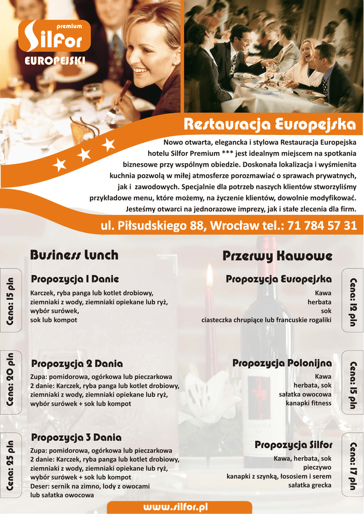 Restauracja Europejska Nowo otwarta, elegancka i stylowa Restauracja Europejska hotelu Silfor Premium *** jest idealnym miejscem na spotkania biznesowe przy wspólnym obiedzie. Doskona³a lokalizacja i wyœmienita kuchnia pozwol¹ w mi³ej atmosferze porozmawiaæ o sprawach prywatnych, jak i zawodowych. Specjalnie dla potrzeb naszych klientów stworzyliœmy przyk³adowe menu, które mo¿emy, na ¿yczenie klientów, dowolnie modyfikowaæ. Jesteœmy otwarci na jednorazowe imprezy, jak i sta³e zlecenia dla firm. Cena: 20 pln Przerwy Kawowe Propozycja 1 Danie Propozycja Europejska Karczek, ryba panga lub kotlet drobiowy, ziemniaki z wody, ziemniaki opiekane lub ry¿, wybór surówek, sok lub kompot Kawa herbata sok ciasteczka chrupi¹ce lub francuskie rogaliki Propozycja Polonijna Propozycja 2 Dania Zupa: pomidorowa, ogórkowa lub pieczarkowa 2 danie: Karczek, ryba panga lub kotlet drobiowy, ziemniaki z wody, ziemniaki opiekane lub ry¿, wybór surówek + sok lub kompot Zupa: pomidorowa, ogórkowa lub pieczarkowa 2 danie: Karczek, ryba panga lub kotlet drobiowy, ziemniaki z wody, ziemniaki opiekane lub ry¿, wybór surówek + sok lub kompot Deser: sernik na zimno, lody z owocami lub sa³atka owocowa www.silfor.pl Propozycja Silfor Kawa, herbata, sok pieczywo kanapki z szynk¹, ³ososiem i serem sa³atka grecka Cena: 17 pln Propozycja 3 Dania Kawa herbata, sok sa³atka owocowa kanapki fitness Cena: 15 pln Cena: 25 pln Business Lunch Cena: 12 pln Cena: 15 pln ul. Pi³sudskiego 88, Wroc³aw tel.: 71 784 57 31