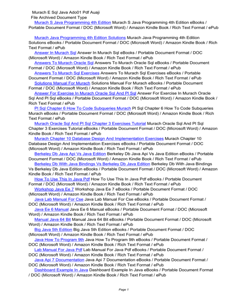 Murach E Sql Java Ado01 Pdf Auaji File Archived Document Type Murach S Java Programming 4th Edition Murach S Java Programming 4th Edition eBooks / Portable Document Format / DOC (Microsoft Word) / Amazon Kindle Book / Rich Text Format / ePub Murach Java Programming 4th Edition Solutions Murach Java Programming 4th Edition Solutions eBooks / Portable Document Format / DOC (Microsoft Word) / Amazon Kindle Book / Rich Text Format / ePub Answer In Murach Sql Answer In Murach Sql eBooks / Portable Document Format / DOC (Microsoft Word) / Amazon Kindle Book / Rich Text Format / ePub Answers To Murach Oracle Sql Answers To Murach Oracle Sql eBooks / Portable Document Format / DOC (Microsoft Word) / Amazon Kindle Book / Rich Text Format / ePub Answers To Murach Sql Exercises Answers To Murach Sql Exercises eBooks / Portable Document Format / DOC (Microsoft Word) / Amazon Kindle Book / Rich Text Format / ePub Solutions Manual For Murach Solutions Manual For Murach eBooks / Portable Document Format / DOC (Microsoft Word) / Amazon Kindle Book / Rich Text Format / ePub Answer For Exercise In Murach Oracle Sql And Pl Sql Answer For Exercise In Murach Oracle Sql And Pl Sql eBooks / Portable Document Format / DOC (Microsoft Word) / Amazon Kindle Book / Rich Text Format / ePub Pl Sql Chapter 6 How To Code Subqueries Murach Pl Sql Chapter 6 How To Code Subqueries Murach eBooks / Portable Document Format / DOC (Microsoft Word) / Amazon Kindle Book / Rich Text Format / ePub Murach Oracle Sql And Pl Sql Chapter 3 Exercises Tutorial Murach Oracle Sql And Pl Sql Chapter 3 Exercises Tutorial eBooks / Portable Document Format / DOC (Microsoft Word) / Amazon Kindle Book / Rich Text Format / ePub Murach Chapter 10 Database Design And Implementation Exercises Murach Chapter 10 Database Design And Implementation Exercises eBooks / Portable Document Format / DOC (Microsoft Word) / Amazon Kindle Book / Rich Text Format / ePub Berkeley Db Java Api Vs Java Edition Berkeley Db Java Api Vs Java Edition eBooks / Portable Document Format / DOC (Microsoft Word) / Amazon Kindle Book / Rich Text Format / ePub Berkeley Db With Java Bindings Vs Berkeley Db Java Edition Berkeley Db With Java Bindings Vs Berkeley Db Java Edition eBooks / Portable Document Format / DOC (Microsoft Word) / Amazon Kindle Book / Rich Text Format / ePub How To Use This In Java Pdf How To Use This In Java Pdf eBooks / Portable Document Format / DOC (Microsoft Word) / Amazon Kindle Book / Rich Text Format / ePub Workshop Java Ee 7 Workshop Java Ee 7 eBooks / Portable Document Format / DOC (Microsoft Word) / Amazon Kindle Book / Rich Text Format / ePub Java Lab Manual For Cse Java Lab Manual For Cse eBooks / Portable Document Format / DOC (Microsoft Word) / Amazon Kindle Book / Rich Text Format / ePub Java Ee 6 Manual Java Ee 6 Manual eBooks / Portable Document Format / DOC (Microsoft Word) / Amazon Kindle Book / Rich Text Format / ePub Manual Java 64 Bit Manual Java 64 Bit eBooks / Portable Document Format / DOC (Microsoft Word) / Amazon Kindle Book / Rich Text Format / ePub Big Java 5th Edition Big Java 5th Edition eBooks / Portable Document Format / DOC (Microsoft Word) / Amazon Kindle Book / Rich Text Format / ePub Java How To Program 9th Java How To Program 9th eBooks / Portable Document Format / DOC (Microsoft Word) / Amazon Kindle Book / Rich Text Format / ePub Lab Manual For Java Pdf Lab Manual For Java Pdf eBooks / Portable Document Format / DOC (Microsoft Word) / Amazon Kindle Book / Rich Text Format / ePub Java Api 7 Documentation Java Api 7 Documentation eBooks / Portable Document Format / DOC (Microsoft Word) / Amazon Kindle Book / Rich Text Format / ePub Dashboard Example In Java Dashboard Example In Java eBooks / Portable Document Format / DOC (Microsoft Word) / Amazon Kindle Book / Rich Text Format / ePub Page 1 Java Xml Document Example Java Xml Document Example eBooks / Portable Document Format / DOC (Microsoft Word) / Amazon Kindle Book / Rich Text Format / ePub Soa Web Services With Java Soa Web Services With Java eBooks / Portable Document Format / DOC (Microsoft Word) / Amazon Kindle Book / Rich Text Format / ePub Java How To Program 8th Java How To Program 8th eBooks / Portable Document Format / DOC (Microsoft Word) / Amazon Kindle Book / Rich Text Format / ePub Java Lab Manual Pdf Java Lab Manual Pdf eBooks / Portable Document Format / DOC (Microsoft Word) / Amazon Kindle Book / Rich Text Format / ePub Java Com De Manual Jsp Java Com De Manual Jsp eBooks / Portable Document Format / DOC (Microsoft Word) / Amazon Kindle Book / Rich Text Format / ePub Java Lab Manual For Mca Java Lab Manual For Mca eBooks / Portable Document Format / DOC (Microsoft Word) / Amazon Kindle Book / Rich Text Format / ePub Web Service Java Dom Pdf Web Service Java Dom Pdf eBooks / Portable Document Format / DOC (Microsoft Word) / Amazon Kindle Book / Rich Text Format / ePub Java Com It Manual Jsp Java Com It Manual Jsp eBooks / Portable Document Format / DOC (Microsoft Word) / Amazon Kindle Book / Rich Text Format / ePub Java Se 7 Documentation Java Se 7 Documentation eBooks / Portable Document Format / DOC (Microsoft Word) / Amazon Kindle Book / Rich Text Format / ePub Java Tic Tac Toe Code Java Tic Tac Toe Code eBooks / Portable Document Format / DOC (Microsoft Word) / Amazon Kindle Book / Rich Text Format / ePub Java Com Ru Manual Jsp Java Com Ru Manual Jsp eBooks / Portable Document Format / DOC (Microsoft Word) / Amazon Kindle Book / Rich Text Format / ePub Java Com Pl Manual Jsp Java Com Pl Manual Jsp eBooks / Portable Document Format / DOC (Microsoft Word) / Amazon Kindle Book / Rich Text Format / ePub Web Service Pdf Ebook In Java Web Service Pdf Ebook In Java eBooks / Portable Document Format / DOC (Microsoft Word) / Amazon Kindle Book / Rich Text Format / ePub Java In A Nutshell 7th Edition Java In A Nutshell 7th Edition eBooks / Portable Document Format / DOC (Microsoft Word) / Amazon Kindle Book / Rich Text Format / ePub Thinking In Java 8th Ed