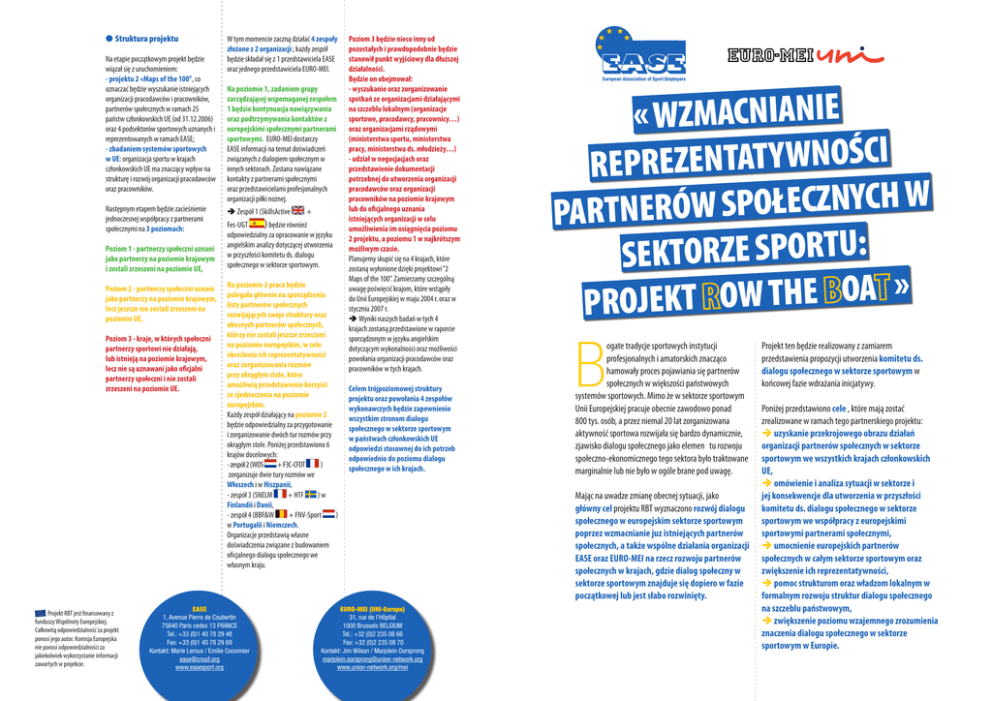 ● Struktura projektu Na etapie początkowym projekt będzie wiązał się z uruchomieniem: - projektu 2 «Maps of the 100”, co oznaczać będzie wyszukanie istniejących organizacji pracodawców i pracowników, partnerów społecznych w ramach 25 państw członkowskich UE (od 31.12.2006) oraz 4 podsektorów sportowych uznanych i reprezentowanych w ramach EASE; - zbadaniem systemów sportowych w UE: organizacja sportu w krajach członkowskich UE ma znaczący wpływ na strukturę i rozwój organizacji pracodawców oraz pracowników. Następnym etapem będzie zacieśnienie jednoczesnej współpracy z partnerami społecznymi na 3 poziomach: Poziom 1 - partnerzy społeczni uznani jako partnerzy na poziomie krajowym i zostali zrzeszeni na poziomie UE, Poziom 2 - partnerzy społeczni uznani jako partnerzy na poziomie krajowym, lecz jeszcze nie zostali zrzeszeni na poziomie UE, Poziom 3 - kraje, w których społeczni partnerzy sportowi nie działają, lub istnieją na poziomie krajowym, lecz nie są uznawani jako oficjalni partnerzy społeczni i nie zostali zrzeszeni na poziomie UE. Projekt RBT jest finansowany z funduszy Wspólnoty Europejskiej. Całkowitą odpowiedzialność za projekt ponosi jego autor. Komisja Europejska nie ponosi odpowiedzialności za jakiekolwiek wykorzystanie informacji zawartych w projekcie. W tym momencie zaczną działać 4 zespoły złożone z 2 organizacji ; każdy zespół będzie składał się z 1 przedstawiciela EASE oraz jednego przedstawiciela EURO-MEI. Na poziomie 1, zadaniem grupy zarządzającej wspomaganej zespołem 1 będzie kontynuacja nawiązywania oraz podtrzymywania kontaktów z europejskimi społecznymi partnerami sportowymi. EURO-MEI dostarczy EASE informacji na temat doświadczeń związanych z dialogiem społecznym w innych sektorach. Zostana nawiązane kontakty z partnerami społecznymi oraz przedstawicielami profesjonalnych organizacji piłki nożnej. ‚ Zespół 1 (SkillsActive + Fes-UGT ) będzie również odpowiedzialny za opracowanie w języku angielskim analizy dotyczącej utworzenia w przyszłości komitetu ds. dialogu społecznego w sektorze sportowym. Na poziomie 2 praca będzie polegała głównie na sporządzeniu listy partnerów społecznych rozwijających swoje struktury oraz obecnych partnerów społecznych, którzy nie zostali jeszcze zrzeszeni na poziomie europejskim, w celu określenia ich reprezentatywności oraz zorganizowania rozmów przy okrągłym stole, które umożliwią przedstawienie korzyści ze zjednoczenia na poziomie europejskim. Każdy zespół działający na poziomie 2 będzie odpowiedzialny za przygotowanie i zorganizowanie dwóch tur rozmów przy okrągłym stole. Poniżej przedstawiono 6 krajów docelowych: - zespół 2 (WOS + F3C-CFDT ) zorganizuje dwie tury rozmów we Włoszech i w Hiszpanii, - zespół 3 (SNELM + HTF )w Finlandii i Danii, - zespół 4 (BBF&W + FNV-Sport ) w Portugalii i Niemczech. Organizacje przedstawią własne doświadczenia związane z budowaniem oficjalnego dialogu społecznego we własnym kraju. EASE 1, Avenue Pierre de Coubertin 75640 Paris cedex 13 FRANCE Tel.: +33 (0)1 40 78 29 48 Fax: +33 (0)1 40 78 29 69 Kontakt: Marie Leroux / Emilie Coconnier [email protected] www.easesport.org Poziom 3 będzie nieco inny od pozostałych i prawdopodobnie będzie stanowił punkt wyjściowy dla dłuższej działalności. Będzie on obejmował: - wyszukanie oraz zorganizowanie spotkań ze organizacjami działającymi na szczeblu lokalnym (organizacje sportowe, pracodawcy, pracownicy…) oraz organizacjami rządowymi (ministerstwa sportu, ministerstwa pracy, ministerstwa ds. młodzieży…) - udział w negocjacjach oraz przedstawienie dokumentacji potrzebnej do utworzenia organizacji pracodawców oraz organizacji pracowników na poziomie krajowym lub do oficjalnego uznania istniejących organizacji w celu umożliwienia im osiągnięcia poziomu 2 projektu, a poziomu 1 w najkrótszym możliwym czasie. Planujemy skupić się na 4 krajach, które zostaną wyłonione dzięki projektowi “2 Maps of the 100”. Zamierzamy szczególną uwagę poświęcić krajom, które wstąpiły do Unii Europejskiej w maju 2004 r. oraz w styczniu 2007 r. ‚ Wyniki naszych badań w tych 4 krajach zostaną przedstawione w raporcie sporządzonym w języku angielskim dotyczącym wykonalności oraz możliwości powołania organizacji pracodawców oraz pracowników w tych krajach. Celem trójpoziomowej struktury projektu oraz powołania 4 zespołów wykonawczych będzie zapewnienie wszystkim stronom dialogu społecznego w sektorze sportowym w państwach członkowskich UE odpowiedzi stosownej do ich potrzeb odpowiednio do poziomu dialogu społecznego w ich krajach. EURO-MEI (UNI-Europa) 31, rue de l’Hôpital 1000 Brussels BELGIUM Tel.: +32 (0)2 235 08 66 Fax: +32 (0)2 235 08 70 Kontakt: Jim Wilson / Marjolein Oorsprong [email protected] www.union-network.org/mei « Wzmacnianie i c ś o n w y t a t n e z repre w h c y n z c e ł o p s w ó partner : u t r o p s e z r o t k se » a o e h t w o projekt B ogate tradycje sportowych instytucji profesjonalnych i amatorskich znacząco hamowały proces pojawiania się partnerów społecznych w większości państwowych systemów sportowych. Mimo że w sektorze sportowym Unii Europejskiej pracuje obecnie zawodowo ponad 800 tys. osób, a przez niemal 20 lat zorganizowana aktywność sportowa rozwijała się bardzo dynamicznie, zjawisko dialogu społecznego jako elemen tu rozwoju społeczno-ekonomicznego tego sektora było traktowane marginalnie lub nie było w ogóle brane pod uwagę. Mając na uwadze zmianę obecnej sytuacji, jako główny cel projektu RBT wyznaczono rozwój dialogu społecznego w europejskim sektorze sportowym poprzez wzmacnianie juz istniejących partnerów społecznych, a także wspólne działania organizacji EASE oraz EURO-MEI na rzecz rozwoju partnerów społecznych w krajach, gdzie dialog społeczny w sektorze sportowym znajduje się dopiero w fazie począ