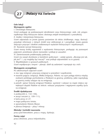 27 Polacy na świecie Cele lekcji Wymagania ogólne I. Chronologia historyczna. Uczeń posługuje się podstawowymi określeniami czasu historycznego: wiek, rok; przyporządkowuje fakty historyczne datom; dostrzega związki teraźniejszości z przeszłością. II. Analiza i interpretacja historyczna. Uczeń odpowiada na proste pytania postawione do tekstu źródłowego, mapy, ilustracji; pozyskuje informacje z różnych źródeł oraz selekcjonuje je i porządkuje; stawia pytania dotyczące przyczyn i skutków analizowanych wydarzeń historycznych i współczesnych. III. Tworzenie narracji historycznej. Uczeń tworzy krótką wypowiedź o wydarzeniu historycznym, posługując się poznanymi pojęciami; przedstawia własne stanowisko i próbuje je uzasadnić. IV. Zainteresowanie problematyką społeczną. Uczeń ma nawyk dociekania w kontekście społecznym – zadaje pytania „dlaczego jest tak, jak jest?” i „czy mogłoby być inaczej?” oraz próbuje odpowiedzieć na te pytania. V. Współdziałanie w sprawach publicznych. Uczeń współpracuje z innymi – planuje, dzieli się zadaniami i wywiązuje się z nich. Wymagania szczegółowe Po zakończonych zajęciach uczeń: • zna: typy emigracji; przyczyny emigracji w przeszłości i współcześnie, • rozumie pojęcia: emigracja, Wielka Emigracja, Polonia; na czym polega różnica między osobami polskiego pochodzenia a Polakami za granicą; problemy, jakie napotykają za granicą osoby udające się na emigrację, • potrafi: opisać historię emigracji Polaków; wymienić i wskazać na mapie miejsca największych skupisk Polaków na świecie; wskazać pozytywne i negatywne aspekty życia na emigracji. Środki dydaktyczne • podręcznik (s. 132–136), • zeszyt ćwiczeń (s. 109–111), • karta pracy nr 27, • mapa polityczna świata, • opowiadanie Historia Marysi, • plansza Emigracja – plusy i minusy. Metody i techniki nauczania praca pod kierunkiem, praca z mapą, dyskusja. Formy zajęć praca zbiorowa, praca indywidualna. 42 Czas zajęć 1 godzina lekcyjna. Struktura i opis lekcji I. Wprowadzenie Podajemy temat i cele lekcji. Zapisujemy na tablicy pojęcie: emigracja. Nawiązując do lekcji o powstaniu listopadowym, prosimy o przypomnienie najważniejszych skutków tego wystąpienia zbrojnego przeciw zaborcy. Gdy padnie hasło: Wielka Emigracja, informujemy, że opuszczanie kraju przez Polaków to zjawisko, które dotyczy nie tylko przeszłości. Jest też obecne współcześnie, choć jego skala i przyczyny są dziś zupełnie inne. II. Rozwinięcie Polecamy uczniom zapoznać się z treścią podrozdziału Historia polskiej emigracji (podręcznik, s. 132–133). Informujemy, że uzyskane wiadomości zostaną wykorzystane do wykonania projektu z ćwiczenia 2 w zeszycie ćwiczeń (s. 110–111). Prosimy uczniów o ustalenie, jakie informacje powinny się znaleźć przy każdej ilustracji (zaznaczamy, że uzupełnienie ćwiczenia będzie pracą domową). Następnie, w nawiązaniu do wymienionych w podrozdziale przyczyn emigracji, prosimy o odpowiedź na pytanie 2 (podręcznik, s. 133). Wyjaśniamy pojęcie: Polonia. Na przykładzie z podręcznika (s. 133) tłumaczymy, na czym polega różnica między osobami polskiego pochodzenia a Polakami za granicą. Podajemy też szacunkową liczebność Polonii. Następnie rozdajemy uczniom karty pracy i wyjaśniamy, że ich kolejnym zadaniem będzie zaznaczenie na mapie w zadaniu A największych skupisk Polonii. Po wykonaniu zadania sprawdzamy jego poprawność, wykorzystując jako klucze odpowiedzi informacje z podręcznika (s. 133) oraz mapę ścienną. Zwracamy uwagę, że Polacy mieszkający za naszą północno-wschodnią i wschodnią granicą (Litwa, Białoruś, Ukraina) nie chcą, aby nazywano ich Polonią, i wyjaśniamy przyczynę takiego stanu rzeczy. Kolejną część lekcji poświęcamy omówieniu zjawiska emigracji Polaków we współczesnych czasach. Prosimy uczniów o przypomnienie jej charakteru, a następnie informujemy, że wyjazdy za chlebem nasiliły się po wejściu Polski do Unii Europejskiej w 2004 r. Wyjaśniamy, że umożliwiło to naszym rodakom podjęcie legalnej pracy za granicą (najpierw w większości państw Unii, a obecnie na całym jej terytorium). Z powodu utrzymującego się w Polsce wysokiego bezrobocia wyjazd okazał się dla wielu Polaków jedynym sposobem uzyskania zatrudnienia. Jednak podjęcie decyzji o opuszczeniu kraju zawsze wiąże się z różnorodnymi skutkami. Dotykają one zarówno samych wyjeżdżających, jak i ich rodzin, które pozostały w kraju. Aby uczniowie mogli poznać i zrozumieć te skutki, prosimy o wysłuchanie pierwszej części historii 12-letniej Marysi (materiał nr 1). Po odczytaniu tekstu zachęcamy uczniów, aby zastanowili się, jakie zmiany czekają ojca Marysi i jego rodzinę. Wieszamy na tablicy pierwszą tabelkę z planszy Emigracja – plusy i minusy (materiał nr 2), a następnie inicjujemy dyskusję. Wnioski uczniów zapisujemy na planszy. 43 W dalszej części lekcji odczytujemy drugą część opowiadania (materiał nr 1) i powtarzamy procedurę. Wnioski zapisujemy w drugiej tabelce planszy. Po jej uzupełnieniu polecamy uczniom zapoznać się z podrozdziałem Życie na emigracji (podręcznik, s. 135–136) i wymienić te skutki, które powtórzyły się w czasie dyskusji. III. Podsumowanie Prosimy uczniów, aby spróbowali ocenić, czy decyzja o emigracji przynosi osobom wyjeżdżającym i ich rodzinom więcej korzyści czy strat. Następnie zadajemy pytanie C (podręcznik, s. 136). Metody kontroli Ćwiczenie 1 (zeszyt ćwiczeń, s. 109). Praca domowa Ćwiczenie 2 (zeszyt ćwiczeń, s. 110–111). Materiały dla nauczyciela Materiał nr 1 Opowiadanie Historia Marysi. • Część I. Do niedawna 12-letniej Marysi świat wydawał się miejscem uporządkowanym i bezpiecznym. Wszystko się zmieniło, gdy pewnego dnia jej tata przyszedł do domu z okropną wiadomością, że właśnie stracił prac