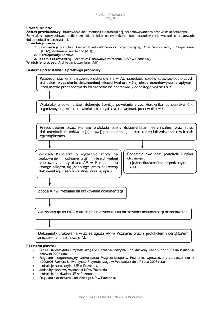 KARTA PROCEDURY P.92_AU Procedura: P.92 Zakres przedmiotowy: brakowanie dokumentacji niearchiwalnej, przechowywanie w archiwum uczelnianym Formularz: spisy zdawczo-odbiorcze akt, protokół oceny dokumentacji niearchiwalnej, wniosek o brakowanie dokumentacji niearchiwalnej, Uczestnicy procesu: 1. pracownicy: Kanclerz, kierownik jednostki/komórki organizacyjnej, Dział Gospodarczy i Zaopatrzenia (DGZ), Archiwum Uczelniane (AU), 2. komisje/rady: komisja, 3. podmiot zewnętrzny: Archiwum Państwowe w Poznaniu (AP w Poznaniu), Właściciel procesu: Archiwum Uczelniane (AU), Graficzne przedstawienie przebiegu procedury: KaŜdego roku kalendarzowego dokonuje się w AU przeglądu spisów zdawczo-odbiorczych akt celem wydzielenia dokumentacji niearchiwalnej, której okres przechowywania upłynął i którą moŜna przeznaczyć do zniszczenia na podstawie „Jednolitego wykazu akt” Wydzielania dokumentacji dokonuje komisja powołania przez kierownika jednostki/komórki organizacyjnej, która jest właścicielem tych akt, na wniosek pracownika AU Przygotowanie przez komisję protokołu oceny dokumentacji niearchiwalnej oraz spisu dokumentacji niearchiwalnej (aktowej) przeznaczonej na makulaturę lub zniszczenie w trzech egzemplarzach Wniosek Kanclerza o wyraŜenie zgody na brakowanie dokumentacji niearchiwalnej skierowany do dyrektora AP w Poznaniu, do którego załącza się jeden egz. protokołu oceny dokumentacji niearchiwalalnej, oraz jej spisu. Pozostałe dwa egz. protokołu i spisu otrzymują : • jednostka/komórka organizacyjna, • AU Zgoda AP w Poznaniu na brakowanie dokumentacji AU występuje do DGZ o uruchomienie wniosku na brakowanie dokumentacji niearchiwalnej Dokumenty brakowania wraz ze zgodą AP w Poznaniu oraz z protokołem i certyfikatem zniszczenia, przechowuje AU Podstawa prawna: • Statut Uniwersytetu Przyrodniczego w Poznaniu, załącznik do Uchwały Senatu nr 112/2006 z dnia 30 czerwca 2006 roku, • Regulamin organizacyjny Uniwersytetu Przyrodniczego w Poznaniu, wprowadzony zarządzeniem nr 100/2008 Rektora Uniwersytetu Przyrodniczego w Poznaniu z dnia 7 lipca 2008 roku, • Instrukcja kancelaryjna UP w Poznaniu, • Jednolity rzeczowy wykaz akt UP w Poznaniu, • Instrukcja archiwalna UP w Poznaniu, • Regulamin archiwum uczelnianego UP w Poznaniu, UNIWERSYTET PRZYRODNICZY W POZNANIU