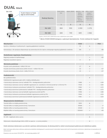 DUAL black DU 103 bond, keimo, nice To jest miejsce na Twoje logo (w cenie krzesła) Rodzaj tkaniny jaguar, fighter aquarius, new blazer, silvertex standard, blazer I * tkanina powierzona skóra, nexus* oxygen* silvertex* smarty plus* stripes plus* skóra pow. 1 2 3 4 DU 103 894 959 1 059 1 276 DU 102 684 749 849 1 066 Zgodne z PN-EN 1335-1:2004 PN-EN 1335-2:2009 PN-EN 1335-3:2009 * Oferta STUDIO DESIGN dostępna u wybranych dystrybutorów. Termin realizacji do 4 tygodni. Mechanizm KOD PLN Synchro z blokadą w 4 położeniach i regulacją głębokości siedziska W ● Samoważący- siła sprężyny dopasowuje się automatycznie do ciężaru siedzącego+regulacja głębokości siedziska SW ○ +80 ○ +92 H ● Krzyżak czarny plastikowy + kółka fi 65 mm 17 ● Krzyżak aluminiowy polerowany (efekt chrom) + kółka fi 65 mm 22 ○ +57 Krzyżak aluminiowy (kolor ALU) + kółka fi 65 mm 23 ○ +57 Dodatkowe regulacje /mechanizmy Regulacja podparcia lędźwiowego Regulacja wysokości oparcia Warianty podstaw Podłokietniki Bez podłokietników ● Podłokietniki regulowane góra-dół z miękką nakładką plus: • konstrukcja nylonowa czarna/ nakładki TPU - biodegradowalny poliuretan P48B ○ +149 • konstrukcja nylonowa czarna/ nakładki regulowane na szerokość (+15mm)i przód-tył (+25mm)/ PU P52B ○ +202 • konstrukcja malowana proszkowo/ nakładki TPU - biodegradowalny poliuretan P48A ○ +172 • konstrukcja aluminium polerowane/ nakładki TPU - biodegradowalny poliuretan P48C ○ +172 • konstrukcja nylonowa czarna/nakładki regulowane przód-tył//PU P49B ○ +200 • konstrukcja malowana proszkowo/nakładki regulowane przód-tył /PU P49A ○ +223 • konstrukcja aluminium polerowane/nakładki regulowane przód-tył /PU P49C ○ +223 Twarde kółka na miękką powierzchnię DEM ● Twarde kółka na miękką powierzchnię z hamulcem DEMA ○ +7 Miękkie kółka na twardą powierzchnię DEMD ○ +13 Miękkie kółka na twardą powierzchnię z hamulcem DEMAD ○ +40 Wyposażenie dodatkowe Zagłówek DU 103 - Zagłówek skóra czarna ● Wykonanie indywidualnego haftu LOGO na oparciu - w cenie produktu ● Fotele obrotowe dostarczane są w formie częściowo zdemontowanej. Za dostawę foteli w całości zmontowanych pobierana jest dodatkowa opłata. Bejot zastrzega sobie prawo odmowy wykonania produktów katalogowych w powierzonych materiałach tapicerskich jeśli ich parametry techniczne i jakościowe nie pozwolą na ich zastosowanie Powyższe ceny są cenami PLN NETTO - nie zawierają podatku VAT ● STANDARD ○ OPCJA