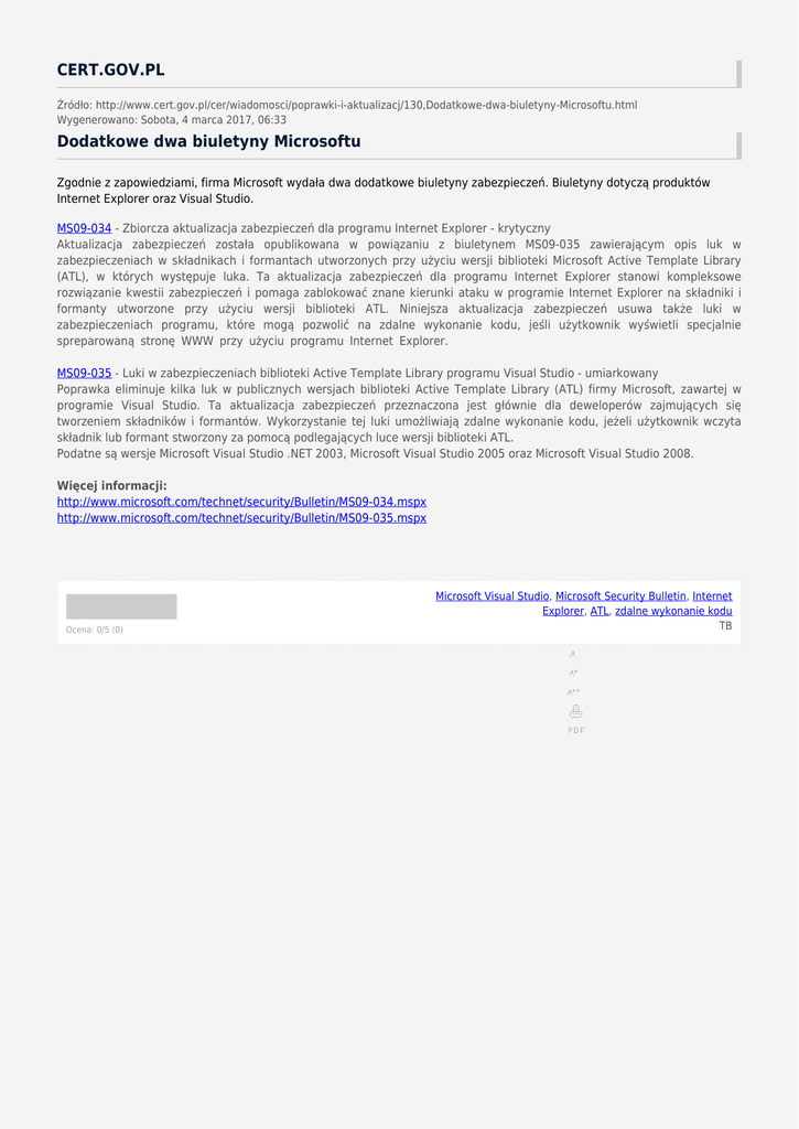 CERT.GOV.PL Źródło: http://www.cert.gov.pl/cer/wiadomosci/poprawki-i-aktualizacj/130,Dodatkowe-dwa-biuletyny-Microsoftu.html Wygenerowano: Sobota, 4 marca 2017, 06:33 Dodatkowe dwa biuletyny Microsoftu Zgodnie z zapowiedziami, firma Microsoft wydała dwa dodatkowe biuletyny zabezpieczeń. Biuletyny dotyczą produktów Internet Explorer oraz Visual Studio. MS09-034 - Zbiorcza aktualizacja zabezpieczeń dla programu Internet Explorer - krytyczny Aktualizacja zabezpieczeń została opublikowana w powiązaniu z biuletynem MS09-035 zawierającym opis luk w zabezpieczeniach w składnikach i formantach utworzonych przy użyciu wersji biblioteki Microsoft Active Template Library (ATL), w których występuje luka. Ta aktualizacja zabezpieczeń dla programu Internet Explorer stanowi kompleksowe rozwiązanie kwestii zabezpieczeń i pomaga zablokować znane kierunki ataku w programie Internet Explorer na składniki i formanty utworzone przy użyciu wersji biblioteki ATL. Niniejsza aktualizacja zabezpieczeń usuwa także luki w zabezpieczeniach programu, które mogą pozwolić na zdalne wykonanie kodu, jeśli użytkownik wyświetli specjalnie spreparowaną stronę WWW przy użyciu programu Internet Explorer. MS09-035 - Luki w zabezpieczeniach biblioteki Active Template Library programu Visual Studio - umiarkowany Poprawka eliminuje kilka luk w publicznych wersjach biblioteki Active Template Library (ATL) firmy Microsoft, zawartej w programie Visual Studio. Ta aktualizacja zabezpieczeń przeznaczona jest głównie dla deweloperów zajmujących się tworzeniem składników i formantów. Wykorzystanie tej luki umożliwiają zdalne wykonanie kodu, jeżeli użytkownik wczyta składnik lub formant stworzony za pomocą podlegających luce wersji biblioteki ATL. Podatne są wersje Microsoft Visual Studio .NET 2003, Microsoft Visual Studio 2005 oraz Microsoft Visual Studio 2008. Więcej informacji: http://www.microsoft.com/technet/security/Bulletin/MS09-034.mspx http://www.microsoft.com/technet/security/Bulletin/MS09-035.mspx Ocena: 0/5 (0) Microsoft Visual Studio, Microsoft Security Bulletin, Internet Explorer, ATL, zdalne wykonanie kodu TB