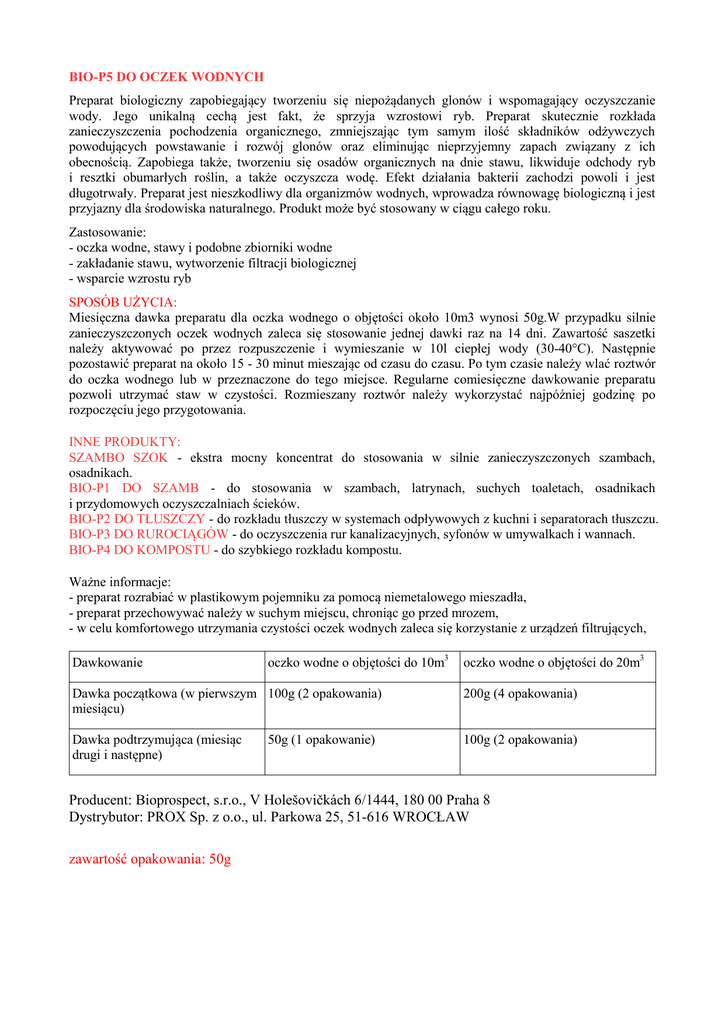 BIO-P5 DO OCZEK WODNYCH Preparat biologiczny zapobiegający tworzeniu się niepożądanych glonów i wspomagający oczyszczanie wody. Jego unikalną cechą jest fakt, że sprzyja wzrostowi ryb. Preparat skutecznie rozkłada zanieczyszczenia pochodzenia organicznego, zmniejszając tym samym ilość składników odżywczych powodujących powstawanie i rozwój glonów oraz eliminując nieprzyjemny zapach związany z ich obecnością. Zapobiega także, tworzeniu się osadów organicznych na dnie stawu, likwiduje odchody ryb i resztki obumarłych roślin, a także oczyszcza wodę. Efekt działania bakterii zachodzi powoli i jest długotrwały. Preparat jest nieszkodliwy dla organizmów wodnych, wprowadza równowagę biologiczną i jest przyjazny dla środowiska naturalnego. Produkt może być stosowany w ciągu całego roku. Zastosowanie: - oczka wodne, stawy i podobne zbiorniki wodne - zakładanie stawu, wytworzenie filtracji biologicznej - wsparcie wzrostu ryb SPOSÓB UŻYCIA: Miesięczna dawka preparatu dla oczka wodnego o objętości około 10m3 wynosi 50g.W przypadku silnie zanieczyszczonych oczek wodnych zaleca się stosowanie jednej dawki raz na 14 dni. Zawartość saszetki należy aktywować po przez rozpuszczenie i wymieszanie w 10l ciepłej wody (30-40°C). Następnie pozostawić preparat na około 15 - 30 minut mieszając od czasu do czasu. Po tym czasie należy wlać roztwór do oczka wodnego lub w przeznaczone do tego miejsce. Regularne comiesięczne dawkowanie preparatu pozwoli utrzymać staw w czystości. Rozmieszany roztwór należy wykorzystać najpóźniej godzinę po rozpoczęciu jego przygotowania. INNE PRODUKTY: SZAMBO SZOK - ekstra mocny koncentrat do stosowania w silnie zanieczyszczonych szambach, osadnikach. BIO-P1 DO SZAMB - do stosowania w szambach, latrynach, suchych toaletach, osadnikach i przydomowych oczyszczalniach ścieków. BIO-P2 DO TŁUSZCZY - do rozkładu tłuszczy w systemach odpływowych z kuchni i separatorach tłuszczu. BIO-P3 DO RUROCIĄGÓW - do oczyszczenia rur kanalizacyjnych, syfonów w umywalkach i wannach. BIO-P4 DO KOMPOSTU - do szybkiego rozkładu kompostu. Ważne informacje: - preparat rozrabiać w plastikowym pojemniku za pomocą niemetalowego mieszadła, - preparat przechowywać należy w suchym miejscu, chroniąc go przed mrozem, - w celu komfortowego utrzymania czystości oczek wodnych zaleca się korzystanie z urządzeń filtrujących, Dawkowanie oczko wodne o objętości do 10m3 oczko wodne o objętości do 20m3 Dawka początkowa (w pierwszym 100g (2 opakowania) miesiącu) 200g (4 opakowania) Dawka podtrzymująca (miesiąc drugi i następne) 100g (2 opakowania) 50g (1 opakowanie) Producent: Bioprospect, s.r.o., V Holešovičkách 6/1444, 180 00 Praha 8 Dystrybutor: PROX Sp. z o.o., ul. Parkowa 25, 51-616 WROCŁAW zawartość opakowania: 50g