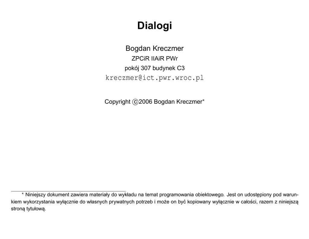 Dialogi Bogdan Kreczmer ZPCiR IIAiR PWr pokój 307 budynek C3 [email protected] c 2006 Bogdan Kreczmer? Copyright ? Niniejszy dokument zawiera materiały do wykładu na temat programowania obiektowego. Jest on udostepiony ˛ pod warun- kiem wykorzystania wyłacznie ˛ do własnych prywatnych potrzeb i może on być kopiowany wyłacznie ˛ w całości, razem z niniejsza˛ strona˛ tytułowa. ˛ Typy dialogów Dialog niemodalny – po uruchomieniu dialogu wszystkie elementy aplikacji wciaż ˛ odpowiadaja˛ na zdarzenia. Ognisko może zostać przeniesione do dowolnego okienka aplikacji. Tym samym można wybierać inne pozycje menu, narz˛edzia itd. Można również przenieść ognisko do innej aplikacji. Można również przełaczać ˛ sie˛ miedzy ˛ wirutalnymi pulpitami. Dialog modalny – po uruchomieniu dialogu ogniska nie można przenieść do żadnego innego innego okienka danej aplikacji. P˛etla zdarzeń (zwiazanych ˛ z dana˛ aplikacja) ˛ obsługiwana jest tylko w okienku dialogowym. Ognisko można jedynie przenieść do innej aplikajcji. Można również przełaczać ˛ sie˛ miedzy ˛ wirutalnymi pulpitami. Dialogi systemowe – po uruchomieniu dialogu ognisko nie może zostać przeniesione do żadnego innego okienka tej samej, jak też innej aplikacji. Niemożliwe jest przełaczanie ˛ miedzy ˛ wirtualnymi pulpitami. Dialog tego typu zawłaszcza całkowicie wskaźnik ekranowy (mysz) jak też klawiature. ˛ c 2006 Bogdan Kreczmer Copyright Dialogi 1 Przekazywanie informacji z okienka dialogowego • Bezpośredni odczyt z okienka dialogowego utworzonego statycznie (tylko dialogi modalne). • Obsługa komunikacji na poziomie dialogu – obsługa sygnałów z klawiszy dialogowych (tzn. Akceptuj, Odrzuć itp.). Modyfikacja stanu okienka zasadniczego lub innych struktur poprzez wskaźnik (lub referencje) ˛ pamietan ˛ a˛ w okienku dialogowym lub zmiennej globalnej. • Komunikacja poprzez sygnały – gdy informacji jest mało – z poziomu dialogu przesyłana jest pełna informacja o stanie okienka dialogowego do okienka zasadniczego (po przesłaniu sygnału dialog nie musi kończyć swojego działania). – gdy informacji jest dużo – poprzez sygnał przesyłany jest wskaźnik (lub nie, jeśli jest pamietany) ˛ na okienko dialogowe. Z poziomu okienka zasadniczego odczytywany jest aktualny stan okienka dialogowego. Destrukcja okienka dialogowego powinna być realizowana na poziomie okienka zasadniczego. c 2006 Bogdan Kreczmer Copyright Dialogi 2 Przykład dialogu modalnego c 2006 Bogdan Kreczmer Copyright Dialogi 3 Przykład dialogu modalnego Plik: dialogi1.hpp class DialogModalny: public QDialog { // public : DialogModalny( QWidget ∗wRodzic ): QDialog(wRodzic) ... }; // class KlasaKontrolki: public QWidget { // Q OBJECT QPushButton ∗ wPrzycisk; QLineEdit ∗ wOkTekstu; public : KlasaKontrolki( QWidget ∗wRodzic=0L ): QWidget( wRodzic ) ... public slots : void StartujDialog( ) ... }; // c 2006 Bogdan Kreczmer Copyright Dialogi 4 Przykład dialogu modalnego Plik: dialogi1.cpp #include ”dialogi1.hpp” int main( int argc, char ∗∗ argv ) { QApplication Aplikacja( argc, argv ); KlasaKontrolki Kontrolka; Aplikacja.setMainWidget( &Kontrolka ); Kontrolka.show( ); return Aplikacja.exec( ); } c 2006 Bogdan Kreczmer Copyright Dialogi 5 Przykład dialogu modalnego class DialogModalny: public QDialog { // ... }; // class KlasaKontrolki: public QWidget { // ... public : KlasaKontrolki( QWidget ∗wRodzic=0L ): QWidget( wRodzic ) { QVBoxLayout ∗wUkladWer = new QVBoxLayout( this ); wUkladWer–>addWidget( wOkTekstu = new QLineEdit(this ) ); wUkladWer–>addWidget( wPrzycisk = new QPushButton(”Start Dialogu”,this ) ); connect( wPrzycisk, SIGNAL( clicked( ) ), this , SLOT( StartujDialog( ) ) ); } public slots : void StartujDialog( ) ... }; // c 2006 Bogdan Kreczmer Copyright Dialogi 6 Przykład dialogu modalnego class DialogModalny: public QDialog { // ... }; // class KlasaKontrolki: public QWidget { // ... public : KlasaKontrolki( QWidget ∗wRodzic=0L ): QWidget( wRodzic ) ... public slots : void StartujDialog( ) { DialogModalny Dlg(this ); switch ( Dlg.exec( ) ) { case QDialog::Accepted: wOkTekstu–>setText( ”Tak” ); break ; case QDialog::Rejected: wOkTekstu–>setText( ”Nie” ); break ; } } }; // c 2006 Bogdan Kreczmer Copyright Dialogi 7 Przykład dialogu modalnego class DialogModalny: public QDialog { // public : DialogModalny( QWidget ∗wRodzic ): QDialog(wRodzic) { QHBoxLayout ∗wUkladHor = new QHBoxLayout( this ); QPushButton ∗wAkceptuj, ∗wOdrzuc; wUkladHor–>addWidget( wAkceptuj = new QPushButton( ”Akceptuj”, this ) ); wUkladHor–>addWidget( wOdrzuc = new QPushButton( ”Odrzuc”, this ) ); connect( wAkceptuj, SIGNAL( clicked( ) ), this , SLOT( accept( ) ) ); connect( wOdrzuc, SIGNAL( clicked( ) ), this , SLOT( reject( ) ) ); } }; // class KlasaKontrolki: public QWidget { // ... }; // c 2006 Bogdan Kreczmer Copyright Dialogi 8