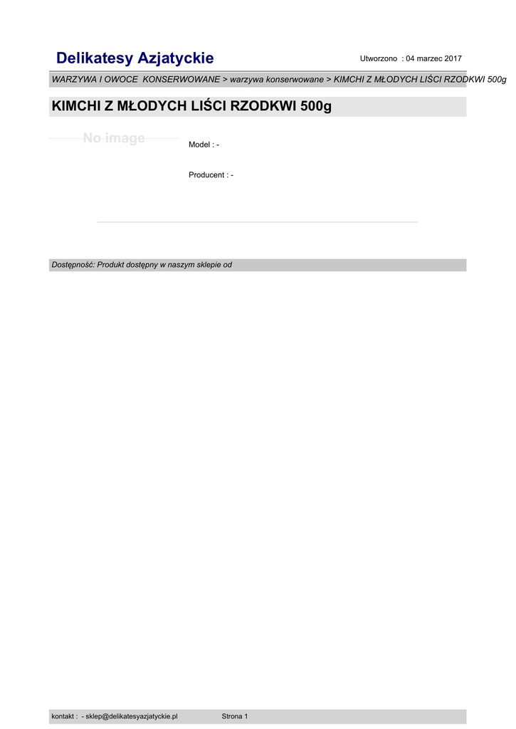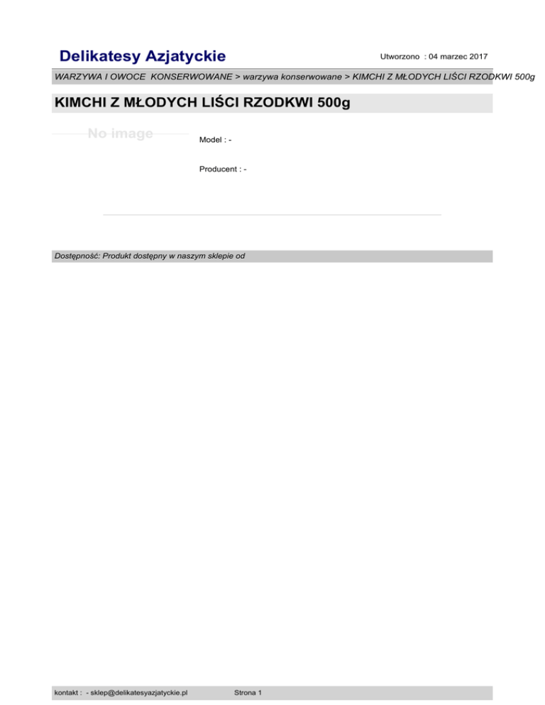 Delikatesy Azjatyckie Utworzono : 04 marzec 2017 WARZYWA I OWOCE KONSERWOWANE > warzywa konserwowane > KIMCHI Z MŁODYCH LIŚCI RZODKWI 500g KIMCHI Z MŁODYCH LIŚCI RZODKWI 500g No image Model : - Producent : - Dostępność: Produkt dostępny w naszym sklepie od kontakt : - [email protected] Strona 1