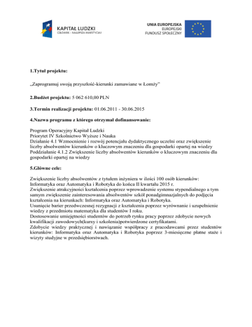 1.Tytuł projektu: „Zaprogramuj swoją przyszłość-kierunki zamawiane w Łomży” 2.Budżet projektu: 5 062 610,00 PLN 3.Termin realizacji projektu: 01.06.2011 - 30.06.2015 4.Nazwa programu z którego otrzymał dofinansowanie: Program Operacyjny Kapitał Ludzki Priorytet IV Szkolnictwo Wyższe i Nauka Działanie 4.1 Wzmocnienie i rozwój potencjału dydaktycznego uczelni oraz zwiększenie liczby absolwentów kierunków o kluczowym znaczeniu dla gospodarki opartej na wiedzy Poddziałanie 4.1.2 Zwiększenie liczby absolwentów kierunków o kluczowym znaczeniu dla gospodarki opartej na wiedzy 5.Główne cele: Zwiększenie liczby absolwentów z tytułem inżyniera w ilości 100 osób kierunków: Informatyka oraz Automatyka i Robotyka do końca II kwartału 2015 r. Zwiększenie atrakcyjności kształcenia poprzez wprowadzenie systemu stypendialnego a tym samym zwiększenie zainteresowania absolwentów szkół ponadgimnazjalnych do podjęcia kształcenia na kierunkach: Informatyka oraz Automatyka i Robotyka. Usunięcie barier przedwczesnej rezygnacji z kształcenia poprzez wyrównanie i uzupełnienie wiedzy z przedmiotu matematyka dla studentów I roku. Dostosowanie umiejętności studentów do potrzeb rynku pracy poprzez zdobycie nowych kwalifikacji zawodowych(kursy i szkolenia)potwierdzone certyfikatami. Zdobycie wiedzy praktycznej i nawiązanie współpracy z pracodawcami przez studentów kierunków: Informatyka oraz Automatyka i Robotyka poprzez 3-miesięczne płatne staże i wizyty studyjne w przedsiębiorstwach.