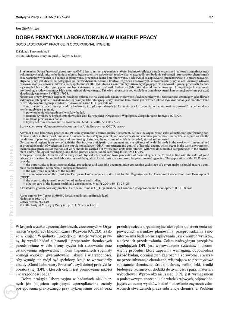 Medycyna Pracy 2004; 55 (1): 27—29 27 Jan Stetkiewicz DOBRA PRAKTYKA LABORATORYJNA W HIGIENIE PRACY GOOD LABORATORY PRACTICE IN OCCUPATIONAL HYGIENE Z Zakładu Patomorfologii Instytut Medycyny Pracy im. prof. J. Nofera w Łodzi STRESZCZENIE Dobra Praktyka Laboratoryjna (DPL) jest to system zapewnienia jakości badań, określający zasady organizacji jednostek organizacyjnych wykonujących niekliniczne badania z zakresu bezpieczeństwa człowieka i środowiska, w szczególności badania substancji i preparatów chemicznych oraz warunków w jakich te badania są planowane, przeprowadzane i monitorowane, a ich wyniki są zapisywane, przechowywane i sprawozdawane. Higiena pracy jest dziedziną polegającą na przewidywaniu, ocenie i kontroli zagrożeń zdrowotnych w środowisku pracy w celu ochrony zdrowia pracowników, jak również zdrowia całej społeczności (IOHA). Ocena i kontrola czynników występujących w środowisku pracy, procesach technologicznych lub metodach pracy powinna być wykonywana przez jednostki badawcze (laboratoria) o udokumentowanych kompetencjach w zakresie monitoringu środowiska pracy i/lub monitoringu biologicznego. Tak więc laboratoria pod względem organizacyjnym i kompetencji powinny posiadać akredytację wg normy EN/ISO 17025. Natomiast przewidywanie zagrożeń powinno opierać się na wynikach badań właściwości fizykochemicznych i toksyczności czynników szkodliwych wykonywanych zgodnie z zasadami dobrej praktyki laboratoryjnej. Certyfikowane laboratoria jak również jakość wyników badań jest monitorowane przez odpowiednie agencje rządowe. Stosowanie zasad DPL pozwala na: n możliwość prześledzenia procedury badawczej i uzyskanych danych (dokumentacja z każdego etapu badań powinna pozwolić na pełne odtworzenie przebiegu badania), n potwierdzenie wiarygodności wyników badań, n uznanie wyników w krajach członkowskich Unii Europejskiej i Organizacji Współpracy Gospodarczej i Rozwoju (OEDC), n unikanie powtarzania badań, n lepszą ochronę zdrowia ludzi i środowiska. Med. Pr. 2004; 55 (1): 27—29 Słowa kluczowe: dobra praktyka laboratoryjna, Unia Europejska, OECD, prawo ABSTRACT Good laboratory practice (GLP) is the system that ensures quality assessment, defines the organization rules of institutions performing nonclinical studies in the area of human and environmental safety in general, and of chemicals and chemical preparations in particular as well as sets the conditions of planning, performing and monitoring of studies, the outcome of which is recorded, stored and reported. Occupational hygiene is an area of activities that involves anticipation, assessment and surveillance of health hazards in the work environment aimed at protecting health of workers and the population at large (IOHA). Assessment and control of harmful agents, which occur in the work environment, technological processes or methods of work should be carried out by research units (laboratories) with well documented competencies in the environment and/or biological monitoring, and those granted accreditation according to EN/ISO 17025. Anticipated risks should be based on analyses of physical, chemical and toxic properties of harmful agents, performed in line with the rules of good laboratory practice. Accredited laboratories and the quality of their tests are monitored by governmental agencies. The application of the GLP system provides: n the opportunity to investigate analytical procedures and data (the documentation concerning each stage of a given analysis should ensure a complete reconstruction of the whole analytical process); n the confirmed reliability of the results; n the recognition of the results in European Union member states and by the Organization for Economic Cooperation and Development (OECD); n the opportunity to avoid repetition of analyses and studies; n a better care of the human health and environment. Med Pr 2004; 55 (1): 27—29 Key words: good laboratory practice, European Union (EU), Organization for Economic Cooperation and Development (OECD), law Adres autora: Św. Teresy 8, 90-950 Łódź, e-mail: [email protected] Nadesłano: 16.01.04 Zatwierdzono: 9.02.04 © 2004, Instytut Medycyny Pracy im. prof. J. Nofera w Łodzi W krajach wysoko uprzemysłowionych, zrzeszonych w Organizacji Współpracy Ekonomicznej i Rozwoju (OECD), a także w krajach Wspólnoty Europejskiej istnieje wymóg prawny, by wyniki badań substancji i preparatów chemicznych przedstawiane w celu oceny ryzyka ich stosowania oraz ustanowienia odpowiednich norm higienicznych spełniały wymogi wysokiej, gwarantowanej jakości i wiarygodności. Aby wymóg ten mógł być spełniony, kraje te wprowadziły zasady „Good Laboratory Practice”, czyli dobrej praktyki laboratoryjnej (DPL), których celem jest promowanie jakości i wiarygodności badań. Dobra praktyka laboratoryjna w badaniach nieklinicznych jest pojęciem opisującym uporządkowane zasady postępowania praktycznego przy wykonywaniu badań oraz przedsięwzięcia organizacyjne niezbędne do stworzenia odpowiednich warunków planowania, przeprowadzania i monitorowania badań oraz zapisywania uzyskiwanych wyników, a także ich przedstawiania. Celem nadrzędnym przepisów regulujących DPL jest wprowadzenie systemów i ustanowienie procedur, które zapewnią wymaganą, odpowiednią jakość badań, oceniających zagrożenia zdrowotne, stwarzane przez substancje chemiczne, włączając w to przemysłowe substancje chemiczne, środki ochrony roślin, leki, środki biobójcze, kosmetyki, dodatki do żywności i pasz, materiały wybuchowe. Wprowadzenie zasad DPL jest wymaganiem o podstawowym znaczeniu dla władz krajowych, odpowiadających za ocenę wyników badań i określanie zagrożeń zdrowotnych stwarzanych przez substancje chemiczne. Problem 28 J. Stetkiewicz jakości badań ma także wymiar międzynarodowy. Jeśli jedne kraje mogą polegać na wynikach badań prowadzonych w innych krajach, to pozwala