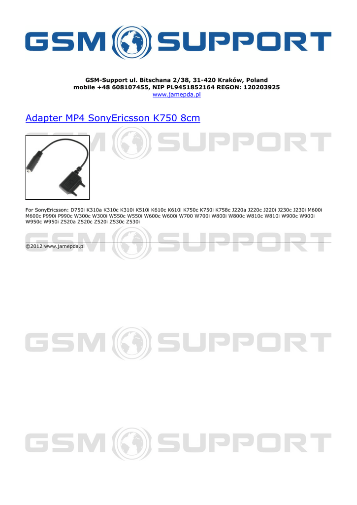 GSM-Support ul. Bitschana 2/38, 31-420 Kraków, Poland mobile +48 608107455, NIP PL9451852164 REGON: 120203925 www.jamepda.pl Adapter MP4 SonyEricsson K750 8cm For SonyEricsson: D750i K310a K310c K310i K510i K610c K610i K750c K750i K758c J220a J220c J220i J230c J230i M600i M600c P990i P990c W300c W300i W550c W550i W600c W600i W700 W700i W800i W800c W810c W810i W900c W900i W950c W950i Z520a Z520c Z520i Z530c Z530i ©2012 www.jamepda.pl Powered by TCPDF (www.tcpdf.org)