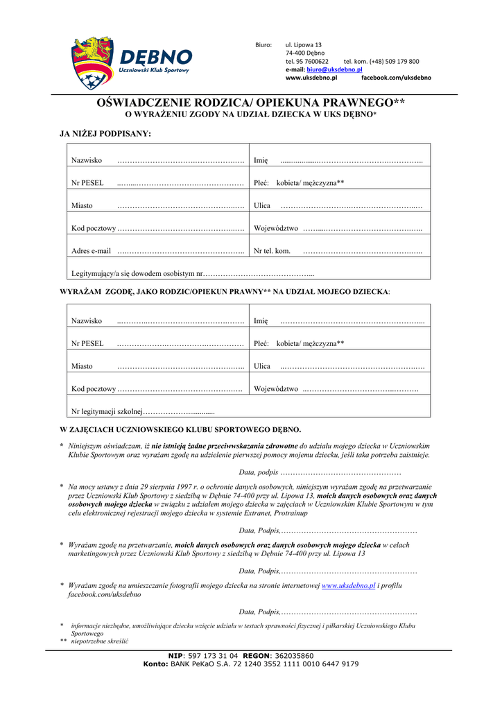 (Oœwiadczenie rodzica UKS DEBNO druk)
