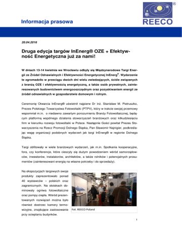 Informacja prasowa 20.04.2016 Druga edycja targów InEnerg® OZE + Efektywność Energetyczna już za nami! W dniach 13-14 kwietnia we Wrocławiu odbyły się Międzynarodowe Targi Ener® gii ze Źródeł Odnawialnych i Efektywności Energetycznej InEnerg . Wydarzenie te zgromadziło w przeciągu dwóch dni wielu zwiedzających, ściśle związanych z branżą OZE i efektywnością energetyczną, a także osób prywatnych, zainteresowanych budownictwem energooszczędnym oraz pozyskiwaniem energii ze źródeł odnawialnych w gospodarstwie domowym i rolnym. Ceremonię Otwarcia InEnerg® uświetnił najpierw Dr inż. Stanisław M. Pietruszko, Prezes Polskiego Towarzystwa Fotowoltaiki (PTPV), który w trakcie swojej przemowy wspomniał m.in. o niedawno zawartym porozumieniu Branży Fotowoltaicznej, będącym platformą wspólnego działania stowarzyszeń branżowych oraz kilkudziesięciu firm w kierunku rozwoju fotowoltaiki w Polsce. Następnie Gości powitał Prezes Stowarzyszenia na Rzecz Promocji Dolnego Śląska, Pan Sławomir Najnigier, podkreślając wagę organizacji podobnych wydarzeń jak targi InEnerg® w regionie Dolnego Śląska. Targi obfitowały w wiele branżowych wydarzeń, jak m.in. Spotkania kooperacyjne, fora, czy konferencje, które cieszyły się dużym powodzeniem wśród samorządowców, inwestorów, instalatorów, architektów, a także rolników i potencjalnych prosumentów (zainteresowani energią na własne potrzeby i do sprzedaży). Na ekspozycjach targowych swoje produkty zaprezentowało ponad 40 wystawców – polskich oraz zagranicznych. Na stoiskach dominowały ogniwa fotowoltaiczne oraz pompy ciepła. Wśród prezentowanych rozwiązań można było również dostrzec kamery termowizyjne, znajdujące zastosowanie Fot. REECO Poland przy ocieplaniu budynków. 1 Informacja prasowa Podczas dwóch dni trwania Targów odwiedzający mieli okazję uczestnictwa w licznych konferencjach oraz forach branżowych. Pierwszego dnia odbyła się II edycja seminarium: „Rozwój inwestycji kogeneracyjnych w Polsce”, podczas którego uczestnicy pozyskali wartościową wiedzę na temat opłacalności takiej inwestycji. Wielu uczestników ściągnęły również Warsztaty: Praktyczne aspekty projektowania i instalowania systemów fotowoltaicznych, prowadzone przez doświadczonych szkoleniowców z Centrum Szkoleniowego Polskiego Towarzystwa Fotowoltaiki. Dodatkowo tego dnia Goście InEnerg® mogli także wziąć udział w bezpłatnych wydarzeniach takich jak: ,,VII Dolnośląskie Forum Energii Odnawialnej'' poświęcone edukacji proekologicznej oraz ,,XV Forum Energia w Gminie'', które zgromadziło liczna grupę przedstawicieli władz lokalnych, a w tym burmistrzów, wójtów, prezydentów miast, działów ochrony środowiska, zamówień publicznych i inwestycji. Z kolei drugiego dnia targów odbyła się konferencja ,,Przyszłość zielonych inwestycji w świetle Ustawy OZE'' oraz wydarzenie dedykowane polskiemu rolnictwu II Dzień Rolnictwa „Rolnik z energia. OZE przyszłością polskiego rolnictwa”, gdzie zostały przedstawione szerokie możliwości płynące z energii odnawialnej dla rolników. "Dzięki InEnerg® Wrocław na 2 dni stał się polską stolicą fotowoltaiki" powiedział Tomasz Jaskot, przedstawiciel firmy PV Energia Polska, wystawca InEnerg®. Biorąc pod uwagę nastroje panujące w branży OZE frekwencja zwiedzających dopisała, co wzbudzało zadowolenie wystawców, którzy mieli okazję promować swoje produkty w szerokim gronie potencjalnych klientów. „Praca nad targami nie należała do łatwych” – podkreśla Małgorzata Bartkowski z firmy REECO Poland „w obliczu niepewności spowodowanej nowelizacją ustawy o OZE, mieliśmy odczynienia z rezygnacją wielu wystawców. To nas jednak nie zniechęciło do tego, aby z ogromnym zaangażowaniem po raz kolejny próbować stworzyć spotkanie branży, które wszystkim zaangażowanym przyniesie wymierne korzyści. Spróbowaliśmy i jesteśmy bardzo zadowoleni. Zainteresowanie OZE w Polsce jest ogromne. Osoby, które odwiedzają nasze targi coraz częściej przekonują się o tym, że czyste technologie nie muszą być drogie. Konkurencja na rynku jest coraz większa, w związku z czym spadające ceny są coraz bardziej przystępne dla przeciętnych osób. Producenci muszą poszukiwać sposobów na tańsze i wydajniejsze wytwarzanie energii ze źródeł odnawialnych. Aby zapewnić wystawcom, ekspertom, przedstawicielom mediów i zwiedzającym jeszcze szersze możliwości odkrywania specyfiki branży oraz poznania nowo2 Informacja prasowa ści technologicznych, już dziś serdecznie zapraszam na kolejne targi organizowane przez REECO Poland. Najbliższą ku temu okazją będzie RENEXPO® Poland, które odbędzie się w dniach 19-21 października w Warszawie.” „Pragniemy serdecznie podziękować wszystkim, z którymi współpracowaliśmy przy tegorocznej edycji InEnerg®: Patronom Honorowym, Partnerom Konferencji, Partnerom Medialnym i wszystkim stowarzyszeniom, które nas wspierały i oczywiście wystawcom. Współpracowaliśmy łącznie z ponad 100 czasopismami i portalami internetowymi z kraju i z zagranicy oraz z około 50 stowarzyszeniami.'' - zakończyła Małgorzata Bartkowski. Organizatorem InEnerg® OZE + Efektywność Energetyczna jest spółka REECO Poland, wchodząca w skład niemieckiej Grupy REECO, która już od 1997 roku organizuje targi i konferencje związane z energią i budownictwem energooszczędnym. Na polskiej scenie targowej jest obecna od 2011 r. Organizowane przez REECO Międzynarodowe Targi Energii Odnawialnej i Efektywności Energetycznej RENEXPO® Poland z roku na rok cieszą się coraz większym zainteresowaniem i mimo krótkiego stażu już zyskały renomę jednego z najważniejszych wydarzeń branżowych w kraju. Więcej informacji na: www.inenerg.com REECO Poland Sp. z o.o. ul. Bartycka 22B/21A 00-716 Warszawa Tel.: +48 (0) 22 266 02 16 Fax: +48 (0) 22 379 78 60 [email