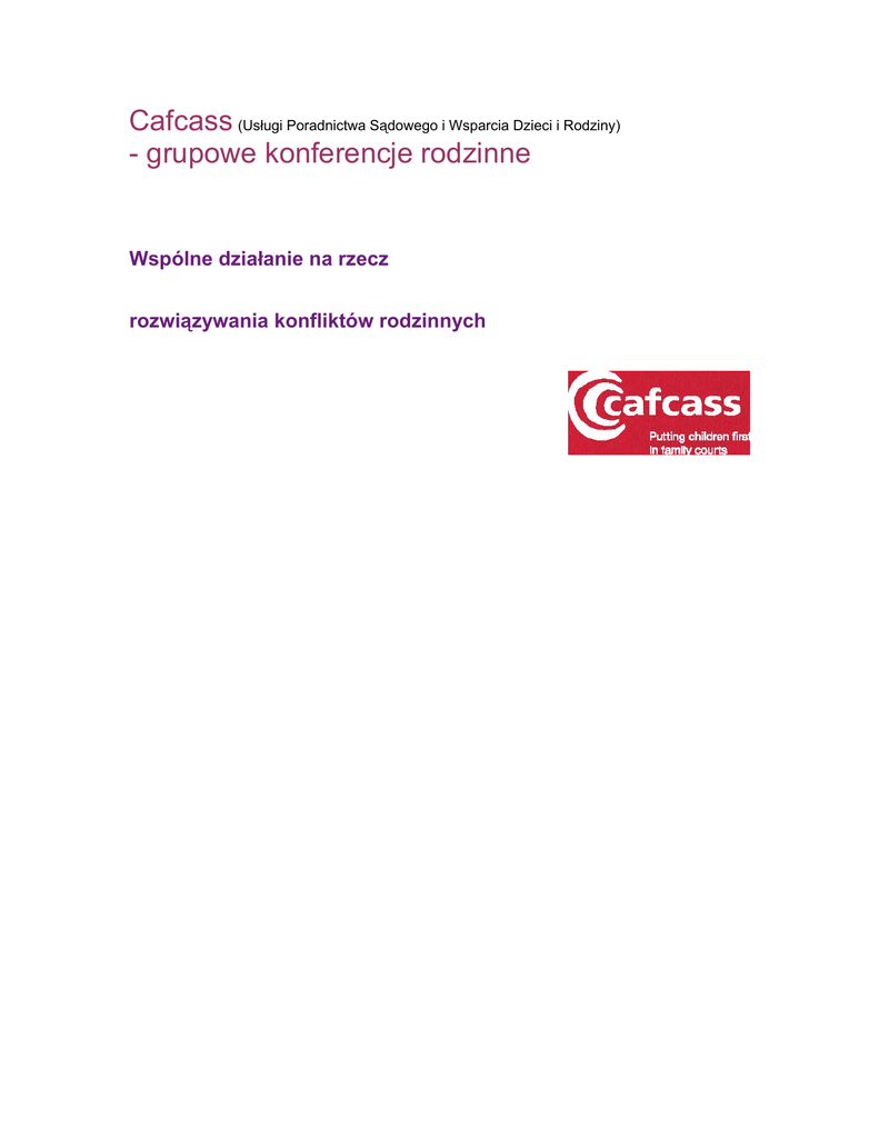 Cafcass (Usługi Poradnictwa Sądowego i Wsparcia Dzieci i Rodziny) - grupowe konferencje rodzinne Wspólne działanie na rzecz rozwiązywania konfliktów rodzinnych Co to jest grupowa konferencja rodzinna? Kiedy rodzice decydują się na separację lub rozwód dzieci mogą odczuwać stratę, złość, smutek, a nawet mieć poczucie winy. Jednak w przypadku, jeśli rodzice wspólnie dochodzą do porozumienia w sprawie kontaktów z dzieckiem i jego miejsca zamieszkania, uczucia te mogą ulec mniejszemu nasileniu. Grupowa konferencja rodzinna stwarza rodzicom, dzieciom, pozostałym członkom rodziny lub przyjaciołom wyjątkową okazję do wspólnego zastanowienia się w jaki sposób rozwiązać zaistniałe problemy. Jest to jeden ze sposobów, aby ułatwić rodzicom przyjęcie wspólnie uzgodnionego planu w stosunku do dzieci i pozwala na uniknięcie sporów i kosztów sądowych. Przygotowanie do konferencji Po uzyskaniu skierowania od Doradcy Sądowego, niezależny koordynator ds. grupowej konferencji rodzinnej zorganizuje spotkanie z Państwem. “Niezależny doradca” oznacza osobę, która nigdy przedtem nie współpracowała z Państwem. Wszyscy niezależni doradcy przechodzą odpowiednie szkolenie. Koordynator pomoże Państwu zdecydować, jakie osoby powinny wziąć udział w konferencji oraz ustali, kiedy i gdzie taka konferencja się odbędzie. Wszystkie osoby uczestniczące w konferencji otrzymają pismo, w którym zostaną powiadomione o godzinie i miejscu konferencji. W zależności od wieku i możliwości percepcyjnych dziecka, koordynator będzie starał się ustalić, jakie są jego życzenia i odczucia. Jest bardzo ważne, aby zachęcić dziecko do udziału w konferencji. Dzieci mają prawo do skorzystania z pomocy własnego rzecznika, który umożliwi im wzięcie udziału w konferencji. Kto powinien uczestniczyć w konferencji? W konferencji powinny uczestniczyć wszystkie osoby, które Państwa zdaniem mogą dopomóc w podjęciu jak najkorzystniejszej decyzji w sprawie dziecka. Mogą to być członkowie Państwa rodziny, przyjaciele lub sąsiedzi. Macie Państwo również prawo do zażądania, aby w konferencji wzięli udział wszyscy specjaliści, którzy dobrze znają Wasze dziecko(np. nauczyciele, pielęgniarki środowiskowe lub pracownicy socjalni). Specjaliści ci będą mogli wyłącznie wyrazić swoją opinię, natomiast nie mogą oni podejmować żadnych decyzji w trakcie konferencji. Jeśli to możliwe, wszystkie osoby, które mają istotny związek z Państwa dzieckiem powinny być zaproszone do udziału w konferencji. W dniu konferencji… Wymiana informacji W czasie pierwszej fazy konferencji następuje wymiana informacji. Koordynator poprosi wszystkich uczestników o przedstawienie się. W przypadku, gdy w konferencji biorą udział specjaliści, zostaną oni poproszeni o podanie wszelkich informacji, które mogą być pomocne w ustalaniu planu działania w stosunku do Państwa dziecka. Podczas konferencji będziecie Państwo mieli okazję zadawać im niezbędne pytania. Czas dla rodziny Jest to najważniejszy moment konferencji. Państwa krewni i przyjaciele będą mieli okazję, aby między sobą przedyskutować i ustalić dalszy plan działania. W tym momencie zarówno specjaliści, jak i koordynator opuszczą salę, aby mieli Państwo możliwość: . . . . . • przedyskutować uzyskane informacje • ustalić plan działania • ustalić, kto i za co będzie odpowiedzialny • ustalić, w jaki sposób zapewnić pomyślną realizację planu • zastanowić się z czyjej pomocy należy skorzystać w przypadku, gdyby plan ten zakończył się niepowodzeniem. Na przedyskutowanie tych zagadnień można poświęcić tyle czasu, ile będzie potrzebne. Koordynator będzie w każdej chwili służył Państwu pomocą. Jeśli nie będziecie Państwo mogli dojść do porozumienia, możecie skorzystać z pomocy koordynatora. Porozumienie Po ustaleniu przez Państwa planu działania w sprawie dziecka, koordynator poprosi specjalistów o ponowne przyłączenie się do konferencji. Następnie koordynator przedstawi ustalony przez Państwa plan działania wszystkim zgromadzonym. Zostanie również ustalone, czy zasadne jest zwoływanie ponownej konferencji po upływie od sześciu do ośmiu miesięcy w celu weryfikacji realizacji przyjętego planu. Jeśli będziecie Państwo potrzebowali jakiegokolwiek wsparcia w celu pomyślnej realizacji przyjętego przez Was planu, Doradca Sądowy będzie służył pomocą w tym względzie. Specjaliści lub sąd mogą nie wyrazić zgody na przyjęty przez Państwa plan tylko w przypadku, jeśli ich zdaniem będzie on narażał Państwa dziecko na jakiekolwiek ryzyko. W takiej sytuacji koordynator poprosi Państwa o ponowne przemyślenie swojej decyzji. Wszyscy biorący udział w spotkaniu, włączając w to dzieci, złożą podpisy pod przyjętym planem, którego kopia zostanie następnie przekazana sądowi. Opinie i komentarze W jaki sposób mogę wyrazić swoją opinię lub złożyć zażalenie? Chcielibyśmy poznać Państwa opinię na temat grupowej konferencji rodzinnej. Po zakończeniu konferencji zostaniecie Państwo poproszeni o wypełnienie kwestionariusza. Państwa uwagi i komentarze pomogą nam podnieść jakość naszych usług. W związku z tym będziemy wdzięczni, jeśli poświęcicie Państwo kilka minut na wypełnienie kwestionariusza. Pragniemy również nawiązać kontakt z rodzinami, które chciałyby porozmawiać z osobami, które planują wzięcie udziału w grupowej konferencji rodzinnej lub już w niej uczestniczyły. Jeśli nie jesteście Państwo zadowoleni ze sposobu, w jaki została zorganizowana grupowa konferencja rodzinna, prosimy o skontaktowanie się z kierownikiem sekcji ds. konferencji rodzinnych. Będziecie Państwo mieli okazję przedstawienia swoich zastrzeżeń i wątpliwości lub też, jeśli zajdzie taka potrzeba, poproszenia kierownika o pomoc w złożeniu zażalenia do Cafcass. Kontakt Cafca