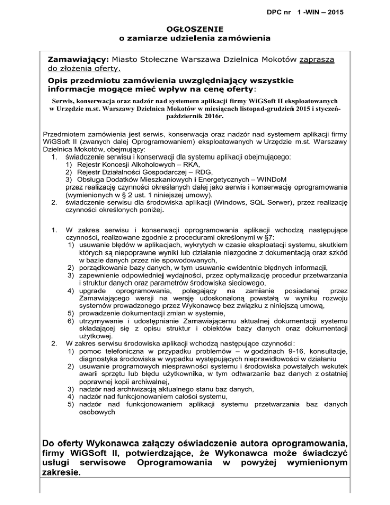 DPC nr 1 -WIN – 2015 OGŁOSZENIE o zamiarze udzielenia zamówienia Zamawiający: Miasto Stołeczne Warszawa Dzielnica Mokotów zaprasza do złożenia oferty. Opis przedmiotu zamówienia uwzględniający wszystkie informacje mogące mieć wpływ na cenę oferty: Serwis, konserwacja oraz nadzór nad systemem aplikacji firmy WiGSoft II eksploatowanych w Urzędzie m.st. Warszawy Dzielnica Mokotów w miesiącach listopad-grudzień 2015 i styczeńpaździernik 2016r. Przedmiotem zamówienia jest serwis, konserwacja oraz nadzór nad systemem aplikacji firmy WiGSoft II (zwanych dalej Oprogramowaniem) eksploatowanych w Urzędzie m.st. Warszawy Dzielnica Mokotów, obejmujący: 1. świadczenie serwisu i konserwacji dla systemu aplikacji obejmującego: 1) Rejestr Koncesji Alkoholowych – RKA, 2) Rejestr Działalności Gospodarczej – RDG, 3) Obsługa Dodatków Mieszkaniowych i Energetycznych – WINDoM przez realizację czynności określanych dalej jako serwis i konserwację oprogramowania (wymienionych w § 2 ust. 1 niniejszej umowy). 2. świadczenie serwisu dla środowiska aplikacji (Windows, SQL Serwer), przez realizację czynności określonych poniżej. 1. 2. W zakres serwisu i konserwacji oprogramowania aplikacji wchodzą następujące czynności, realizowane zgodnie z procedurami określonymi w §7: 1) usuwanie błędów w aplikacjach, wykrytych w czasie eksploatacji systemu, skutkiem których są niepoprawne wyniki lub działanie niezgodne z dokumentacją oraz szkód w bazie danych przez nie spowodowanych, 2) porządkowanie bazy danych, w tym usuwanie ewidentnie błędnych informacji, 3) zapewnienie odpowiedniej wydajności, przez optymalizację procedur przetwarzania i struktur danych oraz parametrów środowiska sieciowego, 4) upgrade oprogramowania, polegający na zamianie posiadanej przez Zamawiającego wersji na wersję udoskonaloną powstałą w wyniku rozwoju systemów prowadzonego przez Wykonawcę bez związku z niniejszą umową, 5) prowadzenie dokumentacji zmian w systemie, 6) utrzymywanie i udostępnianie Zamawiającemu aktualnej dokumentacji systemu składającej się z opisu struktur i obiektów bazy danych oraz dokumentacji użytkowej. W zakres serwisu środowiska aplikacji wchodzą następujące czynności: 1) pomoc telefoniczna w przypadku problemów – w godzinach 9-16, konsultacje, diagnostyka środowiska w wypadku występujących nieprawidłowości w działaniu 2) usuwanie programowych niesprawności systemu i środowiska powstałych wskutek awarii sprzętu lub błędu użytkownika, w tym odtwarzanie baz danych z ostatniej poprawnej kopii archiwalnej, 3) nadzór nad archiwizacją aktualnego stanu baz danych, 4) nadzór nad funkcjonowaniem całości systemu, 5) nadzór nad funkcjonowaniem aplikacji systemu przetwarzania baz danych osobowych Do oferty Wykonawca załączy oświadczenie autora oprogramowania, firmy WiGSoft II, potwierdzające, że Wykonawca może świadczyć usługi serwisowe Oprogramowania w powyżej wymienionym zakresie. Termin realizacji zamówienia: od 02.11.2015r. do 31.10.2016r. Kryterium/kryteria oceny ofert: zgodność oferty z opisem przedmiotu zamówienia i cena Termin składania ofert: 26.10.2015r. Termin związania ofertą: 02.11.2015r. Oferty można składać: faksem, nr faksu: 22 5651441 drogą elektroniczną na adres: [email protected] pisemnie lub osobiście na adres: Wydział Informatyki dla Dzielnicy Mokotów, ul. Rakowiecka 25/27, 02-517 Warszawa Oferta będzie rozpatrywana przez Zamawiającego, jeżeli Zamawiający otrzyma ją przed terminem składania ofert określonym w ogłoszeniu. Komórka organizacyjna Urzędu Dzielnicy Mokotów m.st. Warszawy realizująca wydatek: Wydział Informatyki Osoba do kontaktu: Adam Ostojski tel: 22 5651440 Informacje dodatkowe: 1. Zamawiający będzie rozpatrywał oferty złożone zgodnie ogłoszeniem. 2. Zamawiający udzieli zamówienia wykonawcy, którego oferta zostanie wybrana jako najkorzystniejsza. 3. Niezwłocznie po rozpatrzeniu ofert, w przypadku braku decyzji o unieważnieniu postępowania, informacja o wyborze wykonawcy zostanie zamieszczona na stronie internetowej Urzędu, na której zostało zamieszczone ogłoszenie. 4. Zamawiający zastrzega sobie prawo do zmiany ogłoszenia bez podania przyczyn. 5. Zamawiający zastrzega sobie prawo odwołania ogłoszenia w każdym czasie bez podawania przyczyn. 6. W sprawie nie ujętych w ogłoszeniu mają zastosowanie przepisy kodeksu cywilnego. Załączniki 1. wzór/projekt umowy 2. wzór oferty /-/ Adam Ostojski Naczelnik Wydziału Informatyki .................................................... data, podpis i pieczątka kierownika komórki organizacyjnej realizującej wydatek
