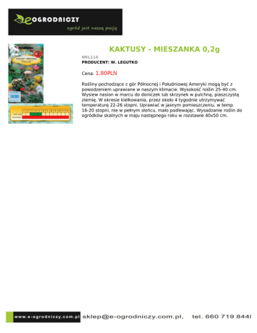 KAKTUSY - MIESZANKA 0,2g NKL114 PRODUCENT: W. LEGUTKO Cena: 1.80PLN Rośliny pochodzące z gór Północnej i Południowej Ameryki mogą być z powodzeniem uprawiane w naszym klimacie. Wysokość roślin 25-40 cm. Wysiew nasion w marcu do doniczek lub skrzynek w pulchną, piaszczystą ziemię. W okresie kiełkowania, przez około 4 tygodnie utrzymywać temperaturę 22-26 stopni. Uprawiać w jasnym pomieszczeniu, w temp. 16-20 stopni, nie w pełnym słońcu, mało podlewając. Wysadzanie roślin do ogródków skalnych w maju następnego roku w rozstawie 40x50 cm.