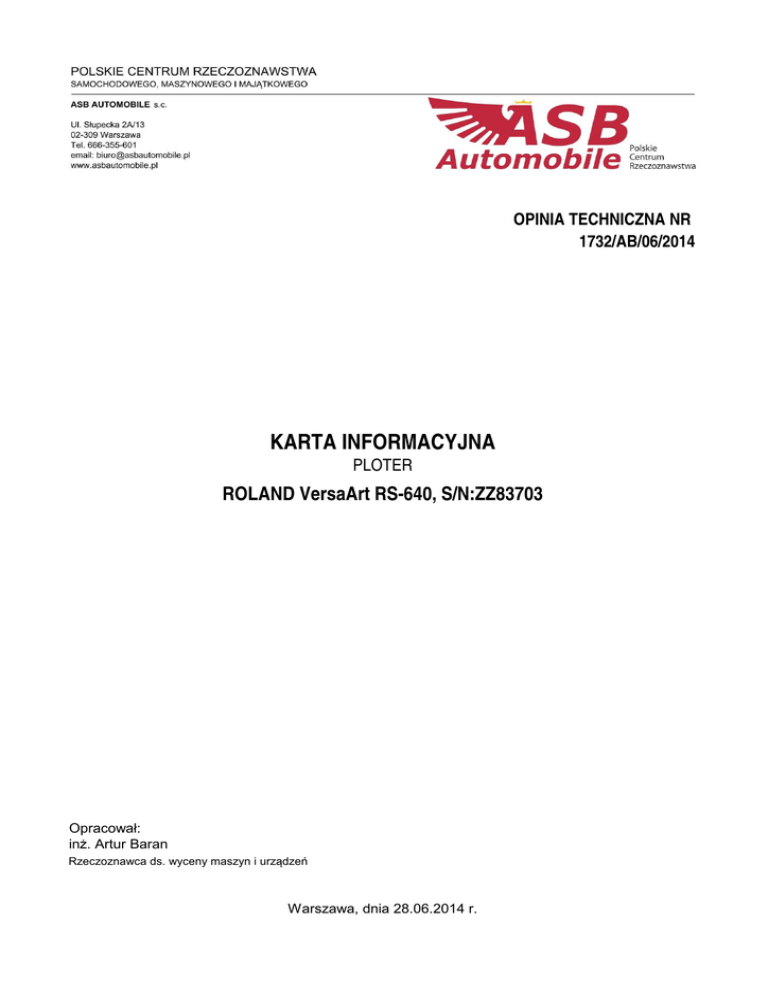 OPINIA TECHNICZNA NR 1732/AB/06/2014 KARTA INFORMACYJNA PLOTER ROLAND VersaArt RS-640, S/N:ZZ83703 Opracował: inż. Artur Baran Rzeczoznawca ds. wyceny maszyn i urządzeń Warszawa, dnia 28.06.2014 r. 2 01. ZAMAWIAJĄCY SG Equipment Leasing Polska Sp. z o.o. 00-102 Warszawa, ul. Marszałkowska 111 02. UŻYTKOWNIK Brak 03. PRZEDMIOT WYCENY PLOTER Roland Versa Art. RS-640 wyprodukowany/na przez firmę Roland DG Corporation Japonia 04. CEL WYCENY Celem wyceny jest oszacowanie indywidualnej wartości rynkowej maszyny Roland Versa Art. RS-640 05. PODSTAWA METODOLOGICZNA WYCENY Aby spełnić cel i przeznaczenie wyceny zdefiniowana w następujący sposób. określona zostanie wartość rynkowa środka technicznego WARTOŚĆ RYNKOWA jest definiowana jako racjonalnie określona ilość pieniędzy, którą chętny kupujący będzie skłonny zaoferować chętnemu sprzedającemu w zamian za przedmiot transakcji przy założeniu równości stron, bez istnienia żadnego przymusu wpływającego na decyzję o zakupie i sprzedaży, przy pełnej znajomości przedmiotu i okoliczności transakcji, w określonym czasie. Zakłada się odpowiednio długi czas wyeksponowania przedmiotu sprzedaży na nieograniczonym, tzn. o wolnym dostępie, rynku. Powyższa wartość uwzględnia m.in. rodzaj i zastosowanie maszyny, jej wytwórcę, konstrukcję, wyposażenie, stan techniczny, stopień zużycia i wiek środka technicznego, okres i sposób eksploatacji, a także warunki popytu i podaży określające atrakcyjność rynkową. Podstawą wyceny w wyżej wymienionym celu są: - szczegółowa identyfikacja przedmiotu wyceny, - ustalenia dotyczące kompletności i sprawności maszyny, - ustalenia dotyczące eksploatacji (warunki, czas, konserwacja, naprawa) i możliwości dalszego użytkowania. Wycena zostanie wykonana w podejściu porównawczym. W tym celu zostaną ustalone ceny ofertowe porównywalnych maszyn na rynku wtórnym. Podstawą porównania są dane zawarte w ofertach sprzętu używanego firm handlowych dostępne w Internecie tj. Karta informacyjnai nr 1732/AB/06/2014 Rzeczoznawca inż. Artur Baran 3 06. PODSTAWA WYCENY Wycenę wykonano w oparciu o oględziny z dnia 21.06.2014 w miejscowości Macierzysz, ul. Wojska Polskaiego 7 na terenie magazynu, gdzie znajduje się przedmiotowa maszyna. Oględziny przeprowadzono przy oświetleniu dziennym, bez użycia specjalistycznego sprzętu diagnostycznego. Maszyna nie była uruchomiana. W czasie oględzin nie przedstawiono żadnych dokumentów maszyny. 07. KWESTIONARIUSZ INFORMACYJNY ŚRODKA TECHNICZNEGO INFORMACJE OGÓLNE 1. Nazwa środka technicznego PLOTER 2. Wytwórca ROLAND 3. Model RS-640 4. Numer seryjny ZZ83703 5. Rok produkcji 2010 6. Czas pracy (odczytany) [h] b.d. PLOTER ROLAND RS-640 Ploter jest komputerowym urządzeniem peryferyjnym, służącym do pracy z dużymi płaskimi powierzchniami, mogące nanosić obrazy, wycinać wzory, grawerować, itp.. Plotery ten jest czterogłowicowym ploterem solwentowym pracującym w technologii CMYK. 7. Przeznaczenie 8. Technologia druku Piezoelektryczna 9. Max. szerokość nośnika [mm] 1625 10. Max. szerokość druku [mm] 1615 11. Max.średnica rolki nośnika [mm] 210 12. Max.waga rolki nośnika [kg] 40 13. Max.rozdzielczość druku [dpi] 1440 14. Max,szybkość druku [m2/h] 21,4 15. System podgrzewania materiału grzałka stołu pod głowicami i za głowicami regulowana w zakresie 30-45 C 16. Funkcja ochrony energii automatyczna 17. Zasilanie [V] AC 220-240 18. Pobór prądu w trakcie pracy [W] 1030 19. Pobór prądu w trakcie oczekiwania [W] 16 20. Wymiary [mm] 2,57 x 740 x 1103 21. Waga z podstawą [kg] 133 22. Pobór prądu w trakcie oczekiwania [W] 16 23. Wyposażenie podstawa plotera 24. Stan techniczny Urzadzenie w wizualnym dobrym stanie technicznym, zabezpieczone folią. Nie stwierdzono uszkodzeń mechanicznych Karta informacyjnai nr 1732/AB/06/2014 Rzeczoznawca inż. Artur Baran 4 ZASTRZEŻENIA OGRANICZAJĄCE 1. 2. 3. Powyższe oszacowanie określa: indywidualną wartość rynkową maszyny ustaloną w podejściu porównawczym. Podana wartość jest wartością netto. Wartość przedmiotu wyceny została ustalona na dzień sporządzenia wyceny. Niniejsze opracowanie nie może być wykorzystane do żadnego innego celu niż określony w punkcie 04 i nie może być publikowane w całości w jakimkolwiek dokumencie bez zgody wykonawców i bez uzgodnienia z nimi formy i treści takiej publikacji. 4. Rzeczoznawca nie bierze na siebie odpowiedzialności za wady ukryte (prawne i fizyczne) oraz ewentualne skutki wynikające z dalszego użytkowania przedmiotu wyceny, a także za skutki wykorzystania samej wyceny. 5. Wykonawca nie ponosi także odpowiedzialności za ewentualne wady wyceny powstałe z oparcia się na stanie przedmiotu wyceny wynikającym z przedstawionych mu przez użytkownika informacji, jeśli brak było podstaw do kwestionowania ich zgodności ze stanem rzeczywistym, lub też ustalenie stanu rzeczywistego przez wykonawcę było niemożliwe, lub znacznie utrudnione. Niniejsze oszacowanie wartości nie jest ekspertyzą stanu technicznego przedmiotów wyceny i za taką nie może być uznawane. 6. 7. 8. Powyższa wycena wartości w szczególności nie może być traktowana jako gwarancja sprzedaży przedmiotu wyceny za oszacowaną wartość. Nie badano tytułu użytkowania ani tytułu własności wycenianego obiektu oraz ewentualnego istnienia ograniczonych praw rzeczowych. Załączniki: 1. Dokumentacja fotograficzna. Opracował uprawniony rzeczoznawca ds. wyceny maszyn i urządzeń inż. Artur Baran Karta informacyjnai nr 1732/AB/06/2014 Rzeczoznawca inż. Artur Baran 5 DOKUMENTACJA FOTOGRAFICZNA Fot.1. Fot.2. Karta informacyjnai nr 1732/AB/06/2014 Rzeczoznawca inż. Artur Baran 6 DOKUMENTACJA FOTOGRAFICZNA Fot.3. Fot.4. Karta informacyjnai nr 1732/AB/06/2014 Rzeczoznawca inż. Artur Baran 7 DOKUMENTACJA FOTOGRAFICZNA Fot.5. Fot.6. Karta informacyjnai nr 1732/AB/06/2014 Rzeczoznawca inż. Artur Baran