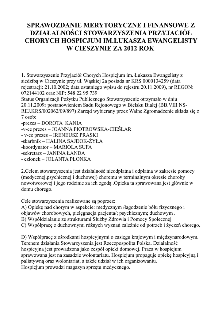 SPRAWOZDANIE MERYTORYCZNE I FINANSOWE Z DZIAŁALNOŚCI STOWARZYSZENIA PRZYJACIÓŁ CHORYCH HOSPICJUM IM.ŁUKASZA EWANGELISTY W CIESZYNIE ZA 2012 ROK 1. Stowarzyszenie Przyjaciół Chorych Hospicjum im. Łukasza Ewangelisty z siedzibą w Cieszynie przy ul. Wąskiej 2a posiada nr KRS 0000134259 (data rejestracji: 21.10.2002; data ostatniego wpisu do rejestru 20.11.2009), nr REGON: 072144102 oraz NIP: 548 22 95 739 Status Organizacji Pożytku Publicznego Stowarzyszenie otrzymało w dniu 20.11.2009r postanowieniem Sadu Rejonowego w Bielsku Białej (BB.VIII NSREJ.KRS/002062/09/897) Zarząd wybierany przez Walne Zgromadzenie składa się z 7 osób: -prezes – DOROTA KANIA -v-ce prezes – JOANNA PIOTROWSKA-CIEŚLAR - v-ce prezes – IRENEUSZ PRASKI -skarbnik – HALINA SAJDOK-ŻYŁA -koordynator – MARIOLA SUFA -sekretarz – JANINA ŁANDA - członek – JOLANTA PŁONKA 2.Celem stowarzyszenia jest działalność nieodpłatna i odpłatna w zakresie pomocy (medycznej,psychicznej i duchowej) choremu w terminalnym okresie choroby nowotworowej i jego rodzinie za ich zgodą .Opieka ta sprawowana jest głównie w domu chorego. Cele stowarzyszenia realizowane są poprzez: A) Opiekę nad chorym w aspekcie: medycznym /łagodzenie bólu fizycznego i objawów chorobowych, pielęgnacja pacjenta/; psychicznym; duchowym . B) Współdziałanie ze strukturami Służby Zdrowia i Pomocy Społecznej C) Współpracę z duchownymi różnych wyznań zależnie od potrzeb i życzeń chorego. D) Współpracę z ośrodkami hospicyjnymi o zasięgu krajowym i międzynarodowym. Terenem działania Stowarzyszenia jest Rzeczpospolita Polska. Działalność hospicyjna jest prowadzona jako zespół opieki domowej. Praca w hospicjum sprawowana jest na zasadzie wolontariatu. Hospicjum propaguje opiekę hospicyjną i paliatywną oraz wolontariat, a także udział w ich organizowaniu. Hospicjum prowadzi magazyn sprzętu medycznego. 3. SPRAWOZDANIE MERYTORYCZNE ZA ROK 2012: A)Walne Zebranie – 8.03.2012-nowy Zarząd B)Organizacja koncertów charytatywnych: - 8.01.2012 – „Wałasi” – Cafe Muzeum - 15.01.2012 – zespoły regionalne i kapele /Istebna,Słowacja/ – kościół OO.Bonifratrów -17.02 2012 – Koncert Walentynkowy-Teatr im.A.Mickiewicza -23.03. 2012 – Wieczór poetycki wolontariuszki Małgorzaty Szklorz-Cafe Muzeum -20.10.2012 - Koncert Jesienny z udziałem Andrzeja Rosiewicza-Teatr w Cieszynie C)Kampania :POLA NADZIEI -przemarsze,inscenizacje,konkursy plastyczne w szkołach i przedszkolach -marzec/kwiecień 2012 -sadzenie cebulek żonkili -październik 2012 -zbiórki finansowe(przed kościołami,przed Kauflandem i Castoramą) C.Kwesty i kiermasze świąteczne (marzec i grudzień 2012) D)Udział w szkoleniach, rekolekcjach, warsztatach wyjazdowych dla wolontariuszy: Kokoszyce – maj 2012 Kraków – czerwiec 2012 Hałcnów – wrzesień 2012 Sopot - sierpień 2012 Żory -listopad 2012 Cieszyngrudzień 2012 Katowice – grudzień 2012 E)Wsparcie dla dzieci osieroconych: -kulig dla dzieci – luty 2012 -wycieczka do ZOO w Ostrawie-czerwiec 2012 -Maraton pływacki – czerwiec 2012 -zakup oddzieży we współpracy z Fundacją Hospicyjną z Gdańska -zakup wyprawek szkolnych -warsztaty ceramiczne na Zamku- listopad 2012 F)Zakup i wypożyczanie sprzętu medycznego (liczba wypożyczeń – 81 na rok) G) Dofinansowanie dla osób dojeżdżających do ośrodków leczenia (5 osób -docelowo raz na kwartał) H) Liczba pacjentów objętych naszą pomocą – 52osoby (w tym 2 dzieci) 4.Dotacje: -Starostwo Powiatowe: "RODZINA W POTRZEBIE" – 1500zł "POPRAWA KONDYCJI PSYCHOFIZYCZNEJ WOLONTARIUSZY HOSPICJUM IM.ŁUKASZA EWANG. W CIESZYNIE" – 750zł -Gmina Cieszyn: "BYC BLIŻEJ CIEBIE CHCĘ" – 7000zł