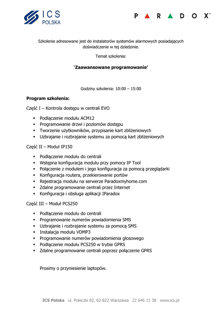 Szkolenie adresowane jest do instalatorów systemów alarmowych posiadających doświadczenie w tej dziedzinie. Temat szkolenia: ‘Zaawansowane programowanie’ Godziny szkolenia: 10:00 – 15:00 Program szkolenia: Część I – Kontrola dostępu w centrali EVO Podłączenie modułu ACM12 Programowanie drzwi i poziomów dostępu Tworzenie użytkowników, przypisanie kart zbliżeniowych Uzbrajanie i rozbrajanie systemu za pomocą kart zbliżeniowych Część II – Moduł IP150 Podłączenie modułu do centrali Wstępna konfiguracja modułu przy pomocy IP Tool Połączenie z modułem i jego konfiguracja za pomocą przeglądarki Konfiguracja routera, przekierowanie portów Rejestracja modułu na serwerze Paradoxmyhome.com Zdalne programowanie centrali przez Internet Konfiguracja i obsługa aplikacji IParadox Część III – Moduł PCS250 Podłączenie modułu do centrali Programowanie numerów powiadomienia SMS Uzbrajanie i rozbrajanie systemu za pomocą SMS Instalacja modułu VDMP3 Programowanie numerów powiadomienia głosowego Podłączenie modułu PCS250 w trybie GPRS Zdalne programowanie centrali poprzez połączenie GPRS Prosimy o przyniesienie laptopów. ICS Polska ul. Poleczki 82, 02-822 Warszawa 22 646 11 38 www.ics.pl