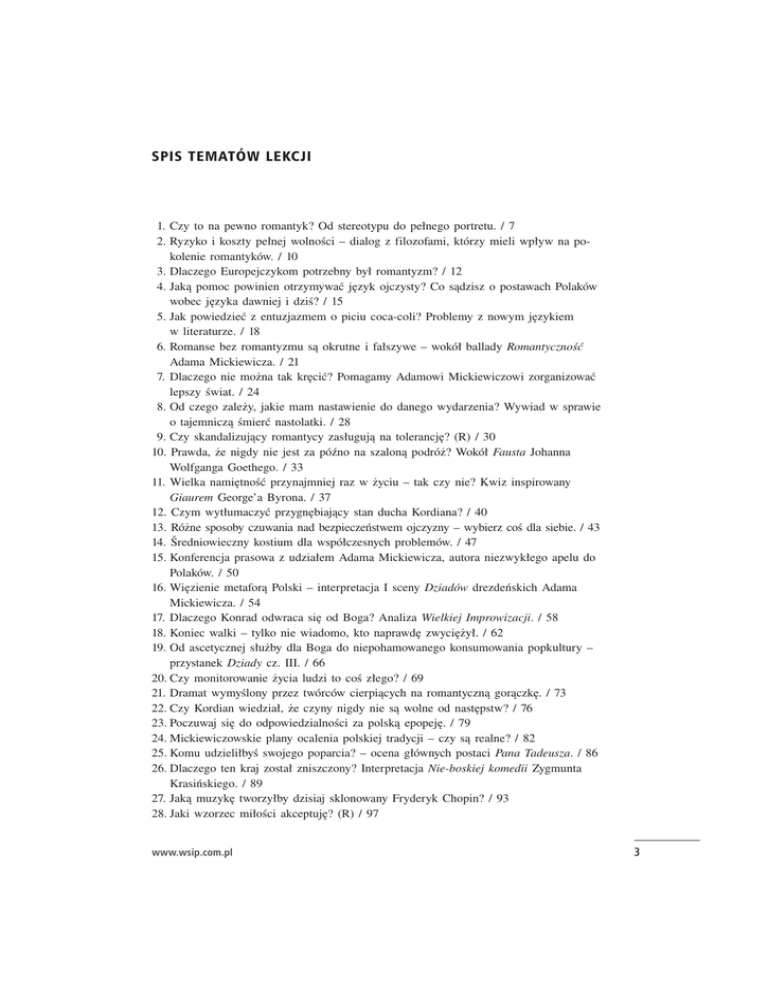 SPIS TEMATÓW LEKCJI 1. Czy to na pewno romantyk? Od stereotypu do pełnego portretu. / 7 2. Ryzyko i koszty pełnej wolności – dialog z filozofami, którzy mieli wpływ na pokolenie romantyków. / 10 3. Dlaczego Europejczykom potrzebny był romantyzm? / 12 4. Jaką pomoc powinien otrzymywać język ojczysty? Co sądzisz o postawach Polaków wobec języka dawniej i dziś? / 15 5. Jak powiedzieć z entuzjazmem o piciu coca-coli? Problemy z nowym językiem w literaturze. / 18 6. Romanse bez romantyzmu są okrutne i fałszywe – wokół ballady Romantyczność Adama Mickiewicza. / 21 7. Dlaczego nie można tak kręcić? Pomagamy Adamowi Mickiewiczowi zorganizować lepszy świat. / 24 8. Od czego zależy, jakie mam nastawienie do danego wydarzenia? Wywiad w sprawie o tajemniczą śmierć nastolatki. / 28 9. Czy skandalizujący romantycy zasługują na tolerancję? (R) / 30 10. Prawda, że nigdy nie jest za późno na szaloną podróż? Wokół Fausta Johanna Wolfganga Goethego. / 33 11. Wielka namiętność przynajmniej raz w życiu – tak czy nie? Kwiz inspirowany Giaurem George’a Byrona. / 37 12. Czym wytłumaczyć przygnębiający stan ducha Kordiana? / 40 13. Różne sposoby czuwania nad bezpieczeństwem ojczyzny – wybierz coś dla siebie. / 43 14. Średniowieczny kostium dla współczesnych problemów. / 47 15. Konferencja prasowa z udziałem Adama Mickiewicza, autora niezwykłego apelu do Polaków. / 50 16. Więzienie metaforą Polski – interpretacja I sceny Dziadów drezdeńskich Adama Mickiewicza. / 54 17. Dlaczego Konrad odwraca się od Boga? Analiza Wielkiej Improwizacji. / 58 18. Koniec walki – tylko nie wiadomo, kto naprawdę zwyciężył. / 62 19. Od ascetycznej służby dla Boga do niepohamowanego konsumowania popkultury – przystanek Dziady cz. III. / 66 20. Czy monitorowanie życia ludzi to coś złego? / 69 21. Dramat wymyślony przez twórców cierpiących na romantyczną gorączkę. / 73 22. Czy Kordian wiedział, że czyny nigdy nie są wolne od następstw? / 76 23. Poczuwaj się do odpowiedzialności za polską epopeję. / 79 24. Mickiewiczowskie plany ocalenia polskiej tradycji – czy są realne? / 82 25. Komu udzieliłbyś swojego poparcia? – ocena głównych postaci Pana Tadeusza. / 86 26. Dlaczego ten kraj został zniszczony? Interpretacja Nie-boskiej komedii Zygmunta Krasińskiego. / 89 27. Jaką muzykę tworzyłby dzisiaj sklonowany Fryderyk Chopin? / 93 28. Jaki wzorzec miłości akceptuję? (R) / 97 www.wsip.com.pl 3 29. Dlaczego bawi nas świat, który nie istnieje? Analiza i interpretacja wybranej sceny Ślubów panieńskich Aleksandra Fredry. / 100 30. Debata telewizyjna na temat literatury romantyzmu w programie szkolnym. (R) / 104 *** 31. Naprzeciw jakim potrzebom wychodzą twórcy nowej epoki – pozytywizmu? / 108 32. Początek rozkwitu gospodarczego czy niepewna przyszłość? Ocena polskich programów pozytywistycznych. / 111 33. Poetów powinno się dyscyplinować, aby byli użyteczni dla społeczeństwa. / 115 34. Dlaczego dziennikarze zmieniają świat? / 118 35. Fantazja czy rzeczywistość, czyli jak pisać felieton. / 121 36. Dlaczego niektórzy decydują się wykorzystywać swoich rodziców? Próba zrozumienia zachowania córek Goriota. / 126 37. Dlaczego przewrotne teorie znajdują posłuch? Skutki demagogii Vautrina i jemu podobnych. / 129 38. Od odtwarzania rzeczywistości do budowania świata wirtualnego – co mają ze sobą wspólnego słowa realny i wirtualny? / 133 39. Co zrobić, by czyny dzielnych ludzi nigdy nie poszły w niepamięć? / 136 40. Czat z Bolesławem Prusem, autorem bestsellerowej powieści pt. Lalka. / 141 41. Międzynarodowa firma Who is Who chce umieścić biogram słynnego kupca w najnowszym wydaniu leksykonu. / 145 42. Co jest najważniejsze dla bohaterów Lalki i Ojca Goriot? Porównanie systemu wartości paryżan i warszawiaków żyjących w XIX wieku. (R) / 150 43. Czy pisarze wiedzą, jakie są naprawdę kobiety? (R) / 154 44. W mojej dzielnicy... – czyli jak napisałby to rasowy pozytywista. / 158 45. Niewłaściwy styl czy błędne rozumowanie? Ćwiczenia w poprawianiu i pisaniu od nowa. / 162 46. Od gromadzenia faktów do pisania dobrego tekstu – miniwarsztaty dziennikarskie. (R) / 166 47. Przymuszanie czy przekonywanie – jak wpłynąć na stosunek Polaków do innych nacji? / 169 48. Przygotowanie do turnieju gier zespołowych – nowele Bolesława Prusa. / 173 49. Przygotowanie do turnieju gier zespołowych – nowele Marii Konopnickiej. / 176 50. Przygotowanie do turnieju gier zespołowych – nowele Henryka Sienkiewicza. / 179 51. Nowele polskich pozytywistów – turniej gier zespołowych. / 183 52. Kiedy przyczyna samotności tkwi w nas samych? Program pomocy dla Raskolnikowa. / 187 53. Czy informacje w mediach przyczyniają się do zapobiegania zbrodniom, czy do ich szerzenia? / 190 54. Gryźć się z problemami w milczeniu czy skorzystać z czyjejś pomocy? Tylko kto mnie zrozumie – od własnych lęków do rozterek Raskolnikowa. (R) / 194 55. Współczesność pobiera lekcje od historii. / 197 56. Potop Henryka Sienkiewicza w wersji komiksowej – co o tym myślisz? / 200 4 57. Dlaczego powieści historyczne Henryka Sienkiewicza wprawiają niektórych Polaków w zakłopotanie, a nawet gorszą? (R) / 203 58. Jaką formę stylistyczną nadać temu tekstowi? Ćwiczenia w redagowaniu wypowiedzi pisemnej. / 208 59. Pomyśl, zanim napiszesz – ćwiczenia w dobieraniu właściwych synonimów. / 212 60. Co można zarzucić literaturze realistycznej? Brak realizmu – odpowiadają naturaliści. / 215 *** 61. Co zmieniło się po stu latach? Różnice między młodopolskim i dzisiejszym stylem życia. / 219 62. Po co artyści tworzą sztukę? (R) / 221 63. Obrazy pełne znaczeń – ćwiczenia w twórczym odbiorze sztuki. / 224 64. Czy można mówić o dwóch portretach modernistycznego artysty (męskim i żeńskim), czy o jednym? (R) / 228 65. Dlaczego żadne drwiny nie zamknęły ust poe