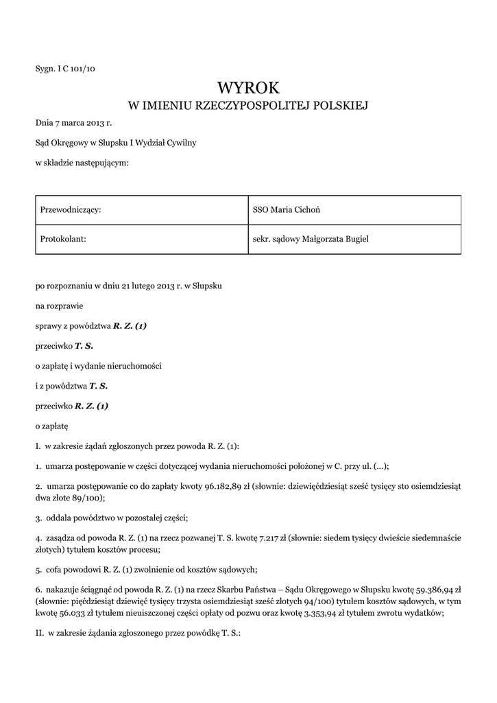 Sygn. I C 101/10 WYROK W IMIENIU RZECZYPOSPOLITEJ POLSKIEJ Dnia 7 marca 2013 r. Sąd Okręgowy w Słupsku I Wydział Cywilny w składzie następującym: Przewodniczący: SSO Maria Cichoń Protokolant: sekr. sądowy Małgorzata Bugiel po rozpoznaniu w dniu 21 lutego 2013 r. w Słupsku na rozprawie sprawy z powództwa R. Z. (1) przeciwko T. S. o zapłatę i wydanie nieruchomości i z powództwa T. S. przeciwko R. Z. (1) o zapłatę I. w zakresie żądań zgłoszonych przez powoda R. Z. (1): 1. umarza postępowanie w części dotyczącej wydania nieruchomości położonej w C. przy ul. (...); 2. umarza postępowanie co do zapłaty kwoty 96.182,89 zł (słownie: dziewięćdziesiąt sześć tysięcy sto osiemdziesiąt dwa złote 89/100); 3. oddala powództwo w pozostałej części; 4. zasądza od powoda R. Z. (1) na rzecz pozwanej T. S. kwotę 7.217 zł (słownie: siedem tysięcy dwieście siedemnaście złotych) tytułem kosztów procesu; 5. cofa powodowi R. Z. (1) zwolnienie od kosztów sądowych; 6. nakazuje ściągnąć od powoda R. Z. (1) na rzecz Skarbu Państwa – Sądu Okręgowego w Słupsku kwotę 59.386,94 zł (słownie: pięćdziesiąt dziewięć tysięcy trzysta osiemdziesiąt sześć złotych 94/100) tytułem kosztów sądowych, w tym kwotę 56.033 zł tytułem nieuiszczonej części opłaty od pozwu oraz kwotę 3.353,94 zł tytułem zwrotu wydatków; II. w zakresie żądania zgłoszonego przez powódkę T. S.: 1. zasądza od pozwanego R. Z. (1) na rzecz powódki T. S. kwotę 20.000 zł (słownie: dwadzieścia tysięcy złotych) wraz z ustawowymi odsetkami od dnia 23 lipca 2009 r. do dnia zapłaty; 2. oddala powództwo w pozostałej części; 3. ustala, iż powódka wygrała proces w 7%, a pozwany w 63%, szczegółowe wyliczenie kosztów obciążających strony pozostawia referendarzowi sądowemu. Na oryginale właściwy podpis. Sygn. I C 101/10 UZASADNIENIE Powód R. Z. (1) w pozwie z dn.17.04.2010r. skierowanym przeciwko T. S. domagał się od pozwanej wydania nieruchomości położonej w C. przy ul. (...) oraz zasądzenia na jego rzecz kwoty 120.000 zł tytułem pobranych przez pozwaną czynszów najmu za wynajem powyższej nieruchomości za okres od lutego 2009r. do kwietnia 2010r. W uzasadnieniu pozwu powód podniósł, iż na skutek wypowiedzenia przez niego umowy leasingu, na podstawie której pozwana korzystała ze spornej nieruchomości, utraciła ona tytuł prawny do tejże nieruchomości, a więc również pobierania z niej pożytków w postaci czynszów za wynajem lokali położonych w tej nieruchomości, od lutego 2009r. z tego też względu zasądzone jest również jego żądanie co do wydania spornej nieruchomości. W piśmie procesowym z dnia 1 lutego 2012r. (k. 163 akt) powód wniósł o umorzenie postępowania w części dotyczącej roszczenia wydania nieruchomości z uwagi na przybicie? I przysądzenie własności nieruchomości na rzecz osoby trzeciej w toku postępowania egzekucyjnego prowadzonego przez komornika sądowego. Nadto powód rozszerzył żądanie dotyczące zapłaty, domagając się zasądzenia od pozwanej – obok kwoty 120.000 zł. zgłoszonej w pozwie – dalszej kwoty po 10.000zł. miesięcznie za okres od marca 2010r. do grudnia 2011r. wraz z odsetkami za każdy miesiąc łącznie 220.000 zł. Tytułem zwrotu pożytków, które pozwana uzyskała z przedmiotowej nieruchomości w okresie od marca 2010r. do grudnia 2011r. W piśmie procesowym z dnia 20 lutego 2013r. (k. 334 akt) powód rozszerzył powództwo o dalszą kwotę 28.645,82 zł., z tytułu niezapłaconych rat leasingowych nr 90 do nr 95 za okres od 22.04.2011r. do 22.10.2011r., z zastrzeżeniem, iż nie stanowi to zrzeczenia się roszczeń co do pozostałych nierozliczonych rat. Pozwana T. S. w odpowiedzi na pozew wniosła o oddalenie powództwa, podnosząc, iż wskutek wieloletnich sporów doszło do zagmatwania wzajemnych rozliczeń stron z tytułu wiążących strony dwóch umów leasingowych, w tym jednej dotyczącej nieruchomości przy ul. (...) w C.. Pozwana podniosła, iż obawiając się, że powód nie wywiąże się z żadnej z umów leasingu – zaprzestała płatności dalszych rat leasingowych. Podniosła dalej, że nie uchyla się od kontynuowania przedmiotowej umowy leasingowej – chciałaby rozliczyć się z powodem i doprowadzić do odzyskania własności nieruchomości, przy ul. (...) w C.. II. Powódka T. S. (w sprawie IC 78/11) w pozwie z dnia 10.03.2011r. domagała się zasądzenia od pozwanego R. Z. (1) kwoty 10.000zł. z ustawowymi odsetkami od dnia 1.04.2007r. tytułem części odszkodowania za szkodę, którą poniosła na skutek nie wywiązania się przez pozwanego z umowy leasingu z dn. 22.12.2003r. dotyczącej nieruchomości położonej w C. przy ul. (...). W piśmie z dnia 18.03.2011 (k.12 akt IC 78/11) powódka rozszerzyła powództwo do kwoty 107.550,08 zł. obejmującą całe świadczenie, które uiściła - na poczet rat leasingowych z tytułu umowy leasingu z dn. 22.12.2003r. Następnie na rozprawie w dniu 23.02.2012r (k. 69 akt IC 78/11) powódka zmieniła żądanie domagając się zapłaty kwoty 289.500 zł, w tym 160.000 zł tytułem wartości nieruchomości, którą utraciła w związku z niewywiązania się przez R. Z. (1) z umowy leasingu i kwoty 129.500 zł tytułem utraconych korzyści związanych z wynajmem tego lokalu za okres od lutego 2009r do lutego 2012r. Pozwany R. Z. (1) wniósł o oddalenie powództwa, zgłaszając zarzut przedawnienia roszczeń wynikających z umowy leasingowej z dn. 22.12.2003r. W uzasadnieniu swojego stanowiska pozwany podniósł, iż żądanie powódki jest związane z prowadzoną przez strony działalnością gospodarczą i podlega trzyletniemu przedawnieniu. Umowa leasingu z dn. 22.12.2003r została zakończona w dniu 21.11.2006r, a więc w chwili wytoczenia powództwa roszczenie powódki było już przedawnione. Nadto, z ostrożności procesowej, zakwestionował pozwany wysokość poniesionej przez powódkę