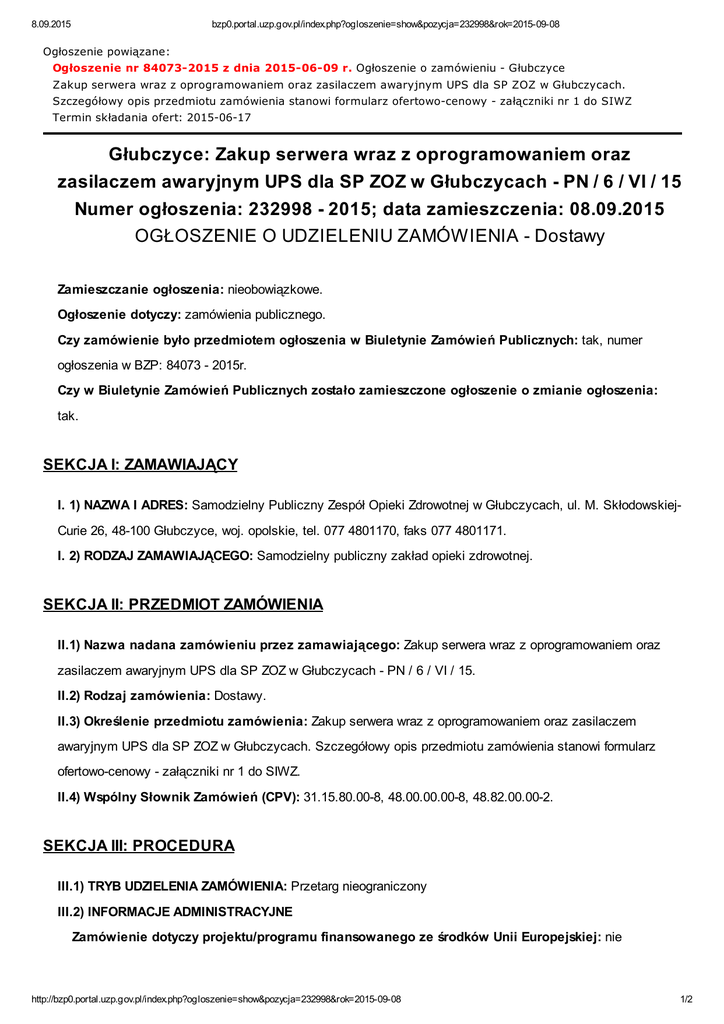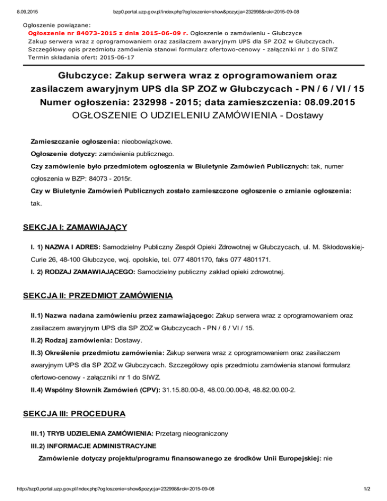 8.09.2015 bzp0.portal.uzp.gov.pl/index.php?ogloszenie=show&pozycja=232998&rok=2015-09-08 Ogłoszenie powiązane: Ogłoszenie nr 84073-2015 z dnia 2015-06-09 r. Ogłoszenie o zamówieniu - Głubczyce Zakup serwera wraz z oprogramowaniem oraz zasilaczem awaryjnym UPS dla SP ZOZ w Głubczycach. Szczegółowy opis przedmiotu zamówienia stanowi formularz ofertowo-cenowy - załączniki nr 1 do SIWZ Termin składania ofert: 2015-06-17 Głubczyce: Zakup serwera wraz z oprogramowaniem oraz zasilaczem awaryjnym UPS dla SP ZOZ w Głubczycach - PN / 6 / VI / 15 Numer ogłoszenia: 232998 - 2015; data zamieszczenia: 08.09.2015 OGŁOSZENIE O UDZIELENIU ZAMÓWIENIA - Dostawy Zamieszczanie ogłoszenia: nieobowiązkowe. Ogłoszenie dotyczy: zamówienia publicznego. Czy zamówienie było przedmiotem ogłoszenia w Biuletynie Zamówień Publicznych: tak, numer ogłoszenia w BZP: 84073 - 2015r. Czy w Biuletynie Zamówień Publicznych zostało zamieszczone ogłoszenie o zmianie ogłoszenia: tak. SEKCJA I: ZAMAWIAJĄCY I. 1) NAZWA I ADRES: Samodzielny Publiczny Zespół Opieki Zdrowotnej w Głubczycach, ul. M. SkłodowskiejCurie 26, 48-100 Głubczyce, woj. opolskie, tel. 077 4801170, faks 077 4801171. I. 2) RODZAJ ZAMAWIAJĄCEGO: Samodzielny publiczny zakład opieki zdrowotnej. SEKCJA II: PRZEDMIOT ZAMÓWIENIA II.1) Nazwa nadana zamówieniu przez zamawiającego: Zakup serwera wraz z oprogramowaniem oraz zasilaczem awaryjnym UPS dla SP ZOZ w Głubczycach - PN / 6 / VI / 15. II.2) Rodzaj zamówienia: Dostawy. II.3) Określenie przedmiotu zamówienia: Zakup serwera wraz z oprogramowaniem oraz zasilaczem awaryjnym UPS dla SP ZOZ w Głubczycach. Szczegółowy opis przedmiotu zamówienia stanowi formularz ofertowo-cenowy - załączniki nr 1 do SIWZ. II.4) Wspólny Słownik Zamówień (CPV): 31.15.80.00-8, 48.00.00.00-8, 48.82.00.00-2. SEKCJA III: PROCEDURA III.1) TRYB UDZIELENIA ZAMÓWIENIA: Przetarg nieograniczony III.2) INFORMACJE ADMINISTRACYJNE Zamówienie dotyczy projektu/programu finansowanego ze środków Unii Europejskiej: nie http://bzp0.portal.uzp.gov.pl/index.php?ogloszenie=show&pozycja=232998&rok=2015-09-08 1/2 8.09.2015 bzp0.portal.uzp.gov.pl/index.php?ogloszenie=show&pozycja=232998&rok=2015-09-08 SEKCJA IV: UDZIELENIE ZAMÓWIENIA IV.1) DATA UDZIELENIA ZAMÓWIENIA: 07.07.2015. IV.2) LICZBA OTRZYMANYCH OFERT: 3. IV.3) LICZBA ODRZUCONYCH OFERT: 2. IV.4) NAZWA I ADRES WYKONAWCY, KTÓREMU UDZIELONO ZAMÓWIENIA: Informex Sp. z o.o., ul. Wesoła 19B, 34-300 Żywiec, kraj/woj. śląskie. IV.5) Szacunkowa wartość zamówienia (bez VAT): 25203,25 PLN. IV.6) INFORMACJA O CENIE WYBRANEJ OFERTY ORAZ O OFERTACH Z NAJNIŻSZĄ I NAJWYŻSZĄ CENĄ Cena wybranej oferty: 31490,46 Oferta z najniższą ceną: 27169,31 / Oferta z najwyższą ceną: 34688,46 Waluta: PLN . http://bzp0.portal.uzp.gov.pl/index.php?ogloszenie=show&pozycja=232998&rok=2015-09-08 2/2