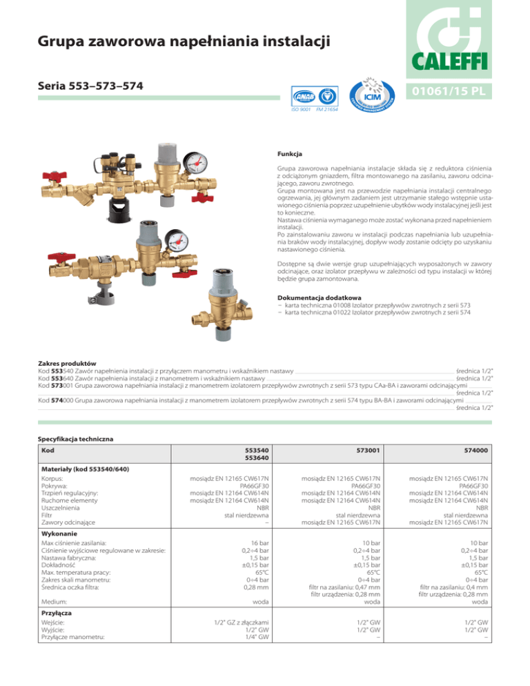Grupa zaworowa napełniania instalacji Seria 553–573–574 01061/15 PL ACCREDITED ISO 9001 FM 21654 Funkcja Grupa zaworowa napełniania instalacje składa się z reduktora ciśnienia z odciążonym gniazdem, filtra montowanego na zasilaniu, zaworu odcinającego, zaworu zwrotnego. Grupa montowana jest na przewodzie napełniania instalacji centralnego ogrzewania, jej głównym zadaniem jest utrzymanie stałego wstępnie ustawionego ciśnienia poprzez uzupełnienie ubytków wody instalacyjnej jeśli jest to konieczne. Nastawa ciśnienia wymaganego może zostać wykonana przed napełnieniem instalacji. Po zainstalowaniu zaworu w instalacji podczas napełniania lub uzupełniania braków wody instalacyjnej, dopływ wody zostanie odcięty po uzyskaniu nastawionego ciśnienia. Dostępne są dwie wersje grup uzupełniających wyposażonych w zawory odcinające, oraz izolator przepływu w zależności od typu instalacji w której będzie grupa zamontowana. Dokumentacja dodatkowa ūū karta techniczna 01008 Izolator przepływów zwrotnych z serii 573 ūū karta techniczna 01022 Izolator przepływów zwrotnych z serii 574 Zakres produktów Kod 553540 Zawór napełnienia instalacji z przyłączem manometru i wskaźnikiem nastawy średnica 1/2" Kod 553640 Zawór napełnienia instalacji z manometrem i wskaźnikiem nastawy średnica 1/2" Kod 573001 Grupa zaworowa napełniania instalacji z manometrem izolatorem przepływów zwrotnych z serii 573 typu CAa-BA i zaworami odcinającymi średnica 1/2" Kod 574000 Grupa zaworowa napełniania instalacji z manometrem izolatorem przepływów zwrotnych z serii 574 typu BA-BA i zaworami odcinającymi średnica 1/2" Specyfikacja techniczna Kod Materiały (kod 553540/640) Korpus: Pokrywa: Trzpień regulacyjny: Ruchome elementy Uszczelnienia Filtr Zawory odcinające Wykonanie Max ciśnienie zasilania: Ciśnienie wyjściowe regulowane w zakresie: Nastawa fabryczna: Dokładność Max. temperatura pracy: Zakres skali manometru: Średnica oczka filtra: Medium: Przyłącza Wejście: Wyjście: Przyłącze manometru: 553540 553640 573001 574000 mosiądz EN 12165 CW617N PA66GF30 mosiądz EN 12164 CW614N mosiądz EN 12164 CW614N NBR stal nierdzewna – mosiądz EN 12165 CW617N PA66GF30 mosiądz EN 12164 CW614N mosiądz EN 12164 CW614N NBR stal nierdzewna mosiądz EN 12165 CW617N mosiądz EN 12165 CW617N PA66GF30 mosiądz EN 12164 CW614N mosiądz EN 12164 CW614N NBR stal nierdzewna mosiądz EN 12165 CW617N 16 bar 0,2÷4 bar 1,5 bar ±0,15 bar 65°C 0÷4 bar 0,28 mm woda 10 bar 0,2÷4 bar 1,5 bar ±0,15 bar 65°C 0÷4 bar filtr na zasilaniu: 0,47 mm filtr urządzenia: 0,28 mm woda 10 bar 0,2÷4 bar 1,5 bar ±0,15 bar 65°C 0÷4 bar filtr na zasilaniu: 0,4 mm filtr urządzenia: 0,28 mm woda 1/2" GZ z złączkami 1/2" GW 1/4" GW 1/2" GW 1/2" GW – 1/2" GW 1/2" GW – Wymiary C 2 2 E D A A D C F B B D 50 50 4 D A A 4 A CAL EFFI A B C 1/2" 122 1/2" 122 152 3 CA LEF FI 4 3 0 Kod 553540 553640 2 0 3 0 CA LEF FI A 1 E 1 E 1 E Waga (kg) 101,5 0,62 101,5 0,70 Kod A B C 573001 1/2" 335 Ø 40 Szczegóły konstrukcyjne Kod 55310 oraz 553640 (opatentowany) 1 2 3 bar CALEFFI D F G E 87 101,5 122 213 Waga (kg) 2,2 C Kod A B C 574000 1/2" 382 Ø 40 B G D E F G 80 101,5 164 218 Waga (kg) 1,9 Prowadnica trzpienia elementu zamykającego W celu zmniejszenia tarcia, prowadnica trzpienia elementu zamykającego została zlokalizowana w górnej części zaworu. Prowadnica składa się z czterech ramion oraz centralnie umieszczonej podpory wykonanych z tworzywa sztucznego. 4 Nastawa wstępna Model został wyposażony w wskaźnik nastawy ciśnienia, co ułatwia obsługę. Ciśnienie wymagane ustawia się za pomocą przekręcenia śruby nastawczej, czynność ta może zostać wykonana przed napełnieniem instalacji. F G 0 Materiały zapobiegające osadzaniu się kamienia Wewnętrzne elementy ruchome wykonane są z tworzywa sztucznego o niskim współczynniku przyczepności. Rozwiązanie takie zmniejsza ryzyko osadzania się kamienia, który jest główną przyczyną awarii. Wyjmowany kartridż Kartridż zawierający wszystkie elementy zabezpieczony siatką o dużej powierzchni może zostać usunięty w celu sprawdzenia, czyszczenia lub wymiany. Membrana – uszczelnienie gniazda Zawór zapewnia dużą precyzję i czułość nawet przy niskiej różnicy ciśnienia dzięki zastosowaniu membrany o stosunkowo dużej powierzchni roboczej. Taka konstrukcja zapewnia większą siłę działającą na ruchomy tłok, co ułatwia pokonanie oporów tarcia. Gniazdo zaworu zostało zaprojektowane o możliwie najmniejszej średnicy, ze względu na niskie przepływy występujące w czasie pracy. Taka konstrukcja zapewnia optymalne proporcje wymiarowe, i pozwala na utrzymanie niezmiennych parametrów pracy w długim okresie czasu. Kod 553540 Izolator przepływów zwrotnych – zastosowanie w odniesieniu do przepisów Europejskich Aby zapobiec przepływowi zwrotnemu wody z instalacji centralnego ogrzewania, która może być zanieczyszczona i niebezpieczna dla zdrowia zaleca się zastosowanie grup napełniania instalacji wyposażonych w izolator przepływów zwrotnych. Prawidłowe zastosowanie izolatorów przepływów zwrotnych regulowane jest przez normę Europejską EN 1717: 2000 „Ochrona przed wtórnym zanieczyszczeniem wody w instalacjach wodociągowych i ogólne wymagania dotyczące urządzeń zapobiegających zanieczyszczaniu przez przepływ zwrotny”. Kod 574000 Grupa zaworowa napełniania instalacji o kodzie 574000 składa się z: ūū izolatora przepływów zwrotnych z możliwością nadzoru z strefą obniżonego ciśnienia typu BA z serii 574 ūū kulowych zaworów odcinających ūū kulowe zawory odcinające ūū filtra skośnego z serii 577 Kod 573001 Grupa zaworowa napełniania instalacji o kodzie 573001 składa się z: ūū izolatora przepływów zwrotnych bez możliwości nadzoru z strefą obniżonego ciśnienia typu CA z serii 573 ūū zaworu napełniającego z serii 553 ūū kulowych zaworów odcinaj