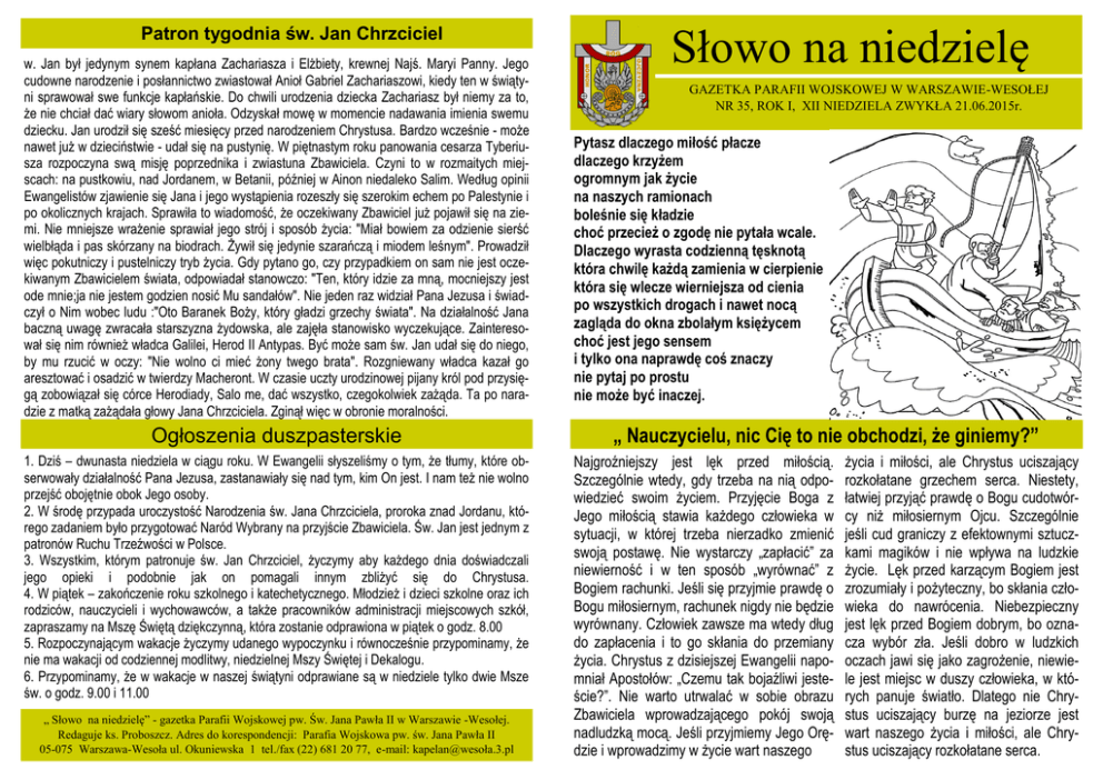 Patron tygodnia św. Jan Chrzciciel w. Jan był jedynym synem kapłana Zachariasza i Elżbiety, krewnej Najś. Maryi Panny. Jego cudowne narodzenie i posłannictwo zwiastował Anioł Gabriel Zachariaszowi, kiedy ten w świątyni sprawował swe funkcje kapłańskie. Do chwili urodzenia dziecka Zachariasz był niemy za to, że nie chciał dać wiary słowom anioła. Odzyskał mowę w momencie nadawania imienia swemu dziecku. Jan urodził się sześć miesięcy przed narodzeniem Chrystusa. Bardzo wcześnie - może nawet już w dzieciństwie - udał się na pustynię. W piętnastym roku panowania cesarza Tyberiusza rozpoczyna swą misję poprzednika i zwiastuna Zbawiciela. Czyni to w rozmaitych miejscach: na pustkowiu, nad Jordanem, w Betanii, później w Ainon niedaleko Salim. Według opinii Ewangelistów zjawienie się Jana i jego wystąpienia rozeszły się szerokim echem po Palestynie i po okolicznych krajach. Sprawiła to wiadomość, że oczekiwany Zbawiciel już pojawił się na ziemi. Nie mniejsze wrażenie sprawiał jego strój i sposób życia: "Miał bowiem za odzienie sierść wielbłąda i pas skórzany na biodrach. Żywił się jedynie szarańczą i miodem leśnym". Prowadził więc pokutniczy i pustelniczy tryb życia. Gdy pytano go, czy przypadkiem on sam nie jest oczekiwanym Zbawicielem świata, odpowiadał stanowczo: "Ten, który idzie za mną, mocniejszy jest ode mnie;ja nie jestem godzien nosić Mu sandałów". Nie jeden raz widział Pana Jezusa i świadczył o Nim wobec ludu :"Oto Baranek Boży, który gładzi grzechy świata". Na działalność Jana baczną uwagę zwracała starszyzna żydowska, ale zajęła stanowisko wyczekujące. Zainteresował się nim również władca Galilei, Herod II Antypas. Być może sam św. Jan udał się do niego, by mu rzucić w oczy: "Nie wolno ci mieć żony twego brata". Rozgniewany władca kazał go aresztować i osadzić w twierdzy Macheront. W czasie uczty urodzinowej pijany król pod przysięgą zobowiązał się córce Herodiady, Salo me, dać wszystko, czegokolwiek zażąda. Ta po naradzie z matką zażądała głowy Jana Chrzciciela. Zginął więc w obronie moralności. Ogłoszenia duszpasterskie 1. Dziś – dwunasta niedziela w ciągu roku. W Ewangelii słyszeliśmy o tym, że tłumy, które obserwowały działalność Pana Jezusa, zastanawiały się nad tym, kim On jest. I nam też nie wolno przejść obojętnie obok Jego osoby. 2. W środę przypada uroczystość Narodzenia św. Jana Chrzciciela, proroka znad Jordanu, którego zadaniem było przygotować Naród Wybrany na przyjście Zbawiciela. Św. Jan jest jednym z patronów Ruchu Trzeźwości w Polsce. 3. Wszystkim, którym patronuje św. Jan Chrzciciel, życzymy aby każdego dnia doświadczali jego opieki i podobnie jak on pomagali innym zbliżyć się do Chrystusa. 4. W piątek – zakończenie roku szkolnego i katechetycznego. Młodzież i dzieci szkolne oraz ich rodziców, nauczycieli i wychowawców, a także pracowników administracji miejscowych szkół, zapraszamy na Mszę Świętą dziękczynną, która zostanie odprawiona w piątek o godz. 8.00 5. Rozpoczynającym wakacje życzymy udanego wypoczynku i równocześnie przypominamy, że nie ma wakacji od codziennej modlitwy, niedzielnej Mszy Świętej i Dekalogu. 6. Przypominamy, że w wakacje w naszej świątyni odprawiane są w niedziele tylko dwie Msze św. o godz. 9.00 i 11.00 „ Słowo na niedzielę” - gazetka Parafii Wojskowej pw. Św. Jana Pawła II w Warszawie -Wesołej. Redaguje ks. Proboszcz. Adres do korespondencji: Parafia Wojskowa pw. św. Jana Pawła II 05-075 Warszawa-Wesoła ul. Okuniewska 1 tel./fax (22) 681 20 77, e-mail: kapelan@wesoła.3.pl Słowo na niedzielę GAZETKA PARAFII WOJSKOWEJ W WARSZAWIE-WESOŁEJ NR 35, ROK I, XII NIEDZIELA ZWYKŁA 21.06.2015r. Pytasz dlaczego miłość płacze dlaczego krzyżem ogromnym jak życie na naszych ramionach boleśnie się kładzie choć przecież o zgodę nie pytała wcale. Dlaczego wyrasta codzienną tęsknotą która chwilę każdą zamienia w cierpienie która się wlecze wierniejsza od cienia po wszystkich drogach i nawet nocą zagląda do okna zbolałym księżycem choć jest jego sensem i tylko ona naprawdę coś znaczy nie pytaj po prostu nie może być inaczej. „ Nauczycielu, nic Cię to nie obchodzi, że giniemy?” Najgroźniejszy jest lęk przed miłością. Szczególnie wtedy, gdy trzeba na nią odpowiedzieć swoim życiem. Przyjęcie Boga z Jego miłością stawia każdego człowieka w sytuacji, w której trzeba nierzadko zmienić swoją postawę. Nie wystarczy „zapłacić” za niewierność i w ten sposób „wyrównać” z Bogiem rachunki. Jeśli się przyjmie prawdę o Bogu miłosiernym, rachunek nigdy nie będzie wyrównany. Człowiek zawsze ma wtedy dług do zapłacenia i to go skłania do przemiany życia. Chrystus z dzisiejszej Ewangelii napomniał Apostołów: „Czemu tak bojaźliwi jesteście?”. Nie warto utrwalać w sobie obrazu Zbawiciela wprowadzającego pokój swoją nadludzką mocą. Jeśli przyjmiemy Jego Orędzie i wprowadzimy w życie wart naszego życia i miłości, ale Chrystus uciszający rozkołatane grzechem serca. Niestety, łatwiej przyjąć prawdę o Bogu cudotwórcy niż miłosiernym Ojcu. Szczególnie jeśli cud graniczy z efektownymi sztuczkami magików i nie wpływa na ludzkie życie. Lęk przed karzącym Bogiem jest zrozumiały i pożyteczny, bo skłania człowieka do nawrócenia. Niebezpieczny jest lęk przed Bogiem dobrym, bo oznacza wybór zła. Jeśli dobro w ludzkich oczach jawi się jako zagrożenie, niewiele jest miejsc w duszy człowieka, w których panuje światło. Dlatego nie Chrystus uciszający burzę na jeziorze jest wart naszego życia i miłości, ale Chrystus uciszający rozkołatane serca. Liturgia Słowa na XII Niedzielę Zwykłą B I Czytanie Job 38,1.8-11 II Czytanie 2 Kor 5,14-17 Czytanie z Księgi Joba Z wichru Pan powiedział Jobowi te słowa: „Kto bramą zamknął morze, gdy 