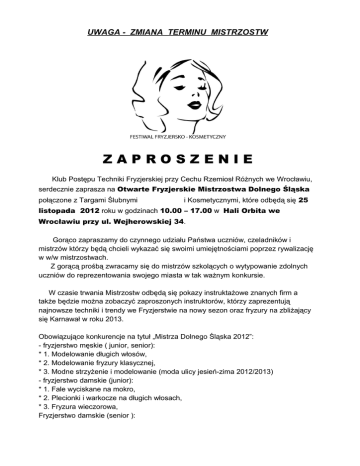 UWAGA - ZMIANA TERMINU MISTRZOSTW ZAPROSZENIE Klub Postępu Techniki Fryzjerskiej przy Cechu Rzemiosł Różnych we Wrocławiu, serdecznie zaprasza na Otwarte Fryzjerskie Mistrzostwa Dolnego Śląska połączone z Targami Ślubnymi i Kosmetycznymi, które odbędą się 25 listopada 2012 roku w godzinach 10.00 – 17.00 w Hali Orbita we Wrocławiu przy ul. Wejherowskiej 34. Gorąco zapraszamy do czynnego udziału Państwa uczniów, czeladników i mistrzów którzy będą chcieli wykazać się swoimi umiejętnościami poprzez rywalizację w w/w mistrzostwach. Z gorącą prośbą zwracamy się do mistrzów szkolących o wytypowanie zdolnych uczniów do reprezentowania swojego miasta w tak ważnym konkursie. W czasie trwania Mistrzostw odbędą się pokazy instruktażowe znanych firm a także będzie można zobaczyć zaproszonych instruktorów, którzy zaprezentują najnowsze techniki i trendy we Fryzjerstwie na nowy sezon oraz fryzury na zbliżający się Karnawał w roku 2013. Obowiązujące konkurencje na tytuł „Mistrza Dolnego Śląska 2012”: - fryzjerstwo męskie ( junior, senior): * 1. Modelowanie długich włosów, * 2. Modelowanie fryzury klasycznej, * 3. Modne strzyżenie i modelowanie (moda ulicy jesień-zima 2012/2013) - fryzjerstwo damskie (junior): * 1. Fale wyciskane na mokro, * 2. Plecionki i warkocze na długich włosach, * 3. Fryzura wieczorowa, Fryzjerstwo damskie (senior ): *1.Fryzura kreatywna , *2.Fryzura wieczorowa, *3.Modne strzyżenie i modelowanie (moda ulicy jesień-zima 2012/2013) Udział zawodników w mistrzostwach jest bezpłatny. Zgłoszenia przyjmuje biuro Cechu, tel. 71-344-44-19 E - mail: [email protected] , [email protected] Regulamin dostępny w biurze Cechu lub na stronach: www.cechwroclaw.pl, www.festiwalfryzjersko-kosmetyczny.pl Przewodnicząca Klubu „JANINA TYRCZ”