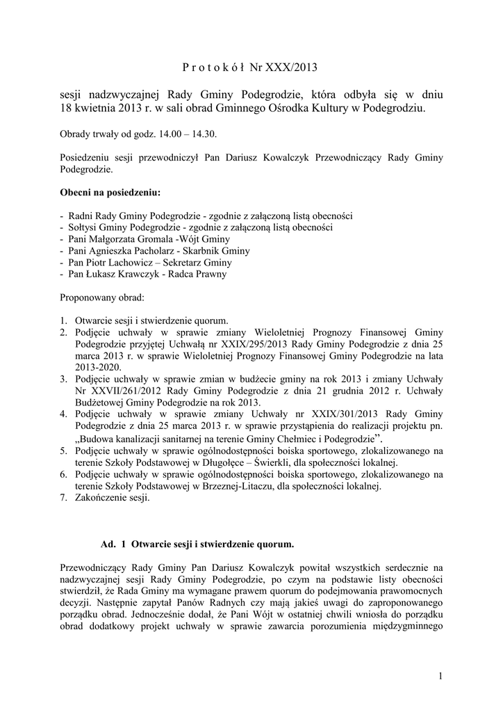 P r o t o k ó ł Nr XXX/2013 sesji nadzwyczajnej Rady Gminy Podegrodzie, która odbyła się w dniu 18 kwietnia 2013 r. w sali obrad Gminnego Ośrodka Kultury w Podegrodziu. Obrady trwały od godz. 14.00 – 14.30. Posiedzeniu sesji przewodniczył Pan Dariusz Kowalczyk Przewodniczący Rady Gminy Podegrodzie. Obecni na posiedzeniu: - Radni Rady Gminy Podegrodzie - zgodnie z załączoną listą obecności Sołtysi Gminy Podegrodzie - zgodnie z załączoną listą obecności Pani Małgorzata Gromala -Wójt Gminy Pani Agnieszka Pacholarz - Skarbnik Gminy Pan Piotr Lachowicz – Sekretarz Gminy Pan Łukasz Krawczyk - Radca Prawny Proponowany obrad: 1. Otwarcie sesji i stwierdzenie quorum. 2. Podjęcie uchwały w sprawie zmiany Wieloletniej Prognozy Finansowej Gminy Podegrodzie przyjętej Uchwałą nr XXIX/295/2013 Rady Gminy Podegrodzie z dnia 25 marca 2013 r. w sprawie Wieloletniej Prognozy Finansowej Gminy Podegrodzie na lata 2013-2020. 3. Podjęcie uchwały w sprawie zmian w budżecie gminy na rok 2013 i zmiany Uchwały Nr XXVII/261/2012 Rady Gminy Podegrodzie z dnia 21 grudnia 2012 r. Uchwały Budżetowej Gminy Podegrodzie na rok 2013. 4. Podjęcie uchwały w sprawie zmiany Uchwały nr XXIX/301/2013 Rady Gminy Podegrodzie z dnia 25 marca 2013 r. w sprawie przystąpienia do realizacji projektu pn. „Budowa kanalizacji sanitarnej na terenie Gminy Chełmiec i Podegrodzie”. 5. Podjęcie uchwały w sprawie ogólnodostępności boiska sportowego, zlokalizowanego na terenie Szkoły Podstawowej w Długołęce – Świerkli, dla społeczności lokalnej. 6. Podjęcie uchwały w sprawie ogólnodostępności boiska sportowego, zlokalizowanego na terenie Szkoły Podstawowej w Brzeznej-Litaczu, dla społeczności lokalnej. 7. Zakończenie sesji. Ad. 1 Otwarcie sesji i stwierdzenie quorum. Przewodniczący Rady Gminy Pan Dariusz Kowalczyk powitał wszystkich serdecznie na nadzwyczajnej sesji Rady Gminy Podegrodzie, po czym na podstawie listy obecności stwierdził, że Rada Gminy ma wymagane prawem quorum do podejmowania prawomocnych decyzji. Następnie zapytał Panów Radnych czy mają jakieś uwagi do zaproponowanego porządku obrad. Jednocześnie dodał, że Pani Wójt w ostatniej chwili wniosła do porządku obrad dodatkowy projekt uchwały w sprawie zawarcia porozumienia międzygminnego 1 z gminą Chełmiec. Ponieważ projekt tej uchwały nie był opiniowany przez właściwe komisje, poprosił Panią Wójt o krótkie uzasadnienie czego sprawa dotyczy. Pani Małgorzata Gromala - Wójt - przeprosiła państwa obecnych za tryb zwołania sesji nadzwyczajnej, jednocześnie dodając, że jest to związane głównie ze środkami, o które się ubiegamy do Programu Infrastruktury i Ochrony Środowiska na kanalizację. Wniosek w tej sprawie jest do złożenia do dnia 22 kwietnia br., który składamy wspólnie z Gminą Chełmiec. Zaznacza, że nie wie czy ten wniosek zostanie pozytywnie rozpatrzony, ponieważ po raz pierwszy jest taka konstrukcja, że gmina nie mając wspólnej oczyszczalni ścieków może o to się starać czyli robimy jak gdyby dwie aglomeracje. Sami byśmy nie mogli wystąpić do ww. programu ze względu na to, że nie spełniamy kryteriów, które są wymagane do wniosku, natomiast wspólnie z Gminą Chełmiec na pewno możemy to zrobić. Byłoby to duże dofinansowanie, bo nawet na poziomie 85%. Koszt takiej kanalizacji jest bardzo wysoki i samodzielnie byśmy tego nigdy nie udźwignęli. W związku z tym, że cały czas jesteśmy na etapie przygotowywania wspomnianego wniosku, na bieżąco wychodzą różne rzeczy. Stąd też projekt uchwały, którą chcemy wprowadzić do porządku obrad. Jako gmina nie będziemy składać wniosku tylko będzie to wszystko robić Gmina Chełmiec w jej imieniu. Natomiast później będziemy prowadzić jak gdyby oddzielnie dwa zadania w związku z tym projektem czyli przetargi, konsultacje i inne rzeczy będzie robiła każda z gmin. Chodziło tutaj również o trwałość majątku i pani skarbnik negocjowała wszystkie te warunki, ponieważ w pierwszej wersji było, że nie będziemy mogli być właścicielami i nie będziemy mogli odliczać podatku VAT, amortyzacji itd. Obecnie udało się wynegocjować z Narodowym Funduszem, że będziemy mogli mieć możliwość tych odliczeń. Stąd też przedmiotowy projekt uchwały w ostatniej chwili jeszcze poprawiany wraz z załączonym porozumieniem. Sesja Rady Gminy w Chełmcu jest zwołana dzisiaj na godz. 15-tą, na której również zostanie przyjęte takie porozumienie i o podobnej treści uchwała. Pan Dariusz Kowalczyk - Przew. RG - podziękował Pani Wójt za stosowne wyjaśnienie, po czym zapytał czy panowie radni mają jeszcze jakieś pytania odnośnie projektu uchwały. Pan Józef Kotarba – Radny – nawiązując do wypowiedzi pani wójt powiedział, że rozumie, iż czas nagli, jeżeli w poniedziałek mamy składać te dokumenty, ale w tej chwili trudno jest się radnym odnieść do tej kwestii. Ma nadzieję, że nic tutaj takiego nie jest, żeby później nas gmina Chełmiec „nie wyślizgała” i nie sfinansowała czegoś z naszych pieniędzy. W przedmiotowym porozumieniu jest zapis, że każda z gmin na terenie objętym porozumieniem odpowiednią część realizuje zgodnie z tym co ewentualnie będzie przyznane i co wygramy. Pani Małgorzata Gromala -Wójt - o ile w ogóle wygramy. Pan Józef Kotarba - Radny – zapytał czy taki zapis w porozumieniu wystarcza, żeby rzeczywiście tak było. Pani Małgorzata Gromala -Wójt - wyjaśniła, że porozumienie działa w obie strony czyli takie samo ryzyko podejmuje wójt Chełmca jak i ona. Jesteśmy wdzięczni panu wójtowi Chełmca, że wyraził zgodę i możemy przystąpić do tego projektu, bo jak wcześniej podkreśliła, samodzielnie byśmy nigdy takiego wniosku nie mogli złożyć. Druga rzecz to taka, że projekt porozumienia nie był przygotowany przez wójta Chełmca tylko przez naszych radców prawnych i myśmy go tylko zwyczajnie 