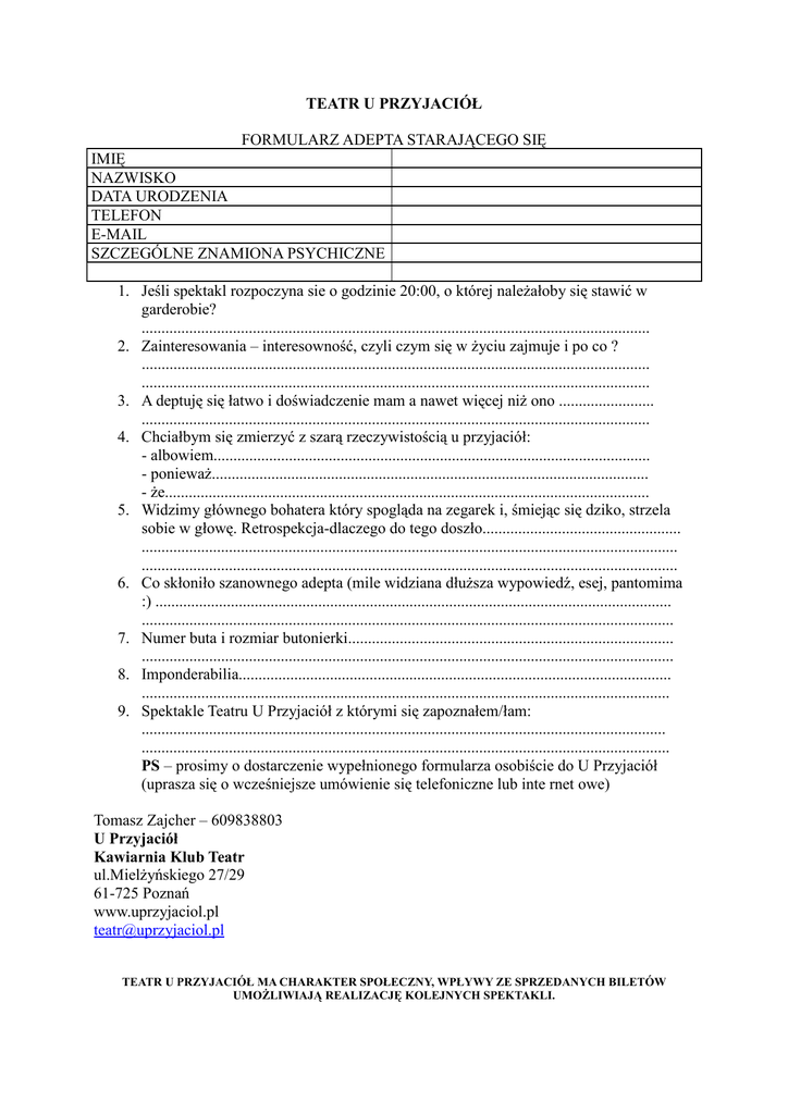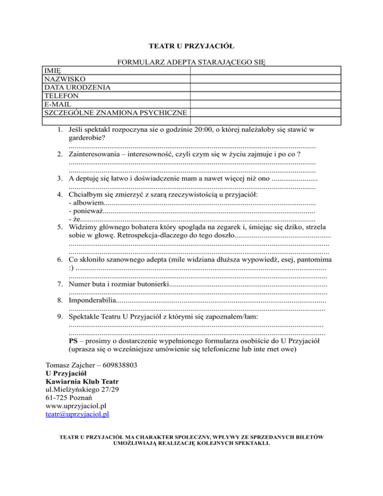 TEATR U PRZYJACIÓŁ FORMULARZ ADEPTA STARAJĄCEGO SIĘ IMIĘ NAZWISKO DATA URODZENIA TELEFON E-MAIL SZCZEGÓLNE ZNAMIONA PSYCHICZNE 1. Jeśli spektakl rozpoczyna sie o godzinie 20:00, o której naleŜałoby się stawić w garderobie? ................................................................................................................................ 2. Zainteresowania – interesowność, czyli czym się w Ŝyciu zajmuje i po co ? ................................................................................................................................ ................................................................................................................................ 3. A deptuję się łatwo i doświadczenie mam a nawet więcej niŜ ono ........................ ................................................................................................................................ 4. Chciałbym się zmierzyć z szarą rzeczywistością u przyjaciół: - albowiem.............................................................................................................. - poniewaŜ.............................................................................................................. - Ŝe.......................................................................................................................... 5. Widzimy głównego bohatera który spogląda na zegarek i, śmiejąc się dziko, strzela sobie w głowę. Retrospekcja-dlaczego do tego doszło.................................................. ....................................................................................................................................... ....................................................................................................................................... 6. Co skłoniło szanownego adepta (mile widziana dłuŜsza wypowiedź, esej, pantomima :) .................................................................................................................................. ...................................................................................................................................... 7. Numer buta i rozmiar butonierki.................................................................................. ...................................................................................................................................... 8. Imponderabilia............................................................................................................. ..................................................................................................................................... 9. Spektakle Teatru U Przyjaciół z którymi się zapoznałem/łam: .................................................................................................................................... ..................................................................................................................................... PS – prosimy o dostarczenie wypełnionego formularza osobiście do U Przyjaciół (uprasza się o wcześniejsze umówienie się telefoniczne lub inte rnet owe) Tomasz Zajcher – 609838803 U Przyjaciół Kawiarnia Klub Teatr ul.MielŜyńskiego 27/29 61-725 Poznań www.uprzyjaciol.pl [email protected] TEATR U PRZYJACIÓŁ MA CHARAKTER SPOŁECZNY, WPŁYWY ZE SPRZEDANYCH BILETÓW UMOśLIWIAJĄ REALIZACJĘ KOLEJNYCH SPEKTAKLI.