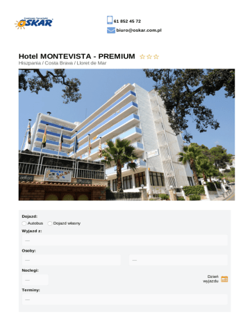 61 852 45 72 [email protected] Hotel MONTEVISTA - PREMIUM Hiszpania / Costa Brava / Lloret de Mar Dojazd: Autobus Dojazd własny Wyjazd z: Osoby: Noclegi: Dzień wyjazdu Terminy: Pokój: Wyżywienie: Najtańsza oferta Styczniowe Rabaty zniżka 20% cena katalogowa do 7 marca 2017: 3084,00 zł do 7 marca 2017: 925,20 zł do 4 maja 2017: 0,00 zł do 4 maja 2017: 2158,80 zł Suma: 3084,00 zł Suma: 3084,00 zł Opis oferty Miejscowość Przejazd autokarem PREMIUM Wycieczki autokar-premium-oskar-tablet-gniazdko-usb-wygodne-fotele fakultatywne Realizacja imprezy autokarami PREMIUM to gwarancja: transportu Opinie autokarami z roczników 2015 i 2016 produkcji Irizar i VDL indywidualnego, multimedialnego systemu rozrywki - tablet z dotykowym ekranem w każdym zagłówku (filmy, gry, muzyka itp.). Możliwość podłączenia własnego nośnika danych poprzez wejście AUX lub USB. najwyższej klasy skórzanych lub półskórzanych foteli z możliwością regulacji oparcia lub/i zagłówka największej w Polsce przestrzeni między siedzeniami małej półki przed każdym siedzeniem + siateczki na czasopisma, książki czy telefon bezpłatnego dostępu do sieci WiFi na terenie Polski* gniazdek elektrycznych 230V wydajnej klimatyzacji sterowanej indywidualnie bogato wyposażonego barku udostępnionego w czasie jazdy WC na pokładzie autokaru Idealna i komfortowa podróż… ZAWSZE! Na ternie Polski GWARANTUJEMY, że wszystkie przejazdy realizowane są autobusem, busem lub samochodem osobowym. Zapewnimy komfortowy transport na każdym etapie podróży. Ważne: Autokar Premium jest autokarem docelowym. *jakość usług internetowych może różnić się w zależności od jakości sygnału Atuty obiekt z basenem i prywatnym ogrodem komfortowe pokoje spokojna okolica śniadania w cenie hotelowy pub i dysk wieczory Show Cooking Położenie Hotel położony jest w spokojnej okolicy, w niedalekiej odległości od centrum miasta, zaledwie 5 minut spacerem od głównej dzielnicy handlowej i lokali gastronomicznych oraz w odległości 500 m od plaży. W pobliżu hotelu znajdują się liczne sklepiki, kawiarnie, restauracje. Obiekt dysponuje prywatnym ogrodem z odkryty basenem. Miasto Tossa de Mar oddalone jest od obiektu o 12 minut jazdy. Z hotelu można dojechać do centrum Barcelony w około godzinę. Zakwaterowanie Hotel Montevista posiada 246 klimatyzowanych pokoi. Funkcjonalne, nowocześnie urządzone pokoje zostały odremontowane w 2012 roku. Każdy pokój posiada klimatyzację, prywatną łazienkę z wanną lub prysznicem i suszarką do włosów, telefon, odpłatny sejf, TV z płaskim ekranem z dostępem do kanałów telewizji satelitarnej. Wszystkie pokoje posiadają balkony lub prywatne tarasy. Dostępne opcje zakwaterowania - pokoje 1 osobowe - pokoje 2 osobowe - pokoje 2 osobowe z jedną lub dwoma dostawkami. - dokwaterowanie (bez dopłat*) lub pokoje 1 osobowe (dopłata) *dokwaterowanie- osoby wybierając się pojedynczo, które w momencie rezerwacji nie dokonują dopłaty do pokoju jednoosobowego, mogą zostać zakwaterowanie z jedną lub kilkoma osobami tej samej płci w tzw. opcji dokwaterowania; jednakże w przypadku braku innej rezerwacji w opcji dokwaterowania w terminie do 7 dni przed rozpoczęciem imprezy wymagana jest dopłata do pokoju 1 osobowego Dostępne opcje wyżywienia śniadania śniadania i obiadokolacje śniadania, obiady i kolacje all inclusive Wyżywienie w formie bufetu. Napoje do obiadokolacji są dodatkowo płatne. Hotel organizuje wieczory Show Cooking. Pozostałe Plaża Odległość od plaży wynosi ok. 500 metrów. Plaża bezpłatna, piaszczysta z piaskiem gruboziarnistym, odznaczona certyfikatem Błękitnej Flagi leżaki i parasole płatne ok. 12 €/dzień/komplet - 2 leżaki i parasol. Sport i rekreacja Basen z brodzikiem , boccia, bilard i tenis stołowy za opłatą. Kilka razy w tygodniu dla gości hotelu organizowane są tańce i programy animacyjne. Dla dzieci Plac zabaw i pokój gier dla dzieci. Do dyspozycji gości Recepcja, salon z barem i TV sat., jadalnia, winda, taras słoneczny, parasole i leżaki, pub z dyskoteką, bilardem i TV sat. Pakiet KOMFORT gwarancja wyboru miejsca w autokarze napoje w autokarze w cenie (6 x do wyboru: kawa, herbata, zimny napój 0,2l) cena: 50 zł/os Pakiet PRESTIGE gwarancja wyboru miejsca w autokarze napoje w autokarze w cenie (6 x do wyboru: kawa, herbata, zimny napój 0,2l) pierwszeństwo wejścia na pokład autokaru nadbagaż 5 kg w cenie suchy prowiant na drogę powrotną cena: 100 zł/os Karta Dużej Rodziny www.oskar.com.pl/zalaczniki/karta_duzej_rodziny Warunki promocji FIRST MINUTE www.oskar.com.pl/zalaczniki/warunki_promocji Ubezpieczenie Warunki ubezpieczenia Bezpieczne Podróże Signal Iduna dokument do pobrania www.oskar.com.pl/zalaczniki/owu Warunki ubezpieczenia Kosztów Imprezy Turystycznej Signal Iduna dokument do pobrania www.oskar.com.pl/zalaczniki/owurg Turystyczny Fundusz Gwarancyjny W związku z powołaniem do życia w dniu 26.11.2016 Turystycznego Funduszu Gwarancyjnego każdy klient Biura Podróży Oskar zobowiązany jest do zapłaty kwoty w wysokości 10zł/os. przy każdorazowej rezerwacji imprezy turystycznej (obowiązuje od dnia 26.11.2016). Kwota przeznaczona na Turystyczny Fundusz Gwarancyjny zostanie automatycznie doliczona do wartości rezerwacji (w momencie jej dokonania). Wyjątkiem są imprezy turystyczne odbywające się w krajach posiadających granicę z Rzeczpospolitą Polską. Składka nie jest przychodem biura. Udogodnienia Klimatyzacja Regulowane fotele Tacki Multimedia Nowoczesna flota Zawodowy kierowca Pasy bezpieczeństwa Toaleta w autokarze Podnóżki Fitness Dla rodzin z dziećmi Wi-Fi Winda Blisko centrum Życie nocne Bez paszportu Blisko plaży Basen odkryty Premium Elite Spokojna okolica Restauracja hotelowa Region nadmorski Program ramowy Dzień 1 Wyjazd w Polski zgodnie z rozkładem jazdy autokarów. Przejazd przez Niemcy, Francję. Dzień 2 Przyjazd do Lloret de Mar w godzinach oko