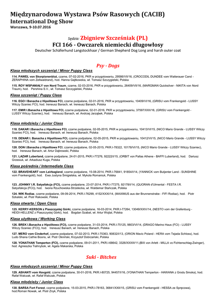 Międzynarodowa Wystawa Psów Rasowych (CACIB) International Dog Show Warszawa, 9-10.07.2016 Sędzia: Zbigniew Szcześniak (PL) FCI 166 - Owczarek niemiecki długowłosy Deutscher Schäferhund Langstockhaar / German Shepherd Dog Long and harsh outer coat Psy - Dogs Klasa młodszych szczeniąt / Minor Puppy Class 114. PAWEŁ von Skorpionenblut, czarne, 07-02-2016, PKR w przygotowaniu, 29586/VII/16, (CROCODIL DUNDEE vom Watterauer Cand ZERAPHINA vom Zellwaldrand), hod. Hanna Gajtkowska, wł. Tomasz Szczygielski, Polska 115. ROY WSPANIAŁY von Nord Traum, czarne, 02-03-2016, PKR w przygotowaniu, 26409/VII/16, (MARGMAN Quicksilver - NIKITA von Nord Traum), hod. Pershina S.V., wł. Tomasz Szczygielski, Polska Klasa szczeniąt / Puppy Class 116. EGO I Banacha z Hipolitowa FCI, czarne podpalane, 02-01-2016, PKR w przygotowaniu, 10409/VI/16, (GRISU vom Frankengold - LUSSY Wilczy Szaniec FCI), hod. Ireneusz Banach, wł. Ireneusz Banach, Polska 117. EMIR I.Banacha z Hipolitowa FCI, czarne podpalane, 02-01-2016, PKR w przygotowaniu, 37597/XXII/16, (GRISU vom Frankengold LUSSY Wilczy Szaniec), hod. Ireneusz Banach, wł. Andrzej Jarząbek, Polska Klasa młodzieży / Junior Class 118. DAKAR I.Banacha z Hipolitowa FCI, czarne podpalane, 02-05-2015, PKR w przygotowaniu, 10413/VI/15, (NICO Mario Grande - LUSSY Wilczy Szaniec FCI), hod. Ireneusz Banach, wł. Ireneusz Banach, Polska 119. DENAR I. Banacha z Hipolitowa FCI, czarne podpalane, 02-05-2015, PKR w przygotowaniu, 10412/VI/15, (NICO Mario Grande - LUSSY Wilczy Szaniec FCI), hod. Ireneusz Banach, wł. Ireneusz Banach, Polska 120. DON I.Banacha z Hipolitowa FCI, czarne podpalane, 02-05-2015, PKR.I-78322, 10178/VI/15, (NICO Mario Grande - LUSSY Wilczy Szaniec), hod. Ireneusz Banach, wł. Artur Dąbrowski, Polska 121. LAZAR Luberland, czarne podpalane, 24-01-2015, PKR.I-77276, 92222/I/15, (ORBIT von Pallas Athene - BAFFI Luberland), hod. Dariusz Grzesiuk, wł. Arkadiusz Kuga, Polska Klasa pośrednia / Intermediate Class 122. BRAVEHEART vom Leirbagland, czarne podpalane, 15-08-2014, PKR.I-76841, 91854/I/14, (YANNICK vom Butjenter Land - SUNSHINE vom Frankengold), hod. Ewa Justyna Śmigielska, wł. Mykola Romaniuk, Polska 123. JOHNNY I.R. Satysfakcja (FCI), czarne podpalane, 23-07-2014, PKR.I-77275, 92178/I/14, (QUORAN d'Ulmental - FESTA I.R. Satysfakcja (FCI)), hod. Iwona Rzuchowska-Strzelecka, wł. Waldemar Stańczak, Polska 124. WIK Rodiaz, czarne podpalane, 09-09-2014, PKR.I-76299, 4152/XXXI/14, (MAXIMUS aus der Brunnenstrabe - FIFI Rodiaz), hod. Piotr Szkalski, wł. Piotr Rakowski, Polska Klasa otwarta / Open Class 125. KERRY-KERSON z Piaszczystej Górki, czarne podpalane, 16-03-2014, PKR.I-77264, 13049/XXIV/14, (NESTO vom der Grafenburg HEIDI-HELLENZ z Piaszczystej Górki), hod. Bogdan Szabat, wł. Artur Wojtal, Polska Klasa użytkowa / Working Class 126. BREK I.Banacha z Hipolitowa (FCI), czarne podpalane, 31-03-2014, PKR.I-75125, 9803/VI/14, (DRAGO Marino Haus (FCI) - LUSSY Wilczy Szaniec (FCI)), hod. Ireneusz Banach, wł. Ireneusz Banach, Polska 127. MERO vom Cinderhof, czarne podpalane, 07-02-2013, PKR.I-75363, 90832/I/13, (ORION Mavic Poland - HERA vom Tejada Schloss), hod. Ludo Shana Cathie Boons, wł. Piotr Okniński, Krzysztof Dobrzański, Polska 128. YONATHAN Temperton (FCI), czarne podpalane, 09-01-2011, PKR.I-68642, 3326/XXXIII/11,(BIX von Arlett - MILLA vo Fichtenschlag-Zwinger), hod. Agnieszka Tiahnybok, wł. Agata Makarska, Polska Suki - Bitches Klasa młodszych szczeniąt / Minor Puppy Class 129. ASHANTI vom Havgold, czarne podpalane, 30-01-2016, PKR.I-80725, 94457/I/16, (YONATHAN Temperton - HAWANA z Grodu Smoka), hod. Rafał Walczak, wł. Rafał Walczak, Polska Klasa młodzieży / Junior Class 130. BARSA Fort Forest, czarne podpalane, 15-03-2015, PKR.I-78163, 36841/XXII/15, (GRISU vom Frankengold - HESSA ze Spręcowa), hod.Roman Nowak, wł. Piotr Znyk, Polska 131. ELMA Gold-Abat FCI, czarne podpalane, 26-01-2015, PKR.I-79787, 37172/XXII/15, (ELOI vom Trompetersprung - YOSCHA von der Grafenburg), hod. Tomasz, Adrian Lipnicki, wł. Andrzej Jarząbek, Polska 132. JOSZKA Mario Grande FCI, czarne podpalane, 29-05-2015, PKR w przygotowaniu, 3827/XLVIII/15, (Team Leiksaid KAPITAN - NADIA Mario Grande FCI), hod. Mariusz Huszcza, wł. Mirosław Bartosiewicz, Polska 133. YIN vom Frankengold, czarne podpalane, 17-02-2015, PKR w przygotowaniu, 92654/I/15, (DESPERADOS vom Pendler - GALINA vom Frankengold), hod. Frank Goldust, wł. Ewa Śmigielska, Gabriel Peńsko, , Polska 134. ZARINNA vom Haus Tchorz, czarne podpalane, 12-05-2015, PKR.I-79223, 29198/VII/15, (CRONOS del Seprio - BRENDA vom Trompetersprung), hod. Mirosław Tchorz, wł. Piotr Ponikowski, Polska Klasa pośrednia / Intermediate Class 135. AGIRA Ladbergen, czarne podpalane, 28-08-2014, PKR.I-76548, 12895/XXIV/14, (LEON Nova Jamina - KAJA z Lepos), hod. Daniel Banach, wł.Daniel Wójcik, Polska 136. ARRIKA Leidenschaft Poland, czarne podpalane, 17-10-2014, PKR.I-78475, 92978/I/14, (FRITZ von Kuckucksland - BRIT Kenola), hod. Małgorzata Chmielek, wł. Ewelina Niewęgłowska, Polska 137. CECYLIA Wolf-Gang, czarne podpalane, 20-10-2014, PKR.I-77137, 92104/I/14, (YOKER vom Pendler - POLA Wolf-Gang), hod. Ireneusz Kajak, wł. Grażyna Rudasz, Polska 138. DOLLY Golden Evanga, czarne podpalane, 10-07-2014, PKR.I-80105, 3828/XLVIII/14, (DUX v.d.Glockenheide - EVANESENCE MoVake), hod. Gabriela Barburska, wł. Wiesław Groszyk, Polska 139. JOSI von Holtkamper See, czarne podpalane, 01-11-2014, PKR.I-77523, 13089/XXIV/14, (XEN von Haus Cerba - BABSI von Julianenweg),hod. Matthias Niedergassel, wł. Sebastian Korżyński, Polska Klasa otwarta / Open Class 140. AKIMA Ger-Land, czarne podpalane, 19-10-2014, PKR.I-77218, 13040/XXIV/14, (PEDRO vom Langenbungert - HOPE vom Altenberger LAND), hod. Grzegorz Alikowski, wł. Grzegorz Alikowski, Polska Sędzia: Zbigniew Szcześniak (PL) FCI 166 - Owczarek niemiecki krótkowłosy Deutscher Schäferhund Stockhaar / German Shepherd Dog Double coat Psy - Dog