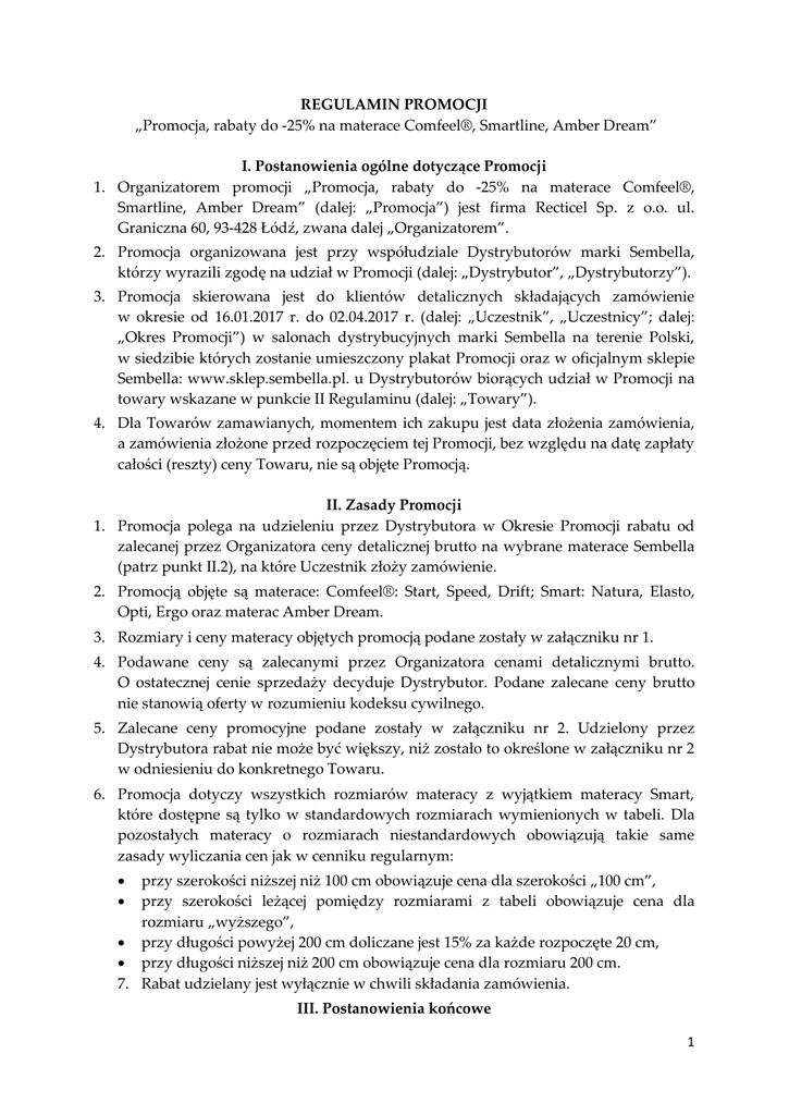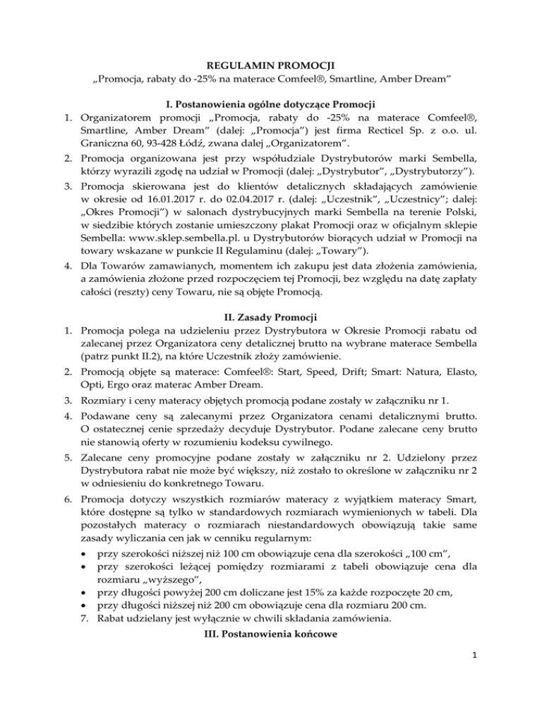 REGULAMIN PROMOCJI „Promocja, rabaty do -25% na materace Comfeel®, Smartline, Amber Dream” I. Postanowienia ogólne dotyczące Promocji 1. Organizatorem promocji „Promocja, rabaty do -25% na materace Comfeel®, Smartline, Amber Dream” (dalej: „Promocja”) jest firma Recticel Sp. z o.o. ul. Graniczna 60, 93-428 Łódź, zwana dalej „Organizatorem”. 2. Promocja organizowana jest przy współudziale Dystrybutorów marki Sembella, którzy wyrazili zgodę na udział w Promocji (dalej: „Dystrybutor”, „Dystrybutorzy”). 3. Promocja skierowana jest do klientów detalicznych składających zamówienie w okresie od 16.01.2017 r. do 02.04.2017 r. (dalej: „Uczestnik”, „Uczestnicy”; dalej: „Okres Promocji”) w salonach dystrybucyjnych marki Sembella na terenie Polski, w siedzibie których zostanie umieszczony plakat Promocji oraz w oficjalnym sklepie Sembella: www.sklep.sembella.pl. u Dystrybutorów biorących udział w Promocji na towary wskazane w punkcie II Regulaminu (dalej: „Towary”). 4. Dla Towarów zamawianych, momentem ich zakupu jest data złożenia zamówienia, a zamówienia złożone przed rozpoczęciem tej Promocji, bez względu na datę zapłaty całości (reszty) ceny Towaru, nie są objęte Promocją. II. Zasady Promocji 1. Promocja polega na udzieleniu przez Dystrybutora w Okresie Promocji rabatu od zalecanej przez Organizatora ceny detalicznej brutto na wybrane materace Sembella (patrz punkt II.2), na które Uczestnik złoży zamówienie. 2. Promocją objęte są materace: Comfeel®: Start, Speed, Drift; Smart: Natura, Elasto, Opti, Ergo oraz materac Amber Dream. 3. Rozmiary i ceny materacy objętych promocją podane zostały w załączniku nr 1. 4. Podawane ceny są zalecanymi przez Organizatora cenami detalicznymi brutto. O ostatecznej cenie sprzedaży decyduje Dystrybutor. Podane zalecane ceny brutto nie stanowią oferty w rozumieniu kodeksu cywilnego. 5. Zalecane ceny promocyjne podane zostały w załączniku nr 2. Udzielony przez Dystrybutora rabat nie może być większy, niż zostało to określone w załączniku nr 2 w odniesieniu do konkretnego Towaru. 6. Promocja dotyczy wszystkich rozmiarów materacy z wyjątkiem materacy Smart, które dostępne są tylko w standardowych rozmiarach wymienionych w tabeli. Dla pozostałych materacy o rozmiarach niestandardowych obowiązują takie same zasady wyliczania cen jak w cenniku regularnym: przy szerokości niższej niż 100 cm obowiązuje cena dla szerokości „100 cm”, przy szerokości leżącej pomiędzy rozmiarami z tabeli obowiązuje cena dla rozmiaru „wyższego”, przy długości powyżej 200 cm doliczane jest 15% za każde rozpoczęte 20 cm, przy długości niższej niż 200 cm obowiązuje cena dla rozmiaru 200 cm. 7. Rabat udzielany jest wyłącznie w chwili składania zamówienia. III. Postanowienia końcowe 1 1. Regulamin Promocji dla Uczestnika jest dostępny w salonach dystrybucyjnych marki Sembella oraz na stronie internetowej www.sembella.pl. 2. Wszystkie treści zawarte w materiałach reklamowo-promocyjnych mają charakter jedynie informacyjny. Moc prawną mają jedynie postanowienia niniejszego Regulaminu i Regulaminu dla Dystrybutora oraz obowiązujące przepisy prawa. 3. Dodatkowe informacje o Promocji będą udzielane przez Dział Sprzedaży (tel. 42 677 20 20). 4. Przystąpienie do Promocji jest równoznaczne z zapoznaniem się Uczestnika z treścią niniejszego Regulaminu i jego akceptacją. 5. We wszystkich sprawach nieuregulowanych zastosowanie mają przepisy polskiego prawa. w niniejszym Regulaminie 6. Regulamin niniejszy wraz z Regulaminem dla Dystrybutora są jedynymi dokumentami określającymi zasady Promocji. Załącznik nr 1 Model Twardość Wys.ok. [cm] 80/90 x 200 100 x 200 ComFEEL® Speed H2/H3 H2/H3 ComFEEL® Start H2/H3 ComFEEL® Drift H2/H3/H4 Amber Dream H2+H3 Smart Ergo H2+H3 Smart Opti H2+H3 Smart Elasto H2+H3 Smart Natura 25 23 25 20 20 18 18 20 1 799,00 1 439,00 1 799,00 1 079,00 989,00 791,00 755,00 719,00 1 979,00 1 601,00 1 979,00 1 205,00 1 115,00 899,00 845,00 809,00 Rozmiary standardowe 120 x 200 140 x 200 160 x 200 180 x 200 2 519,00 2 015,00 2 519,00 1 457,00 1 349,00 1 079,00 1 025,00 971,00 2 879,00 2 303,00 2 879,00 1 673,00 1 529,00 1 223,00 1 169,00 1 115,00 3 275,00 2 609,00 3 275,00 1 889,00 1 727,00 1 385,00 1 331,00 1 259,00 3 689,00 2 951,00 3 689,00 2 159,00 1 979,00 1 583,00 1 511,00 1 439,00 200 x 200 ------2 393,00 2 195,00 1 763,00 1 673,00 1 601,00 Przedstawione powyżej ceny to zalecane ceny brutto producenta dla materacy objętych promocją. O ostatecznej cenie sprzedaży decyduje Dystrybutor w salonie sprzedaży. Podane ceny zalecane brutto nie stanowią oferty w rozumieniu kodeksu cywilnego. 2 Załącznik nr 2 Ceny promocyjne w PLN Model Rozmiary standardowe w cm (szerokość x długość) 80/90 x 200 100 x 200 120 x 200 140 x 200 160 x 200 180 x 200 200 x 200 S P R Ę Ż Y N O W E "K I E S Z E N I O W E" Zalecane promocyjne ceny sprzedaży brutto (CSB), z 23% VAT Smart Elasto H2+H3 599,00 wys.ok. 18cm Smart Natura H2+H3 wys.ok. 20cm Amber Dream H2/H3/H4 wys.ok. 20cm 20,7% ComFEEL Speed H2/H3 wys.ok. 25cm 599,00 649,00 16,7% 19,8% Smart Ergo H2+H3 wys.ok. 20cm 799,00 1 199,00 1 299,00 16,7% 18,9% 899,00 1 099,00 1 249,00 1 399,00 1 599,00 1 799,00 Rabat promocyjny dla konsumenta 25,4% 24,6% 25,3% 25,9% 25,9% 24,8% Zalecane promocyjne ceny sprzedaży brutto (CSB), z 23% VAT 1 099,00 1 249,00 23,6% 22,0% 1 549,00 1 799,00 1 999,00 Rabat promocyjny dla konsumenta 23,1% 21,9% 23,4% 2 299,00 --- 22,1% --- Zalecane promocyjne ceny sprzedaży brutto (CSB), z 23% VAT 1 449,00 1 599,00 2 049,00 2 299,00 2 599,00 Rabat promocyjny dla konsumenta 19,2% 18,7% 20,1% 20,6% PIAN KOWE 2 949,00 --- 20,1% --- 1 299,00 1 449,00 17,9% 17,8% 1 599,00 1 799,00 19,2% 18,0% 2949 --- 20,1% --- Zalecane ceny sprzedaży brutto (CSB), z 23% VAT 649,00 749,00 18,0% 16,7% 899,00 999,00 1 099,00 Rabat promocyjny dla konsumenta 16,7% 18,3% 20,6% Zalecane 