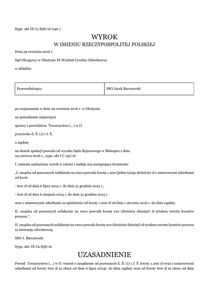 Sygn. akt IX Ca 858/16 (upr.) WYROK W IMIENIU RZECZYPOSPOLITEJ POLSKIEJ Dnia 29 września 2016 r. Sąd Okręgowy w Olsztynie IX Wydział Cywilny Odwoławczy w składzie: Przewodniczący: SSO Jacek Barczewski po rozpoznaniu w dniu 29 września 2016 r. w Olsztynie na posiedzeniu niejawnym sprawy z powództwa Towarzystwa (...) w O. przeciwko E. Š. (1) i J. Š. o zapłatę na skutek apelacji powoda od wyroku Sądu Rejonowego w Biskupcu z dnia 24 czerwca 2016 r., sygn. akt I C 152/16 I. zmienia zaskarżony wyrok w całości i nadaje mu następujące brzmienie: „I. zasądza od pozwanych solidarnie na rzecz powoda kwotę 1.200 (jeden tysiąc dwieście) zł z ustawowymi odsetkami od kwot: - 600 zł od dnia 6 lipca 2014 r. do dnia 31 grudnia 2015 r., - 600 zł od dnia 6 sierpnia 2014 r. do dnia 31 grudnia 2015 r. oraz z ustawowymi odsetkami za opóźnienie od kwoty 1.200 zł od dnia 1 stycznia 2016 r. do dnia zapłaty, II. zasądza od pozwanych solidarnie na rzecz powoda kwotę 210 (dwieście dziesięć) zł tytułem zwrotu kosztów procesu.”, II. zasądza od pozwanych solidarnie na rzecz powoda kwotę 210 (dwieście dziesięć) zł tytułem zwrotu kosztów procesu za instancję odwoławczą. SSO J. Barczewski Sygn. akt: IX Ca 858/16 UZASADNIENIE Powód Towarzystwo (...) w O. wniósł o zasądzenie od pozwanych E. Š. (1) i J. Š. kwoty 1.200 zł wraz z ustawowymi odsetkami od kwoty 600 zł za okres od dnia 6 lipca 2014r. do dnia zapłaty oraz od kwoty 600 zł za okres od dnia 6 sierpnia 2014r. do dnia zapłaty od dnia wniesienia pozwu do dnia zapłaty oraz zasądzenia od pozwanych na rzecz powoda zwrotu kosztów procesu. W uzasadnieniu wskazał, iż zawarł z pozwanymi umowę o naukę dziecka E. Š.. Zgodnie z postanowieniami umowy pozwani zobowiązani byli uiszczać opłatę miesięczną za naukę dziecka w wysokości po 600 zł miesięcznie, płatną z góry do 5-go każdego miesiąca. Pomimo upływu terminu do uiszczenia opłat, pozwani nie uiścili wymagalnych sum za miesiąc lipiec i sierpień 2014r. Nakazem zapłaty wydanym w postępowaniu upominawczym przez Sąd Rejonowy w Biskupcu w dniu 8 lutego 2016 toku w sprawie o sygn. akt I Nc 53/16 uwzględniono roszczenie pozwu. Pozwani złożyli sprzeciw od ww. nakazu zapłaty wnosząc o oddalenie powództwa oraz o zasądzenie od powoda na ich rzecz kosztów postępowania. W ocenie pozwanych zapis umowy z dnia 13 maja 2014 r., na mocy którego powód dochodzi zapłaty czesnego za naukę za miesiąc lipiec i sierpień 2014 r., w sytuacji kiedy dziecko ukończyło naukę nie w danej klasie ale w szkole w czerwcu 2014 r., nie wiąże ich, albowiem jako klauzula niedozwolona jest niegodny z art. 3851§1 k.p.c. Wyrokiem z dnia 24 czerwca 2016r. Sąd Rejonowy w Biskupcu w sprawie I C 152/16 w pkt 1 oddalił powództwo w całości; w pkt 2 zasądził od powoda na rzecz pozwanych solidarnie kwotę 197 zł tytułem zwrotu kosztów zastępstwa procesowego. Sąd ten ustalił że w maju 2011r. E. Š. (1) i J. Š., podpisali z Towarzystwem (...)(...)w O. umowę o naukę swej córki w niepublicznej szkole tj. gimnazjum społecznym. Zgodnie umową przez okres dwóch lat tj. po zakończeniu nauki w klasie I i klasie II gimnazjum – opłacali oni czesne za miesiące wakacyjne. W dniu 14 maja 2013 roku została zawarta miedzy stronami umowa o naukę ich córki E. Š. (2) w III klasie gimnazjum w roku szkolnym 2013/2014 na czas określony do dnia 31 sierpnia 2014 r. umowa. Zgodnie z zapisem § 3 pkt 2 umowy opiekunowie zobowiązali się w trakcie trwania niniejszej umowy do opłacania czesnego za każdy miesiąc raku szkolnego trwającego do 1 września 2013r. do 31 sierpnia 2014r. czesnego w wysokości 600 zł , płatnego do dnia 5-tego każdego miesiąca z góry. E. Š. (1) i J. Š. nie mieli możliwości negocjacji umowy. W dniu 27 czerwca 2014r. E. S. utrzymała świadectwo ukończenia Gimnazjum (...) nr (...) w O.. Z ustaleń Sądu wynika, że pismem z dnia 14 listopada 2015r. E. Š. (1) i J. Š. poinformowali Dyrektora (...) Szkoły (...) w O., iż otrzymali telefoniczną informację o zaleganiu czesnego za córkę E. Š., wskazując jednocześnie, z według nich czesnego za miesiąc lipiec i sierpień w sytuacji kiedy córka ukończyła naukę w szkole w czerwcu 2014 roku jest niezgodne z prawem. Pismem z dnia 23 grudnia 2015r. pełnomocnik powoda fachowy wezwał E. Š. (1) i J. Š. do zapłaty należności za miesiąc lipiec i sierpień 2014r., wskazując, iż ich córka pozostawała uczniem szkoły do 31 sierpnia 2014r. Pismem z dnia 5 stycznia 2016r. pełnomocnik pozwanych poinformował Towarzystwo (...) (...) w O., iż odmawiają oni zapłaty kwoty 1.200 zł jako należności za czesne z miesiąc lipiec i sierpień 2014 r., albowiem w żądanie zapłaty za miesiące wakacyjne w sytuacji ukończenia szkoły jest niedozwolone. Mając tak ustalony stan faktyczny Sąd uznał, że powództwo nie zasługiwało na uwzględnienie. Sąd Rejonowy wskazał, iż podstawą orzekania w przedmiotowej sprawie był art. 3851 k.c. który, pozwala na uznanie za niedozwolone takiego postanowienia wzorca umowy, który kształtuje prawa i obowiązki konsumenta w sposób sprzeczny z dobrymi obyczajami, rażąco naruszając jego interesy. W takim wypadku, postanowienia podlegające kontroli na podstawie art. 385 1 k.c. są postanowieniami zgodnymi z prawem, lecz właśnie ze względu na dodatkowe przesłanki wskazane w tym przepisie, są uznawane za niedozwolone i w konsekwencji niewiążące konsumenta. W ocenie Sądu powodowi można przypisać miano przedsiębiorcy w oparciu o § 4 pkt lit a ustawy z dnia 16 lutego 2007 roku o ochronie konkurencji i konsumentów, zgodnie z którym przedsiębiorcą w rozumieniu ustawy jest nie tylko przedsiębiorca w rozumieniu przepisów o swobodzie dzielności gospodarczej , ale również jest nim osoba fizyczna, osoba prawna a także jednostka organizacyjna mniemająca osobowości prawnej, której ustawa przyznaje zdolność prawną,