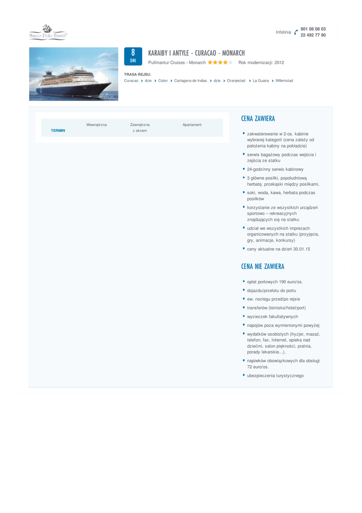 Infolinia 8 KARAIBY I ANTYLE - CURACAO - MONARCH DNI Pullmantur Cruises - Monarch 801 08 08 03 22 492 77 90 | Rok modernizacji: 2012 TRASA REJSU: Curacao Wewnętrzna TERMIN dzie Zewnętrzna z oknem Colon Cartagena de Indias Apartament dzie Oranjestad La Guaira Willemstad CENA ZAWIERA zakwaterowanie w 2-os. kabinie wybranej kategorii (cena zależy od położenia kabiny na pokładzie) serwis bagażowy podczas wejścia i zejścia ze statku 24-godzinny serwis kabinowy 3 główne posiłki, popołudniową herbatę, przekąski między posiłkami, soki, woda, kawa, herbata podczas posiłków korzystanie ze wszystkich urządzeń sportowo – rekreacyjnych znajdujących się na statku udział we wszystkich imprezach organizowanych na statku (przyjęcia, gry, animacje, konkursy) ceny aktualne na dzień 30.01.15 CENA NIE ZAWIERA opłat portowych 190 euro/os. dojazdu/przelotu do portu ew. noclegu przed/po rejsie transferów (lotnisko/hotel/port) wycieczek fakultatywnych napojów poza wymienionymi powyżej wydatków osobistych (fryzjer, masaż, telefon, fax, Internet, opieka nad dziećmi, salon piękności, pralnia, porady lekarskie...), napiwków obowiązkowych dla obsługi 72 euro/os. ubezpieczenia turystycznego