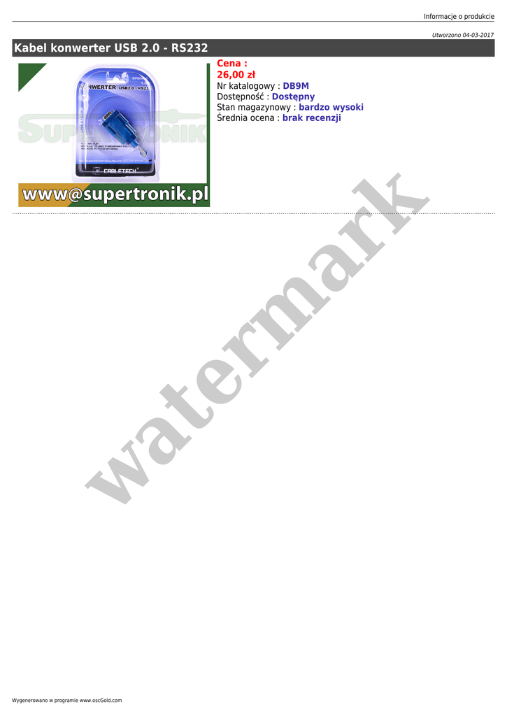 Informacje o produkcie Utworzono 04-03-2017 Kabel konwerter USB 2.0 - RS232 Cena : 26,00 zł w at er m ar k Nr katalogowy : DB9M Dostępność : Dostępny Stan magazynowy : bardzo wysoki Średnia ocena : brak recenzji Wygenerowano w programie www.oscGold.com er m ar k Kabel konwerter USB 2.0 - RS232 Konwerter jest niezastąpionym urządzeniem dla użytkowników komputerów, które nie zostały wyposażone w port szeregowy COM, np. nowsze modele notebooków. Urządzenie tworzy port szeregowy RS232 z portu USB (a nie odwrotnie!). Specyfikacja: -Zgodny z USB2.0 i USB1.1 -Oparty na chipsecie HL340 -Rzeczywista prędkość transmisji do 128kbps -Pełna emulacja portu RS232 (COM) DB9M -Pełna komunikacja dwustronna -Możliwość podłączenia przy włączonym komputerze (Plug & Play) -Długość kabla ok 1m w at Działa m.in. z : kasami fiskalnymi, programatorami (tunery satelitarne, telefony komórkowe , centralki telekomunikacyjne i alarmowe), routerami, urządzeniami diagnostycznymi itd. W komplecie znajduje się płyta CD ze sterownikami dla Windows 98SE/ME/2000/XP i MAC OS9.0/OSX. w at er m ar k Informacje o produkcie Wygenerowano w programie www.oscGold.com