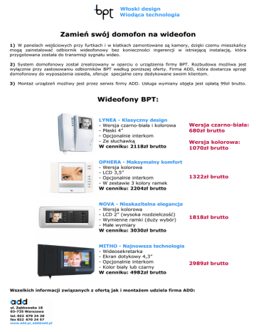 Zamień swój domofon na wideofon 1) W panelach wejściowych przy furtkach i w klatkach zamontowane są kamery, dzięki czemu mieszkańcy mogą zainstalować odbiornik wideofonowy bez konieczności ingerencji w istniejącą instalację, która przygotowana została do transmisji sygnału wideo. 2) System domofonowy został zrealizowany w oparciu o urządzenia firmy BPT. Rozbudowa możliwa jest wyłącznie przy zastosowaniu odbiorników BPT według poniższej oferty. Firma ADD, która dostarcza sprzęt domofonowy do wyposażenia osiedla, oferuje specjalne ceny dedykowane swoim klientom. 3) Montaż urządzeń możliwy jest przez serwis firmy ADD. Usługa wymiany objęta jest opłatą 99zł brutto. Wideofony BPT: LYNEA - Klasyczny design - Wersja czarno-biała i kolorowa - Płaski 4” - Opcjonalnie interkom - Ze słuchawką W cenniku: 2118zł brutto Wersja czarno-biała: 680zł brutto Wersja kolorowa: 1070zł brutto OPHERA - Maksymalny komfort - Wersja kolorowa - LCD 3,5” - Opcjonalnie interkom - W zestawie 3 kolory ramek W cenniku: 2204zł brutto 1322zł brutto NOVA - Nieskazitelna elegancja - Wersja kolorowa - LCD 2” (wysoka rozdzielczość) - Wymienne ramki (duży wybór) - Małe wymiary W cenniku: 3030zł brutto 1818zł brutto MITHO - Najnowsza technologia - Wideosekretarka - Ekran dotykowy 4,3” - Opcjonalnie interkom 2989zł brutto - Kolor biały lub czarny W cenniku: 4982zł brutto Wszelkich informacji związanych z ofertą jak i montażem udziela firma ADD: