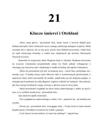 21 Klucze śmierci i Otchłani - Boże, moja głowa - powiedział Alec, kiedy razem z Jace'em uklękli przy skalnej krawędzi, która wieńczyła szczyt szarego, pokrytego piargami wzgórza. Skała trzymała ich w ukryciu, ale za nią, przy użyciu runy Dalekowzroczności, widać było na wpół zniszczoną twierdzę, a wokół niej, skupionych jak mrówki, Mrocznych Nocnych Łowców. Stanowiło to wypaczony obraz Wzgórza Gard w Alicante. Struktura utworzona na szczycie wzniesienia przypominała znane im Gard, jednak wzbogacone o otaczający go masywny mur i zamkniętą w środku twierdzę, jak ogród w klasztorze. - Może nie powinieneś tyle pić wczorajszej nocy - rzucił Jace, pochylając się i mrużąc oczy. Z każdej strony muru Mroczni stali w scentrowanych pierścieniach, a naprzeciw bram, które prowadziły do środka, znajdowała się ich skupiona grupka; w strategicznych punktach na całej długości wzgórza widzieli też mniejsze. Alec patrzył, jak Jace szacuje liczebność wroga, tworząc w głowie coraz to nowy plan. - Może powinieneś wyglądać na nieco mniej zadowolonego z siebie na myśl o tym, co ty zrobiłeś zeszłej nocy - powiedział Alec. Jace omal nie spadł z krawędzi. - Nie wyglądam na zadowolonego z siebie. Cóż, - poprawił się - nie bardziej niż zwykle. - Proszę cię - powiedział Alec, wyciągając stelę. - Twoja twarz to istna otwarta książka porno. Chciałbym wymazać ten widok z pamięci. - Czyli chcesz mi powiedzieć, że mam się zamknąć? - zapytał Jace. - Pamiętasz, jak się ze mnie śmiałeś, że się wymykam z Magnusem i zapytałeś, czy upadłem na szyję? - zapytał Alec, dotykając końcówką steli swojego przedramienia i zaczynając rysować iratze. - To zemsta. Jace prychnął i zabrał Alecowi stelę. - Daj mi to - powiedział i dokończył rysować za niego iratze, jak zwykle w pośpiechu i z rozmachem. Alec poczuł, jak głowa przestaje mu pulsować. Jace ponownie skupił się na wzgórzu. - Wiesz, co jest ciekawe? - odezwał się. - Widziałem kilka latających demonów, ale trzymają się z dala od Mrocznego Gard... Alec uniósł brew. - Mrocznego Gard? - Masz lepszą nazwę? - Jace wzruszył ramionami. - W każdym razie, trzymają się z daleka od Mrocznego Gard i całego wzgórza. Służą Sebastianowi, ale wygląda na to, że szanują jego prywatność. - Cóż, nie mogą być za daleko - powiedział Alec. - Dość szybko znalazły się w Sali Porozumień, kiedy uruchomiłeś ten alarm. - Mogły już być wewnątrz fortecy - powiedział Jace, mówiąc na głos to, o czym obaj myśleli. - Szkoda, że nie udało ci się zabrać skeptronu - wyznał cicho Alec. - Mam wrażenie, że mógłby zdjąć wiele demonów na raz. O ile nadal działa. - Jace miał dziwny wyraz twarzy. Alec dodał pośpiesznie: - Nie, żeby komukolwiek się to udało. Ty próbowałeś... - Nie jestem tego pewien - powiedział Jace z zarówno nieobecnym jak i zamyślonym wyrazem twarzy. - Chodź. Wracajmy do pozostałych. Nie zdążył odpowiedzieć; Jace już się oddalał. Alec udał się za nim, czołgając się do tyłu, tak aby znaleźć się poza zasięgiem Mrocznego Gard. Kiedy byli już w pewnej odległości od krawędzi, wyprostowali się i na wpół ześlizgnęli po piagrowym stoku to miejsca, w którym czekała na nich reszta. Simon był przy Izzy, a Clary, ze szkicownikiem na kolanach i długopisem w dłoni, rysowała runy. Wnioskując ze sposobu, w jaki kręciła głową, wyrywając z notesu kartki, by następnie zgnieść je w dłoni, nie szło jej za dobrze. - Śmiecisz? - zawołał Jace, kiedy razem z Alekiem podbiegli do pozostałej trójki. Clary posłała mu spojrzenie, które prawdopodobnie miało być miażdżące, ale wyszło raczej ckliwie. Jace je odwzajemnił. Alec zastanowił się, co by się stało, jeśli oddałby się w ręce mrocznych bogów tego świata w zamian za to, by nie upominano go stale, że jest singlem. Nie tylko singlem. On nie tylko tęsknił za Magnusem; bał się o niego, a ten strach odczuwał w klatce piersiowej jako silny, stały ból, który nie chciał zelżeć. - Jace, z tego świata został już tylko popiół i nie ma tu żadnej żywej istoty powiedziała Clary. - Jestem niemal pewna, że tu nikt się nie zajmuje recyklingiem. - Co widzieliście? - zapytała ostro Isabelle. Nie podobało jej się, że została na miejscu, podczas gdy Alec z Jace’em zrobili rozpoznanie, ale Alec nalegał, żeby oszczędzała siły. Ostatnio coraz częściej go słuchała, pomyślał Alec, a słuchała tylko tych ludzi, których zdanie szanowała. To było miłe. - Tutaj - Jace wyciągnął stelę z kieszeni i ukląkł, zrzucając z ramion kurtkę. Mięśnie jego pleców poruszały się pod koszulką, kiedy zaczął rysować szpiczastym czubkiem steli po piasku. - Tutaj jest Mroczne Gard. Prowadzi do niego tylko jedna droga, a biegnie ona przez bramę w najdalszej części muru. Jest zamknięta, ale runa Otwierająca powinna załatwić sprawę. Pytanie brzmi: jak dostać się do bramy. Najbardziej strzeżone punkty znajdują się tutaj, tutaj i tutaj. - Machnął stelą. - Dlatego obejdziemy wzgórze i wejdziemy po jego drugiej stronie. Jeśli to miejsce topograficznie odpowiada Alicante, a wygląda na to, że tak jest, to tam znajduje się ścieżka. Kiedy podejdziemy bliżej, rozdzielimy się tu i tutaj… - zrobił stelą parę zawijasów i szlaczków, pomiędzy jego łopatkami zaczął wykwitać pot - i spróbujemy zagonić w stronę centrum tylu Mrocznych i tyle demonów, ile będziemy w stanie. Odchylił się, przygryzając ze zmartwieniem wargę. - Mogę się nimi zająć, ale musicie w tym samym czasie pilnować, żeby się nie rozdzielały. Rozumiecie ten plan? Wszyscy przez moment patrzyli na niego w milczeniu. Nagle Simon wskazał na szkic. - Co to za zawijas? - zapytał. - Drzewo? - To jest brama - powiedział Jace. - Ochh - powiedziała Isabelle, zadowolona. - A te szlaczki? To fosa? - To jest zarys t