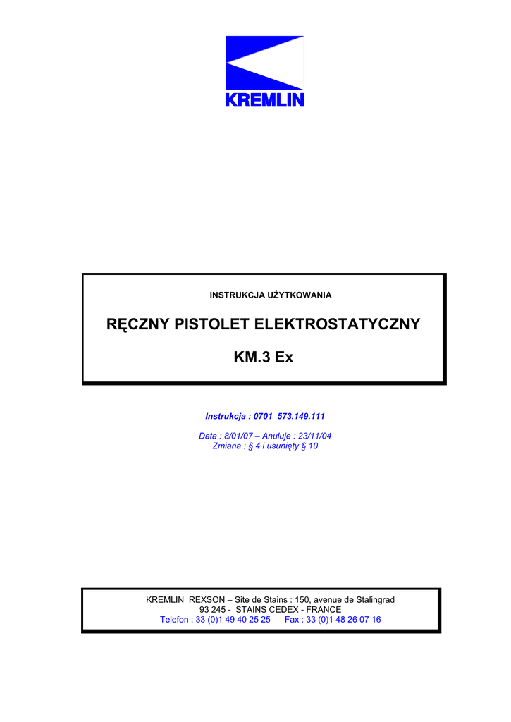 INSTRUKCJA UŻYTKOWANIA RĘCZNY PISTOLET ELEKTROSTATYCZNY KM.3 Ex Instrukcja : 0701 573.149.111 Data : 8/01/07 – Anuluje : 23/11/04 Zmiana : § 4 i usunięty § 10 KREMLIN REXSON – Site de Stains : 150, avenue de Stalingrad 93 245 - STAINS CEDEX - FRANCE Telefon : 33 (0)1 49 40 25 25 Fax : 33 (0)1 48 26 07 16 INSTRUKCJA UŻYTKOWANIA RĘCZNY PISTOLET ELEKTROSTATYCZNY KM.3 Ex SPIS TREŚCI 1. DEKLARACJA ZGODNOŚCI UE ............................................................ Błąd! Nie zdefiniowano zakładki. 2. PRZEPISY BEZPIECZEŃSTWA.............................................................. Błąd! Nie zdefiniowano zakładki. 3. ZASADA DZIAŁANIA............................................................................... Błąd! Nie zdefiniowano zakładki. 4. SPECYFIKACJA ...................................................................................... Błąd! Nie zdefiniowano zakładki. 5. INSTALACJA ............................................................................................................................................. 8 6. URUCHOMIENIE ...................................................................................................................................... 10 7. CODZIENNA KONSERWACJA ............................................................................................................... 11 8. DEFEKTY I KONTROLE ELEKTRYCZNE .............................................................................................. 13 9. KONSERWACJA ..................................................................................................................................... 15 CZĘŚCI ZAMIENNE : ZESPÓŁ PISTOLETÓW KM.3 Ex PISTOLET KMP 3 Ex PISTOLET KMV 3 Ex PISTOLET KMC 3 Ex PISTOLET KMX 3 Ex KREMLIN REXSON Strona 1 (Dok. 573.163.050) (Dok. 573.164.050) (Dok. 573.165.050) (Dok. 573.166.050) (Dok. 573.167.050) Instrukcja : 573.149.111 Drogi Kliencie, Właśnie nabyłeś swój nowy ręczny pistolet elektrostatyczny i dziękujemy Ci za to. Dołożyliśmy najlepszych starań, od projektowania po produkcję, aby ta inwestycja dała Ci całkowitą satysfakcję. Gdyby jednak ten sprzęt nie odpowiadał twoim oczekiwaniom, nie wahaj się skontaktować z KREMLIN ASSISTANCE. Celem dobrego użytkowania i optymalnej gotowości do użytku, gorąco doradzamy uważne przeczytanie niniejszej instrukcji przed eksploatacją Twojego sprzętu. 1. DEKLARACJA ZGODNOŚCI UE Producent : KREMLIN REXSON z kapitałem 6 720 000 Euro Siedziba : 150, avenue de Stalingrad 93 245 - STAINS CEDEX - FRANCE Tel. 01.49.40.25.25 - Fax : 01.48.26.07.16 Deklaruje, że dalej opisana maszyna : Pistolet do farby typu KM.3 jest zgodna z następującymi dyspozycjami : CE - Dyrektywa Maszyny (dyrektywa 98/37/CE) i przepisami przyjętymi do jej transpozycji. CE - Dyrektywa Kompatybilności Elektromagnetycznej (dyrektywa 89/336/CE). Ex - Dyrektywa ATEX (Dyrektywa 94/9/CE) : II 2 G (grupa II, kategoria 2, gaz). Normy Europejskie harmonizowane : EN 50 050-2000, EN 50 014+A1+A2-1997, EN 50 019-2000, EN 50 028-1987 Świadectwo kontroli CE typu INERIS 03ATEX0026 X Wydane przez : INERIS 0080 – 60550 Verneuil-en-Halatte - FRANCE Certyfikat zgodności FTZÚ 99 Ex 0158 X (Republika czeska). Certyfikat zgodności ENTELA 000 7065 493 (Canada) - Modèle KMX3.Ex Stains, 1 lipca 2003, Daniel TRAGUS Dyrektor Generalny PRZEPISY BEZPIECZEŃSTWA 1- Ten sprzęt może być niebezpieczny, jeżeli nie będzie używany zgodnie z zasadami podanymi w tej instrukcji. 23- Personel używający tego sprzętu elektrostatycznego musi być przeszkolony w jego użytkowaniu. Przełożony warsztatu musi upewnić się, że personel doskonale zrozumiał zasady bezpieczeństwa i że je stosuje. Te zasady dotyczą, z jednej strony przedsięwziętych środków ostrożności przy rozpylaniu farb rozpuszczalnikowych, a z drugiej strony, szczególnych środków ostrożności związanych z użytkowaniem sprzętu działającego pod wysokim napięciem. Lokalne przepisy bezpieczeństwa mogą poszerzyć ogólne przepisy ochrony i bezpieczeństwa. Skonsultować je. UWAGA : nie przestrzeganie zasad ogólnych i zasad następujących może spowodować problemy funkcjonowania i stworzyć warunki niebezpieczne. KREMLIN REXSON Strona 2 Instrukcja : 573.149.111 INSTALACJA Norma EN 50 053 definiuje zasady wyboru, instalacji i użytkowania sprzętów projekcji elektrostatycznej dla produktów łatwopalnych. Część 1 tej normy stosuje się do pistoletów ręcznych elektrostatycznej projekcji farby. Pistolet KM.3 Ex jest pistoletem wyłącznie zarezerwowanym do aplikacji farb i lakierów. 45- 6- 7- Rozpylanie farby, jak też czyszczenie musi być wykonywane w miejscu odpowiednio wentylowanym. Obudowa zasilania musi znajdować się poza strefą rozpylania (poza strefą niebezpieczną w terminologii bezpieczeństwa). Ponadto, musi być zachowane przynajmniej 4 metry do wszystkich źródeł łatwopalnych oparów (szczególnie rozpuszczalników). Podłączyć zacisk masy obudowy do uziemienia. Wszystkie części metalowe (pompy farby, pojemniki, taborety, narzędzia, etc …) znajdujące się bliżej niż 3 metry od pistoletu, kategorycznie muszą być podłączone do niezawodnego uziemienia. Nigdy nie składować farby i rozpuszczalników blisko od lub w strefie rozpylania. Zawsze zamykać puszki i pojemniki. Używać farb, których temperatura zapłonu jest możliwie najwyższa, szczególnie wyższa od temperatury otoczenia. Zachować strefę rozpylania w czystości. Eliminować wszystkie niepotrzebne przedmioty. Podłoga musi pozostawać wystarczająco przewodząca. Nie przykrywać jej produktami izolującymi (maks. oporność w stosunku do ziemi : 1 M według EN 50 053-7-2). 10 - Wywieszka bezpieczeństwa dostarczona w walizeczce musi być wywieszona w miejscu widocznym w kabinie malarskiej. 89- ROZPYLANIE 11 - Nigdy nie celować pistoletem w kierunku innej osoby. 12 - Nigdy nie rzucać ani pozwolić upaść pistoletowi elektrostatyczn