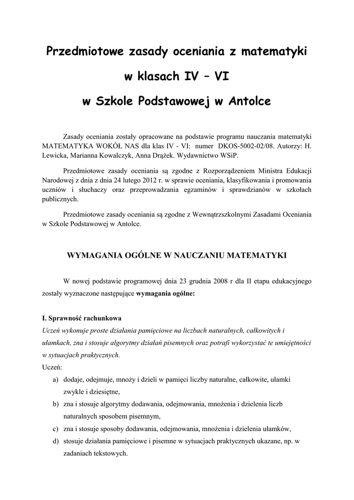 Przedmiotowe zasady oceniania z matematyki w klasach IV – VI w Szkole Podstawowej w Antolce Zasady oceniania zostały opracowane na podstawie programu nauczania matematyki MATEMATYKA WOKÓŁ NAS dla klas IV - VI: numer DKOS-5002-02/08. Autorzy: H. Lewicka, Marianna Kowalczyk, Anna Drążek. Wydawnictwo WSiP. Przedmiotowe zasady oceniania są zgodne z Rozporządzeniem Ministra Edukacji Narodowej z dnia z dnia 24 lutego 2012 r. w sprawie oceniania, klasyfikowania i promowania uczniów i słuchaczy oraz przeprowadzania egzaminów i sprawdzianów w szkołach publicznych. Przedmiotowe zasady oceniania są zgodne z Wewnątrzszkolnymi Zasadami Oceniania w Szkole Podstawowej w Antolce. WYMAGANIA OGÓLNE W NAUCZANIU MATEMATYKI W nowej podstawie programowej dnia 23 grudnia 2008 r dla II etapu edukacyjnego zostały wyznaczone następujące wymagania ogólne: I. Sprawność rachunkowa Uczeń wykonuje proste działania pamięciowe na liczbach naturalnych, całkowitych i ułamkach, zna i stosuje algorytmy działań pisemnych oraz potrafi wykorzystać te umiejętności w sytuacjach praktycznych. Uczeń: a) dodaje, odejmuje, mnoży i dzieli w pamięci liczby naturalne, całkowite, ułamki zwykle i dziesiętne, b) zna i stosuje algorytmy dodawania, odejmowania, mnożenia i dzielenia liczb naturalnych sposobem pisemnym, c) zna i stosuje sposoby dodawania, odejmowania, mnożenia i dzielenia ułamków, d) stosuje działania pamięciowe i pisemne w sytuacjach praktycznych ukazane, np. w zadaniach tekstowych. II. Wykorzystanie i tworzenie informacji Uczeń interpretuje i przetwarza informacje tekstowe, liczbowe, graficzne, rozumie i interpretuje odpowiednie pojęcia matematyczne, zna podstawową terminologię, formułuje odpowiedzi i prawidłowo zapisuje wyniki. Uczeń: a) rozwiązuje zadania tekstowe, odczytując niezbędne informacje i dostrzegając zależności między nimi, b) rozwiązuje zadania na podstawie informacji zawartych w tekście, w tabelce, na diagramie, c) rozumie poznane własności liczb i fakty matematyczne i stosuje je w zadaniach, d) używa prostego języka matematycznego, e) formułuje odpowiedzi adekwatne do pytań postawionych w zadaniu, f) formułuje wnioski oparte na rozumowaniu związanym z rozwiązaniem zadania, g) zbiera informacje w celu wykorzystania ich do rysowania diagramów, h) układa pytania lub zadania tekstowe do podanych informacji. III. Modelowanie matematyczne Uczeń dobiera odpowiedni model matematyczny do prostej sytuacji, stosuje poznane wzory i zależności, przetwarza tekst zadania na działania arytmetyczne i proste równania. Uczeń: a) opisuje proste sytuacje zadaniowe za pomocą wyrażenia algebraicznego, b) opisuje tekst zadania za pomocą równania i rozwiązuje go, c) zamienia treść zadania na działania arytmetyczne prowadzące do jego rozwiązania, d) ocenia wynik zadania w kontekście założeń rozwiązywanego problemu, e) zamienia informacje wyrażone w jednej postaci w inną postać, f) rozumie i stosuje podaną ilustrację, ułatwiającą rozwiązanie zadania. IV. Rozumowanie i tworzenie strategii Uczeń prowadzi proste rozumowanie składające się z niewielkiej liczby kroków, ustala kolejność czynności (w tym obliczeń) prowadzących do rozwiązania problemu, potrafi wyciągnąć wnioski z kilku informacji podanych w różnej postaci. Uczeń: a) układa plan rozwiązania zadania składający się z kilku kroków i realizuje ten plan, rozwiązując problem, b) wyciąga wnioski wynikające z podanych w różny sposób informacji, c) szacuje otrzymane wyniki, d) prowadzi proste rozumowanie odwołujące się do definicji pojęcia. I. PRZEDMIOTEM OCENY Z MATEMATYKI SĄ: 1. Wiedza. 2. Umiejętności. 3. Postawy. II. FORMY AKTYWNOŚCI PODLEGAJĄCE OCENIE: Ocenie podlegają następujące formy aktywności ucznia: 1. Odpowiedzi ustne – ustne wypowiedzi w zakresie materiału z poprzednich lekcji (także udział w dyskusji, dialog, argumentowanie, wnioskowanie) 2. Prace pisemne w klasie: a) zadanie klasowe - zapowiedziane z tygodniowym wyprzedzeniem, czas trwania – 1 godzina lekcyjna, b) sprawdzian - zapowiedziany z trzydniowym wyprzedzeniem, czas trwania do 30 minut, c) kartkówka - dotyczy materiału z 3 ostatnich tematów zagadnień, może być przeprowadzona bez zapowiedzi; czas trwania do 20 minut; d) krótka kartkówka („pięciominutówka”), dotyczy materiału z ostatniej lekcji, może być niezapowiedziana, czas trwania do 5 minut, 3. Praca ucznia na lekcji: a) aktywność na lekcji, przygotowanie do zajęć - zgłaszanie się w czasie lekcji, udzielanie odpowiedzi na pytania dotyczące lekcji, rozwiązywanie zadań i problemów, wyposażenie w potrzebne przybory i materiały, b) praca w grupach - organizacja pracy w grupie, komunikacja w grupie, zaangażowanie, sposób prezentacji, efekty pracy, c) samodzielna praca na lekcji – samodzielna praca ucznia z kartami pracy. 4. Praca domowa. 5. Zadania dodatkowe - zlecone przez nauczyciela prace samodzielne do wykonania w domu. 6. Prowadzenie zeszytu i zeszytu ćwiczeń. 7. Prace praktyczne – wykonywanie modeli figur przestrzennych, prace z origami, itp. 8. Projekty. 9. Aktywność pozalekcyjna: a) aktywny udział w zajęciach kółka matematycznego, b) udział w konkursach matematycznych 10. Badanie wyników nauczania, sprawdziany próbne i zewnętrzne – przeprowadzane są zgodnie z planem nadzoru pedagogicznego i podawane do wiadomości uczniów i rodziców na początku roku szkolnego. III. METODY I SPOSOBY OCENIANIA WIADOMOŚCI I UMIEJĘTNOŚCI 1. Odpowiedzi ustne 1. Sprawdzenie wiadomości i umiejętności ucznia w formie ustnej odpowiedzi z ostatniej lekcji bądź w zakresie bieżącego (aktualnie przerabianego) działu matematyki. Pytania mogą dotyczyć także wiadomości i umiejętności z całego roku. 2. Uczeń jest oceniany z odpowiedzi ustnej co najmniej 1 raz w każdym półroczu. 3. Termin odpowiedzi nie jest podawany do wiadomości ucznia. 4. Uczeń ma czas na zastanow